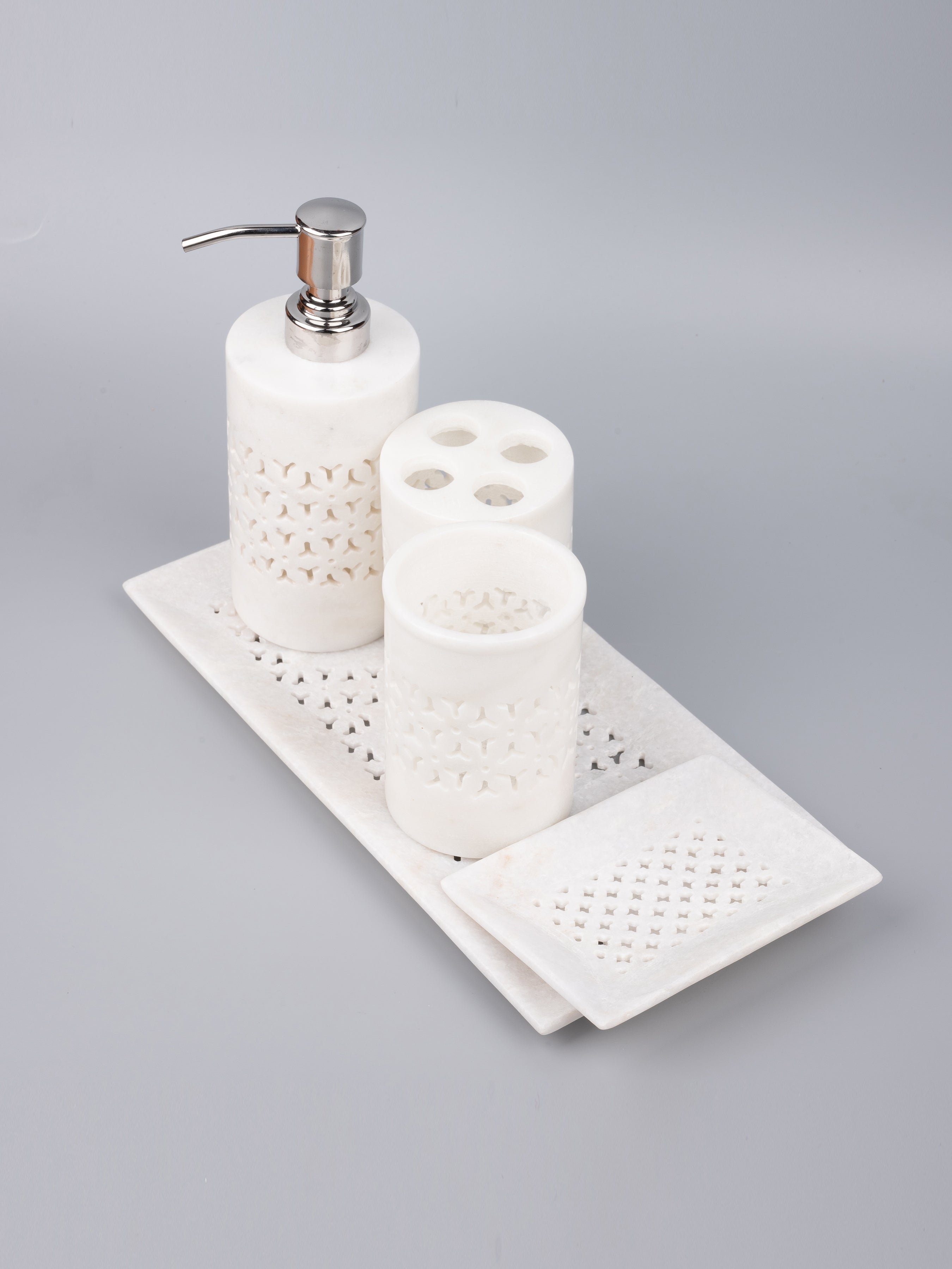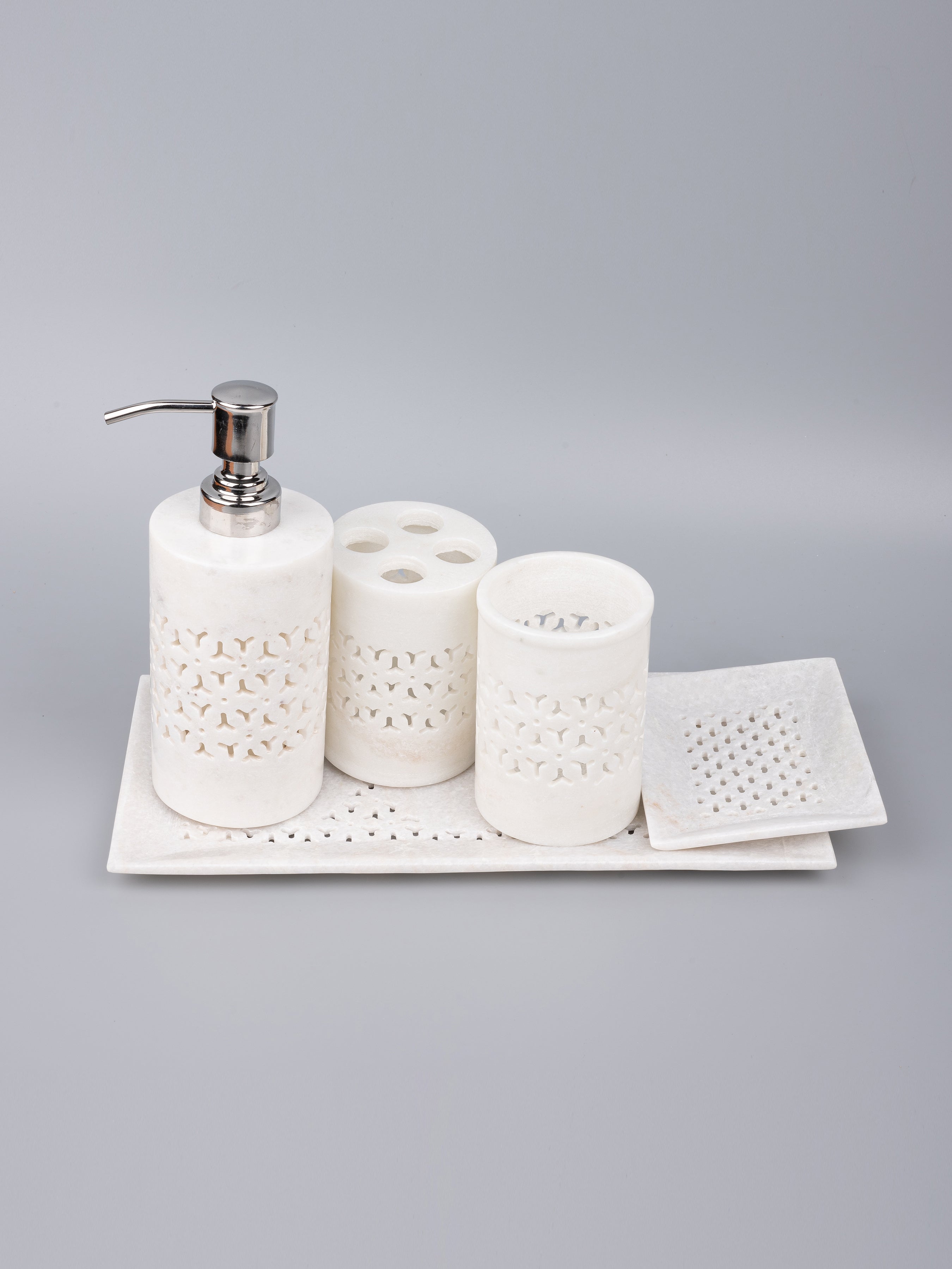 Outfit your bathroom with this premium bathroom accessories set handcrafted from premium white marble. Apart from organizing your toiletries it will also give a royal and pleasant look to the bathroom.