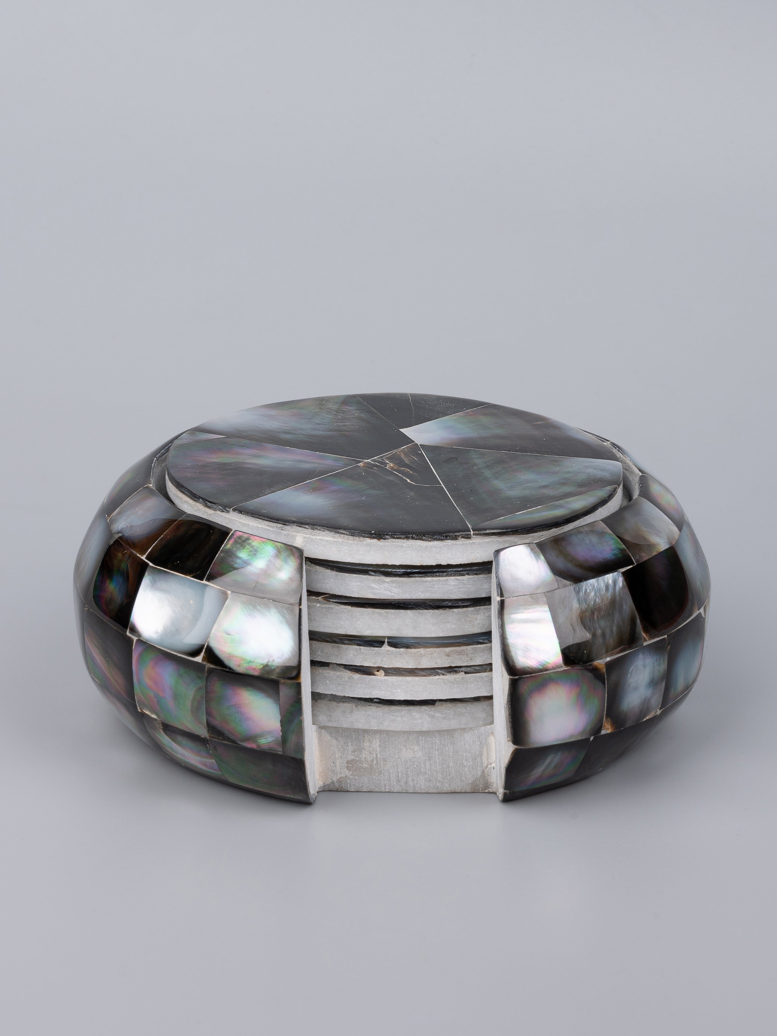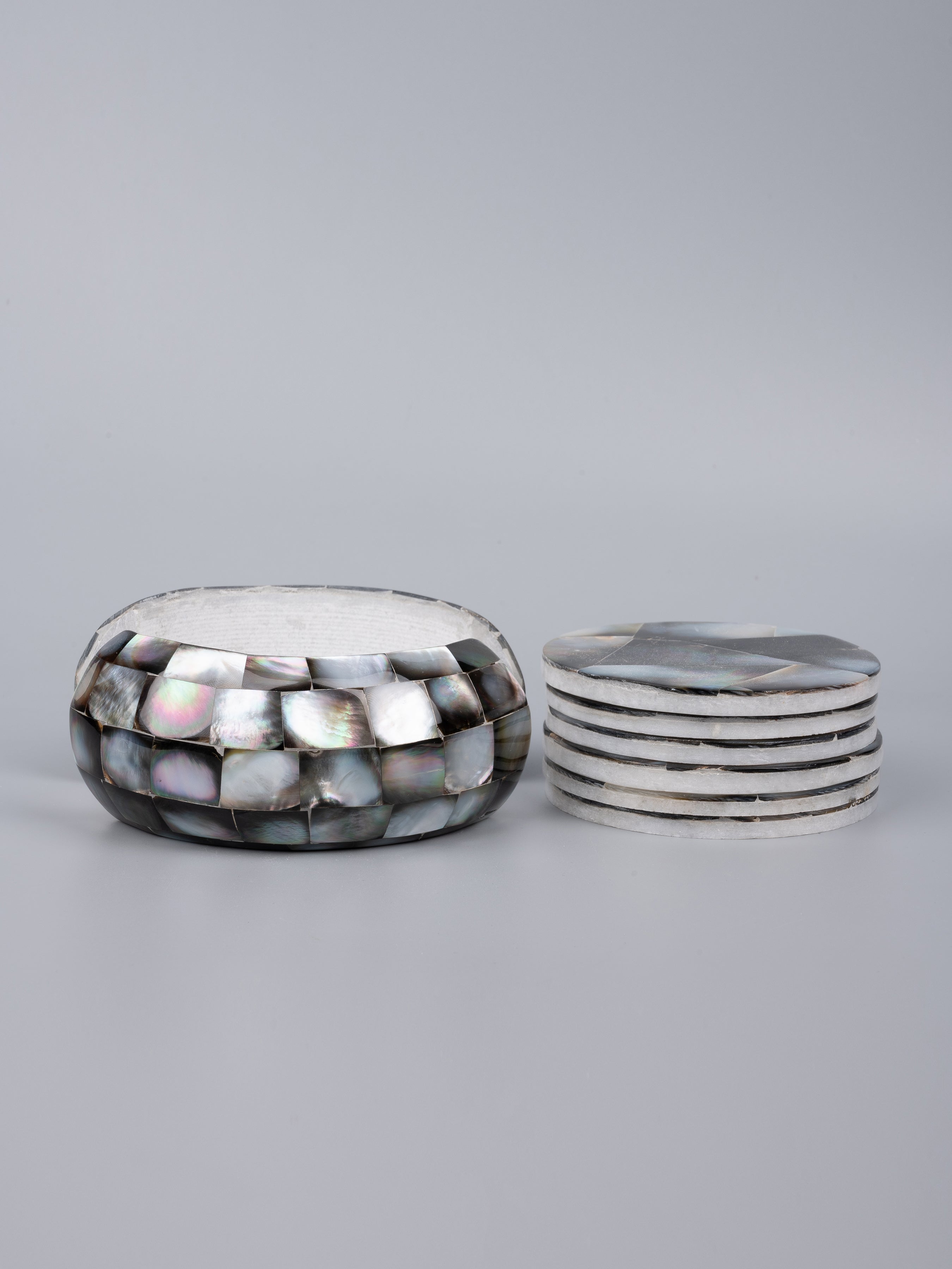 Set of six coasters and a holder, this product is shaped out of marble and overlaid with authentic mother of pearl shells. The vibrant colored shells enriches the visual appeal of the coasters.