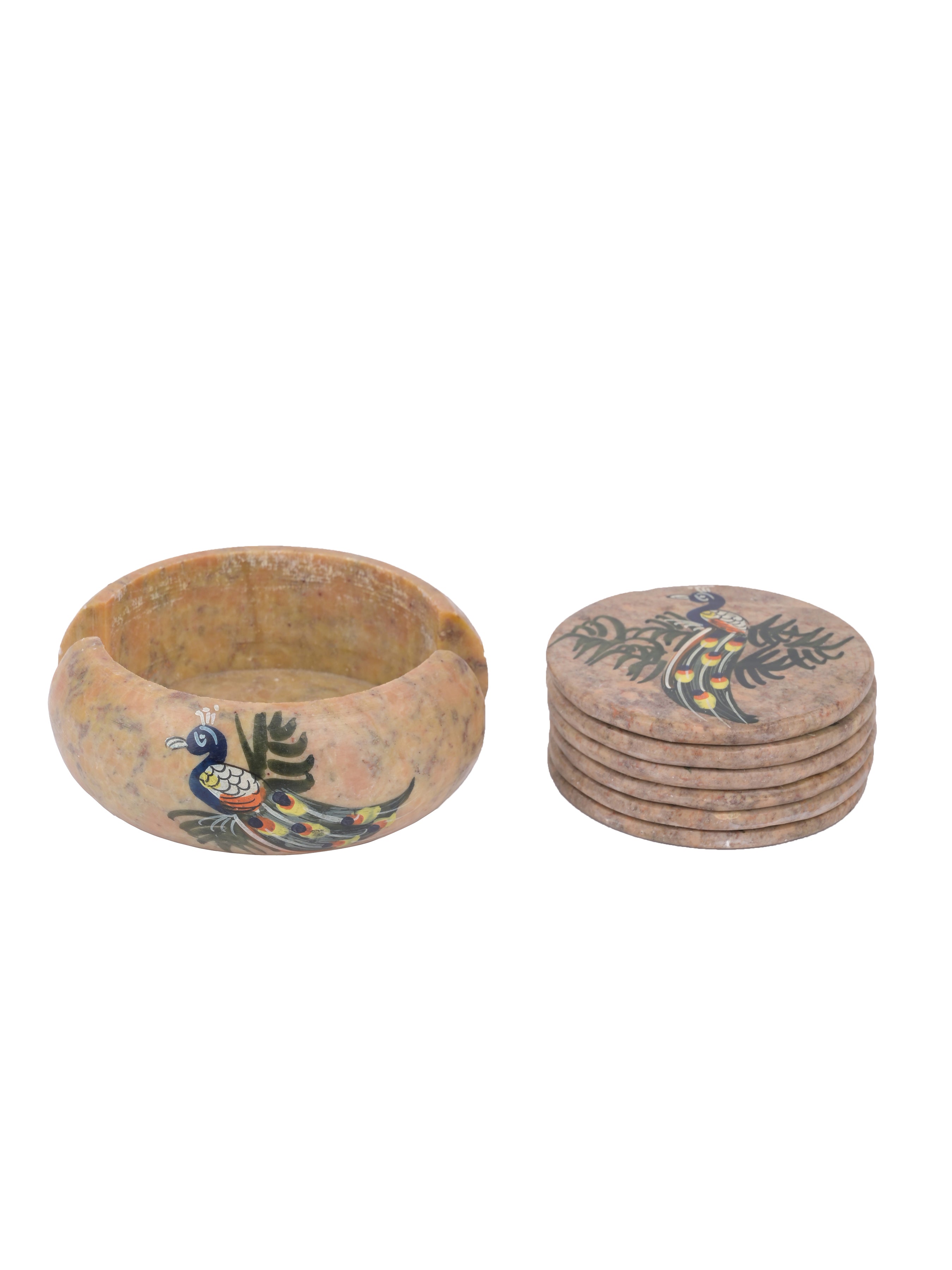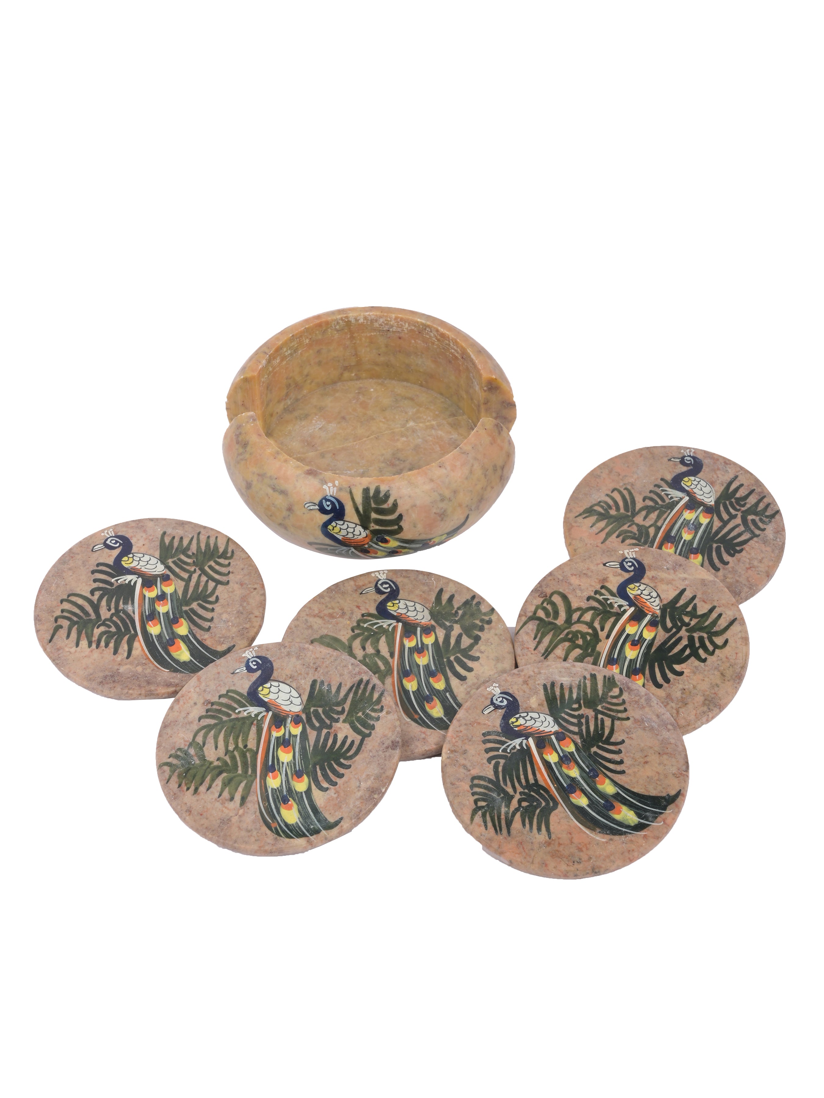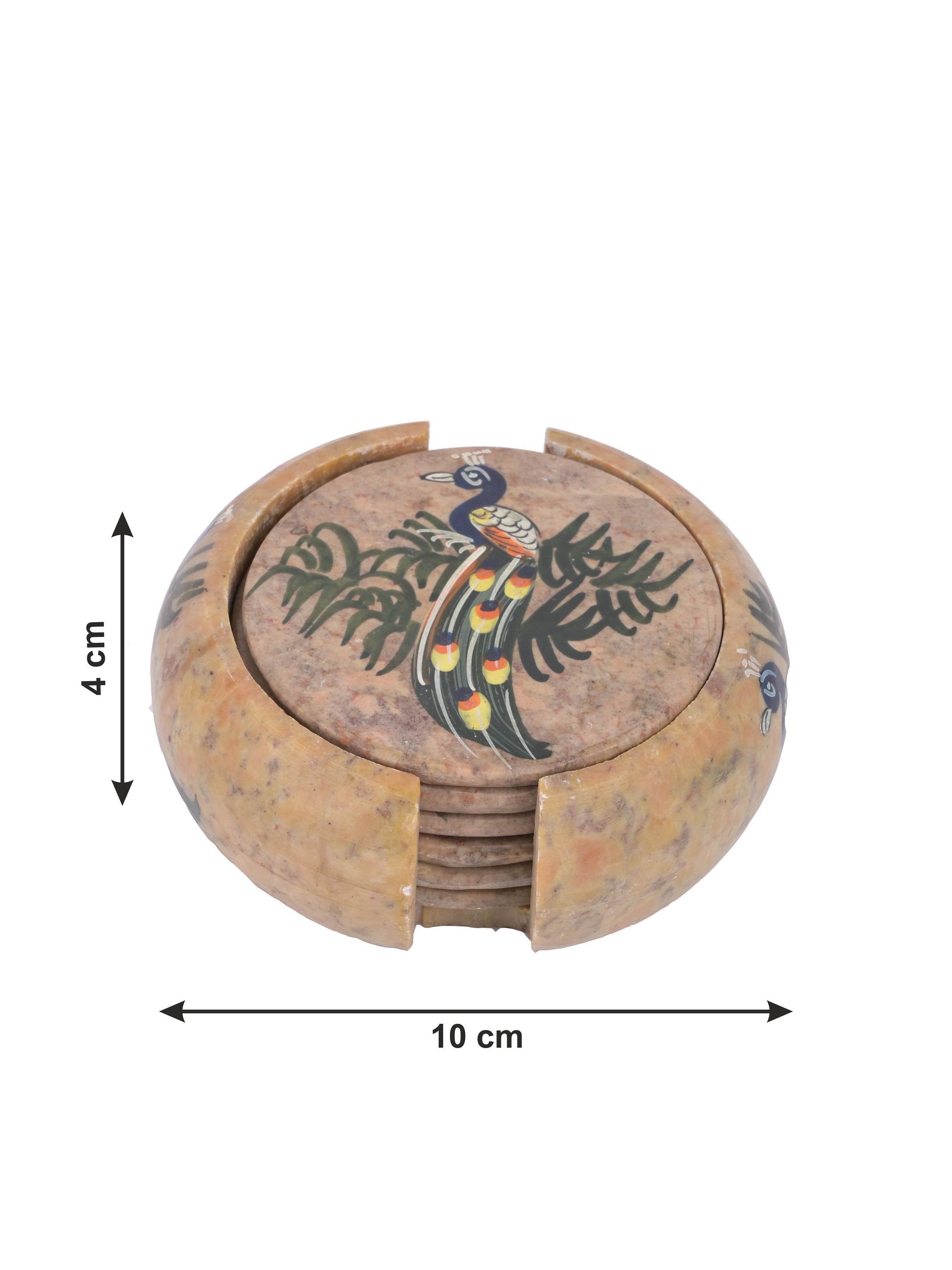 Protect the surface from liquids and add a touch of beauty to your table with this set of 6 coasters. Colorful motif over the yellow stone & its alluring pattern, the set is sure to fetch you compliments from your guests.