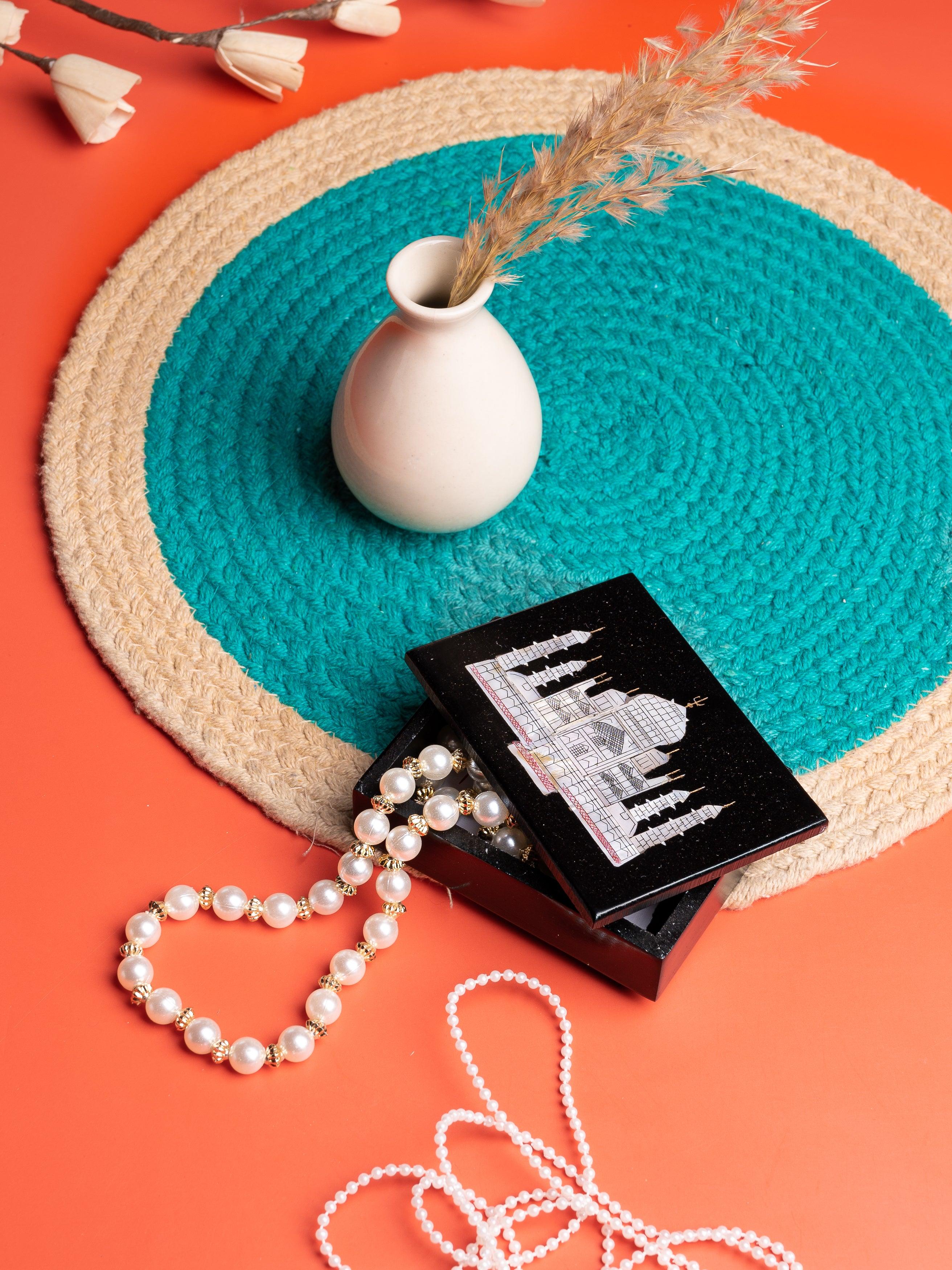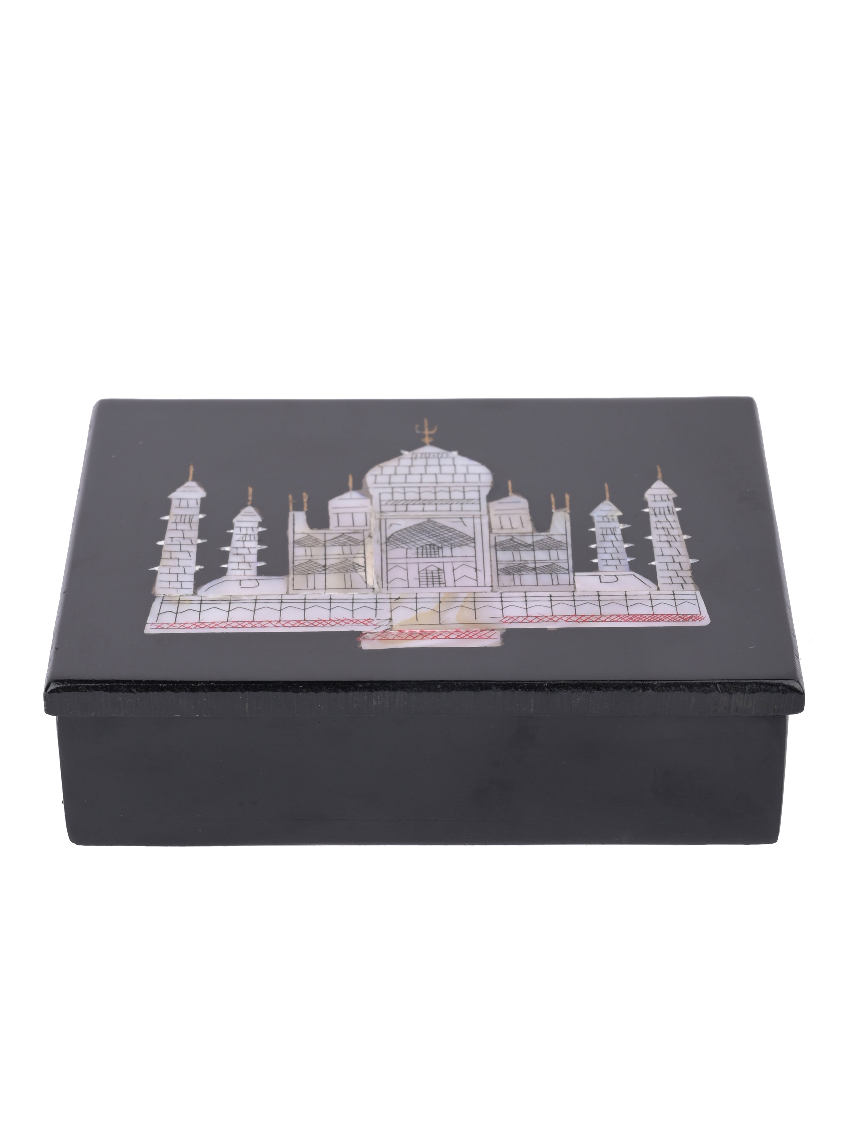 Small but unique piece of art made with black marble stone and Taj Mahal design inlaid on top. It can be used as a décor item or a multipurpose storage box for rings, earring and cufflinks.