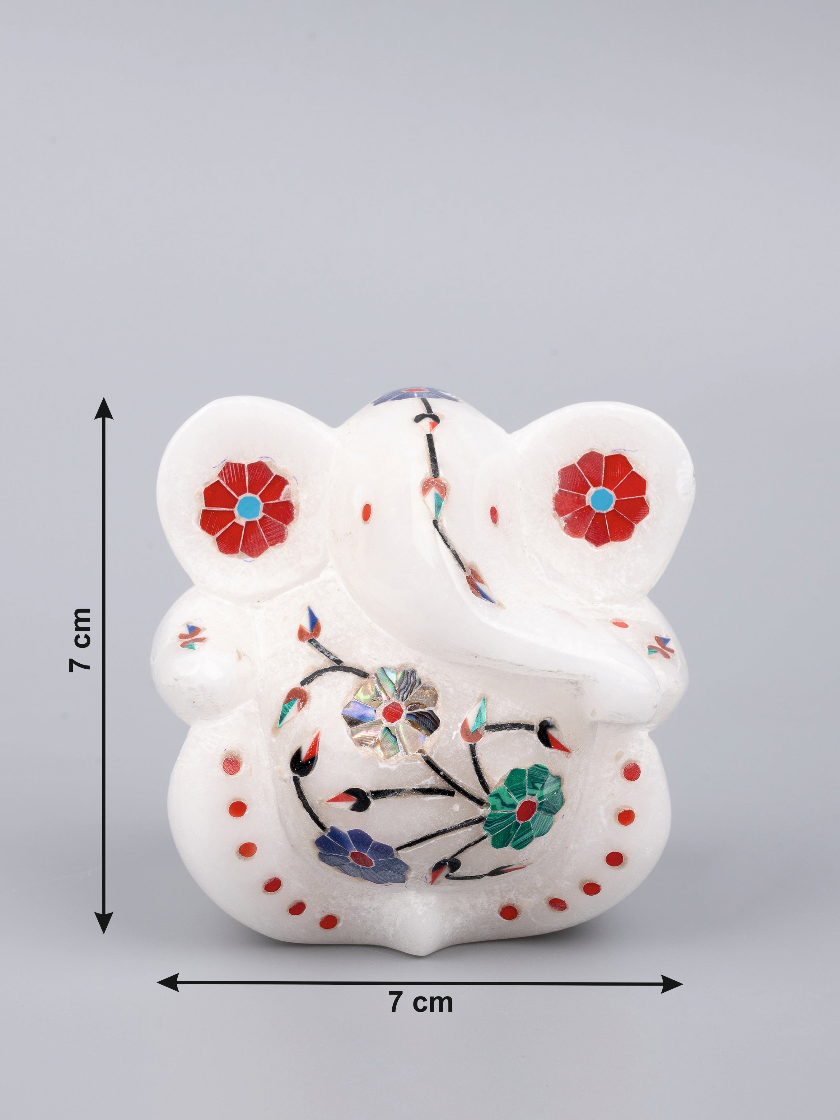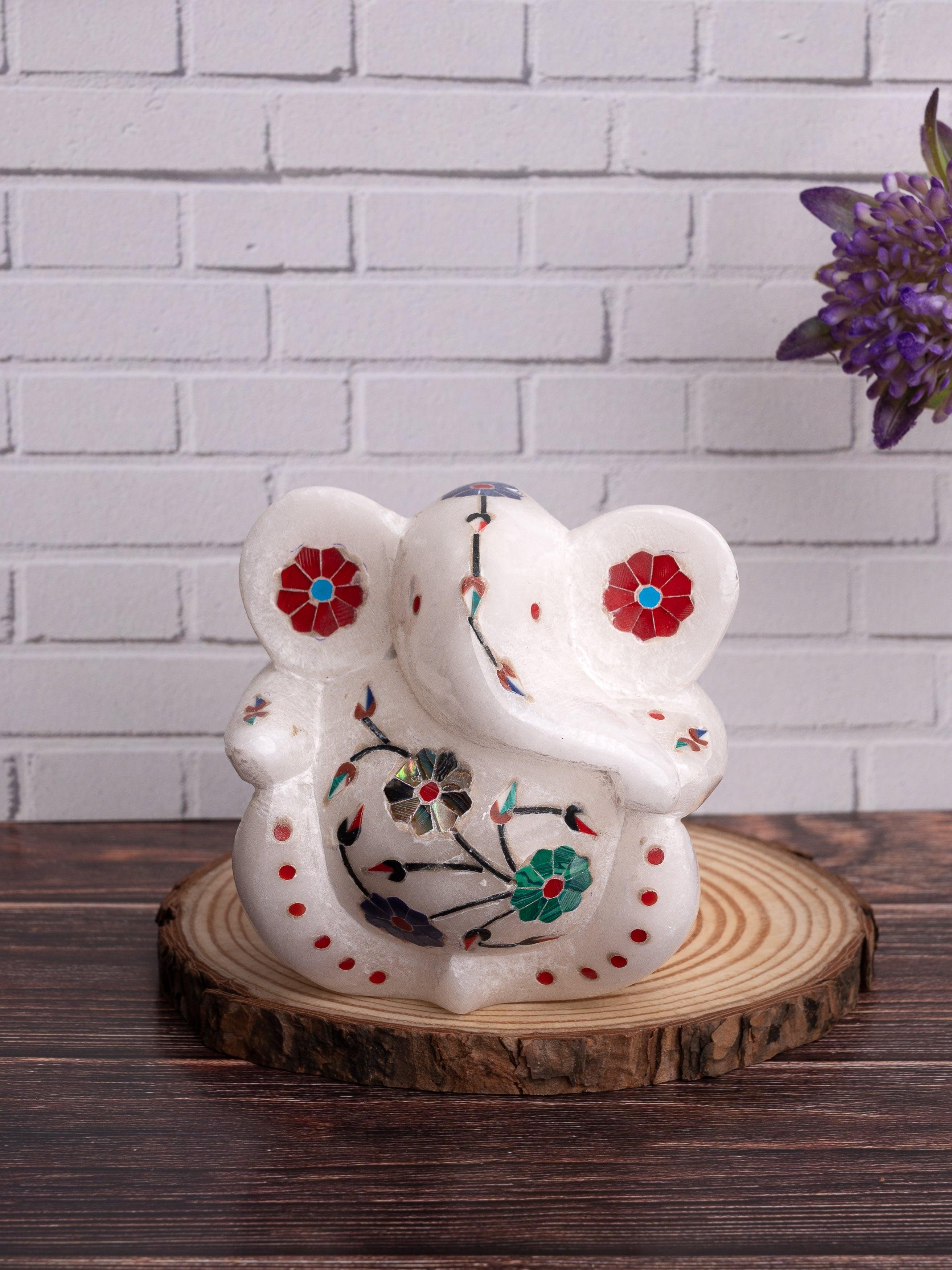 Small but very cute, statue of lord ganesha is hand crafted from a single piece of premium white marble stone accompanied by colorful inlay work. Ideal for home, office, favorite car and also as gift which everyone will appreciate.