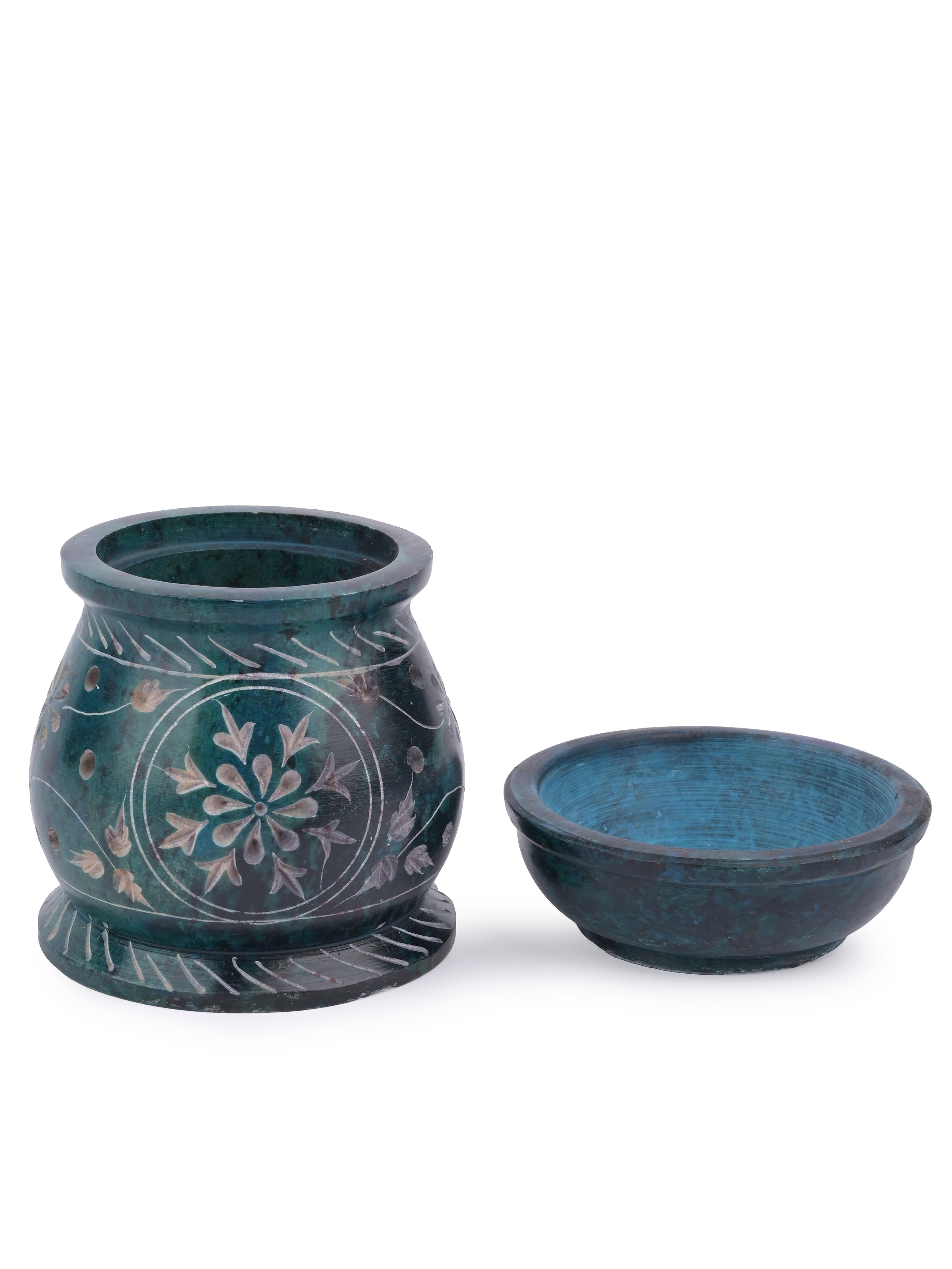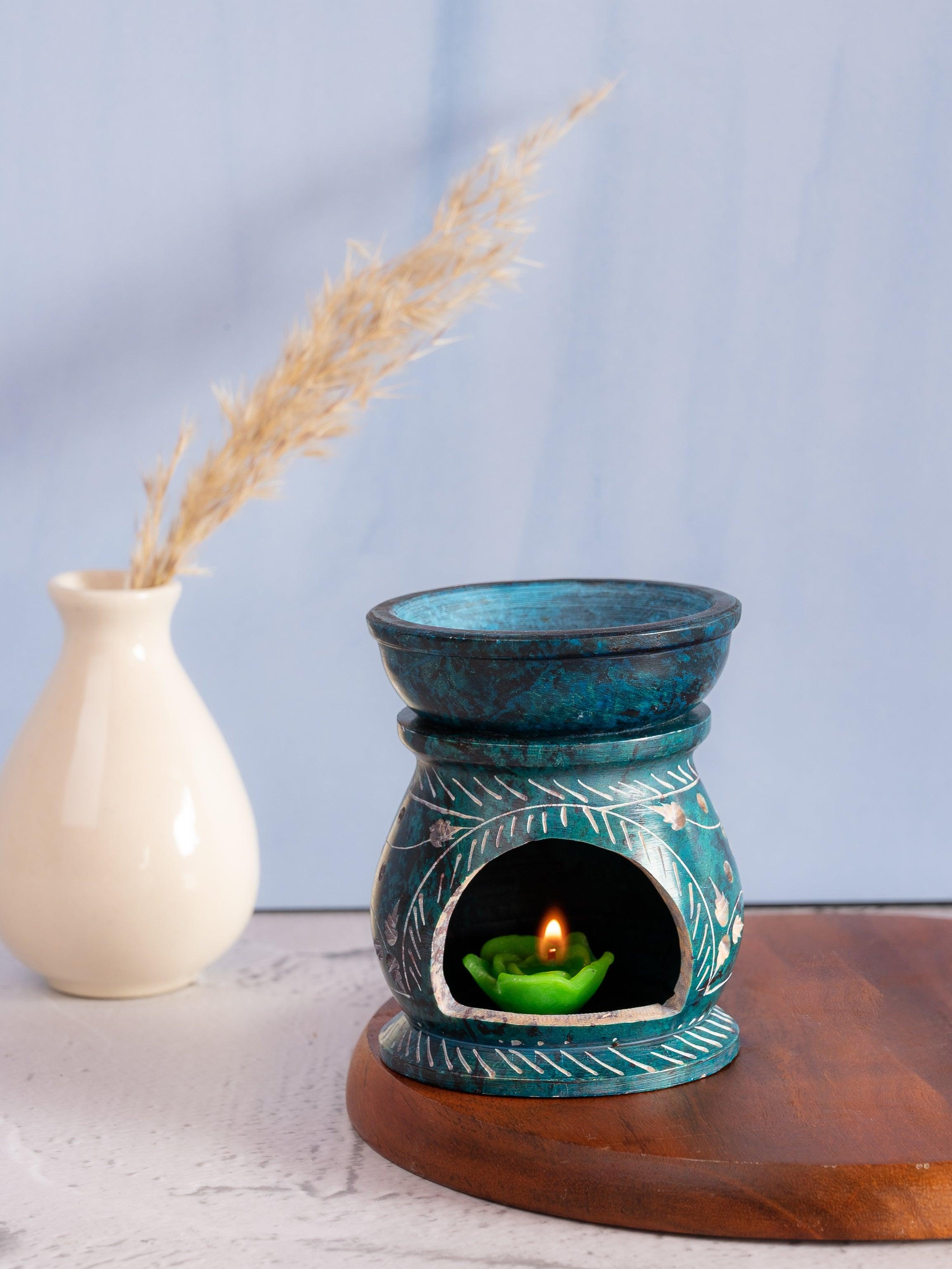 Using a simple tealight candle, this soapstone oil diffuser will fill the air with your favorite fragrance. Decorative holes and designs are carved out around the base which gives light and shadow effect. Comes in 3 colors, Green, Red and Blue.