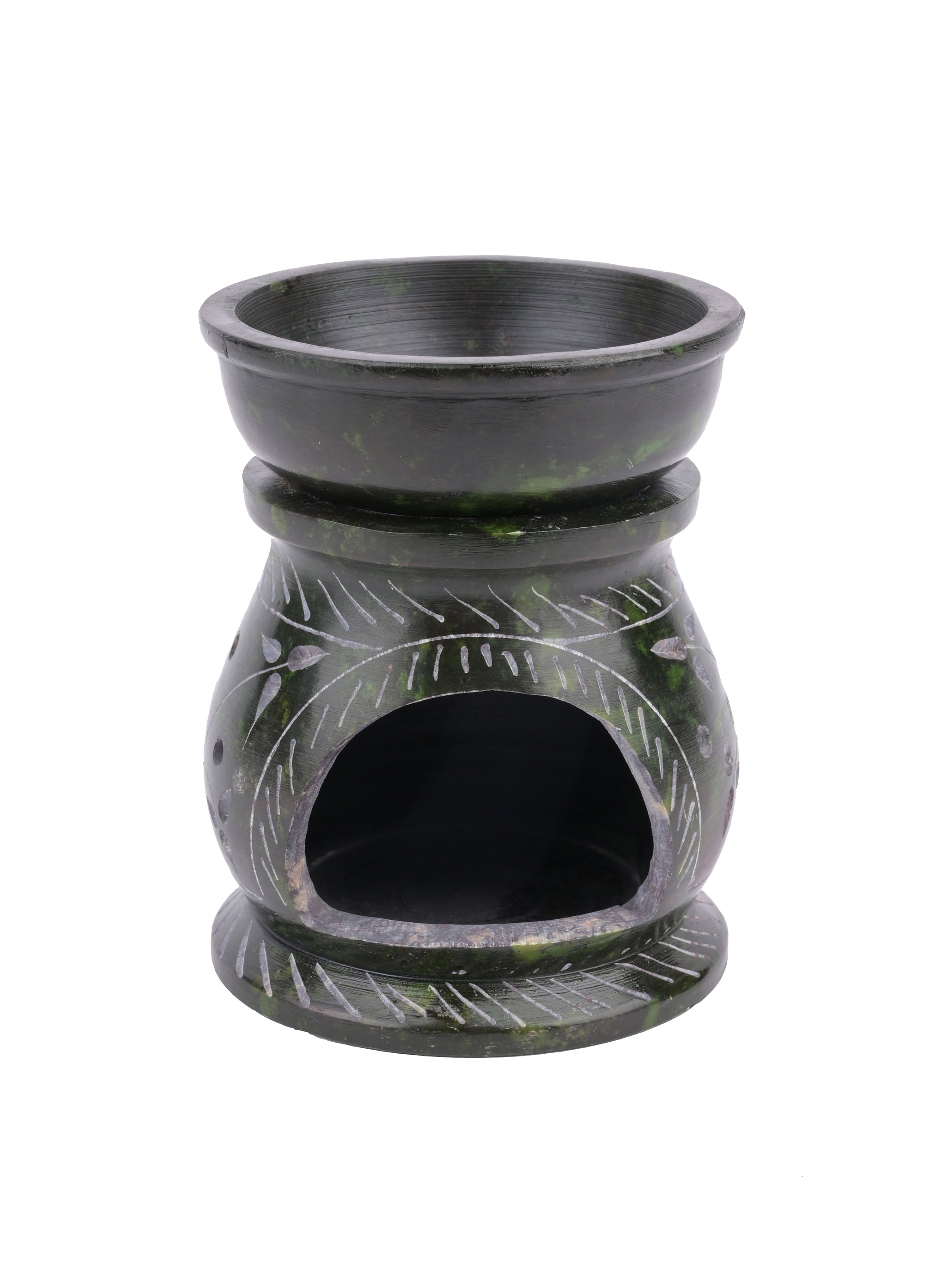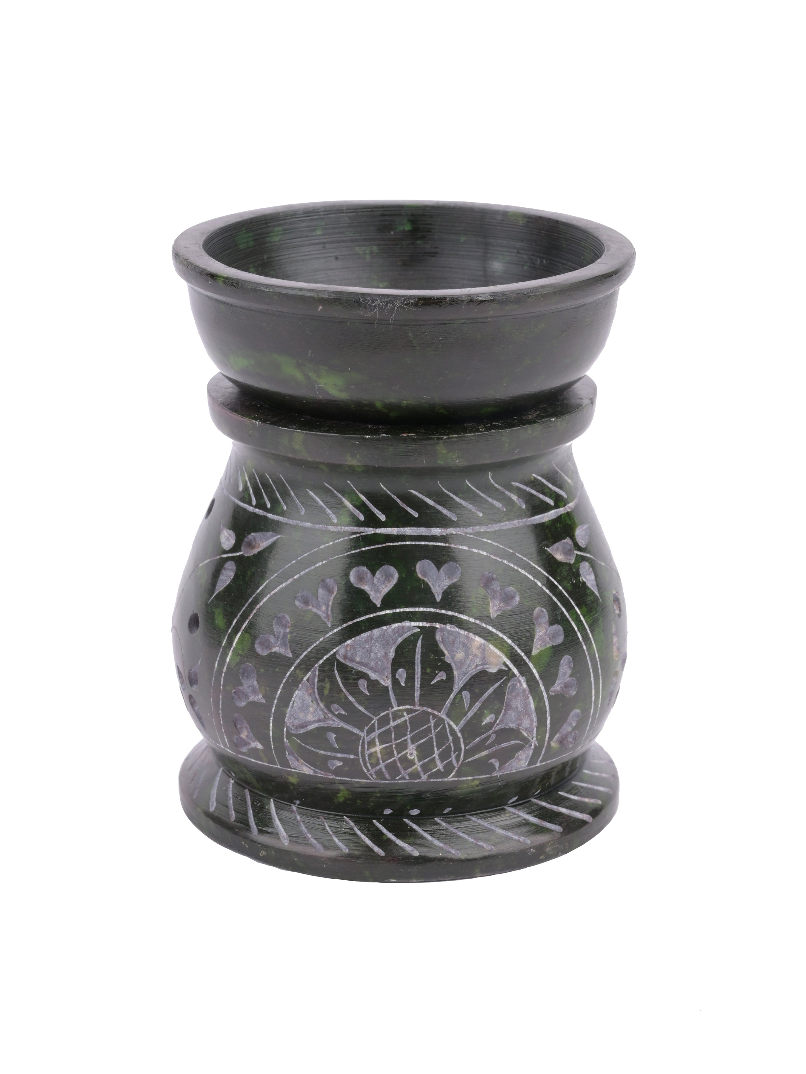 Using a simple tealight candle, this soapstone oil diffuser will fill the air with your favorite fragrance. Decorative holes and designs are carved out around the base which gives light and shadow effect. Comes in 3 colors, Green, Red and Blue.