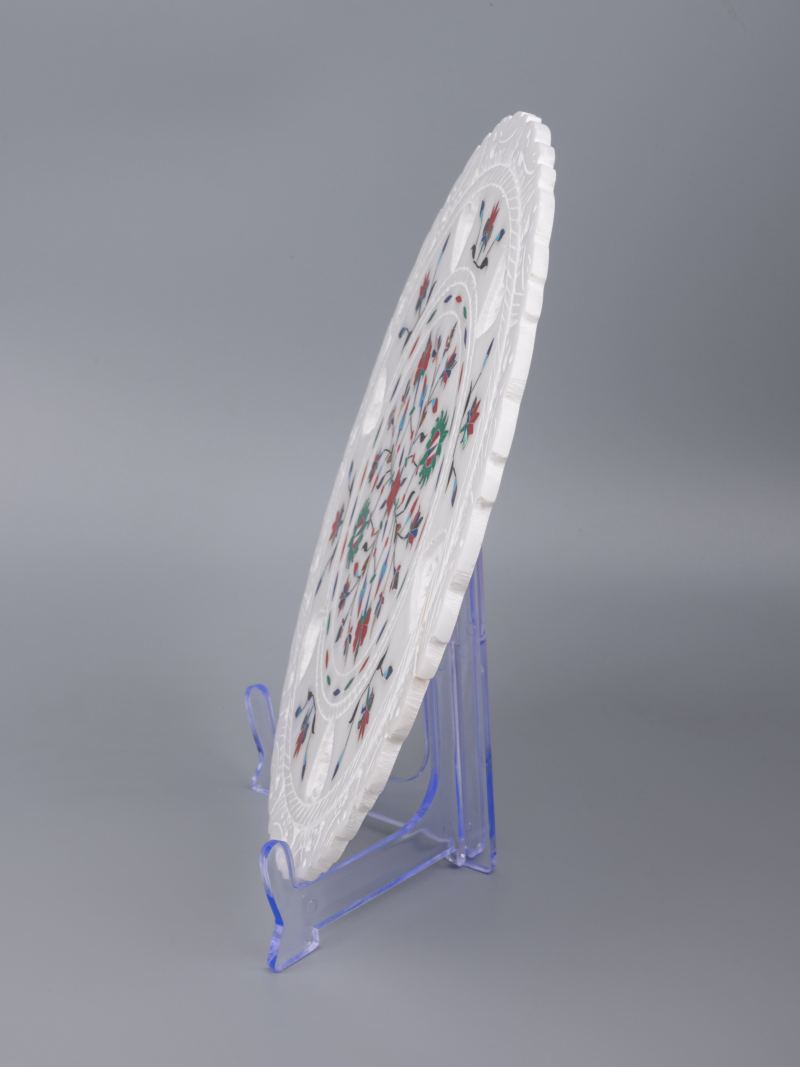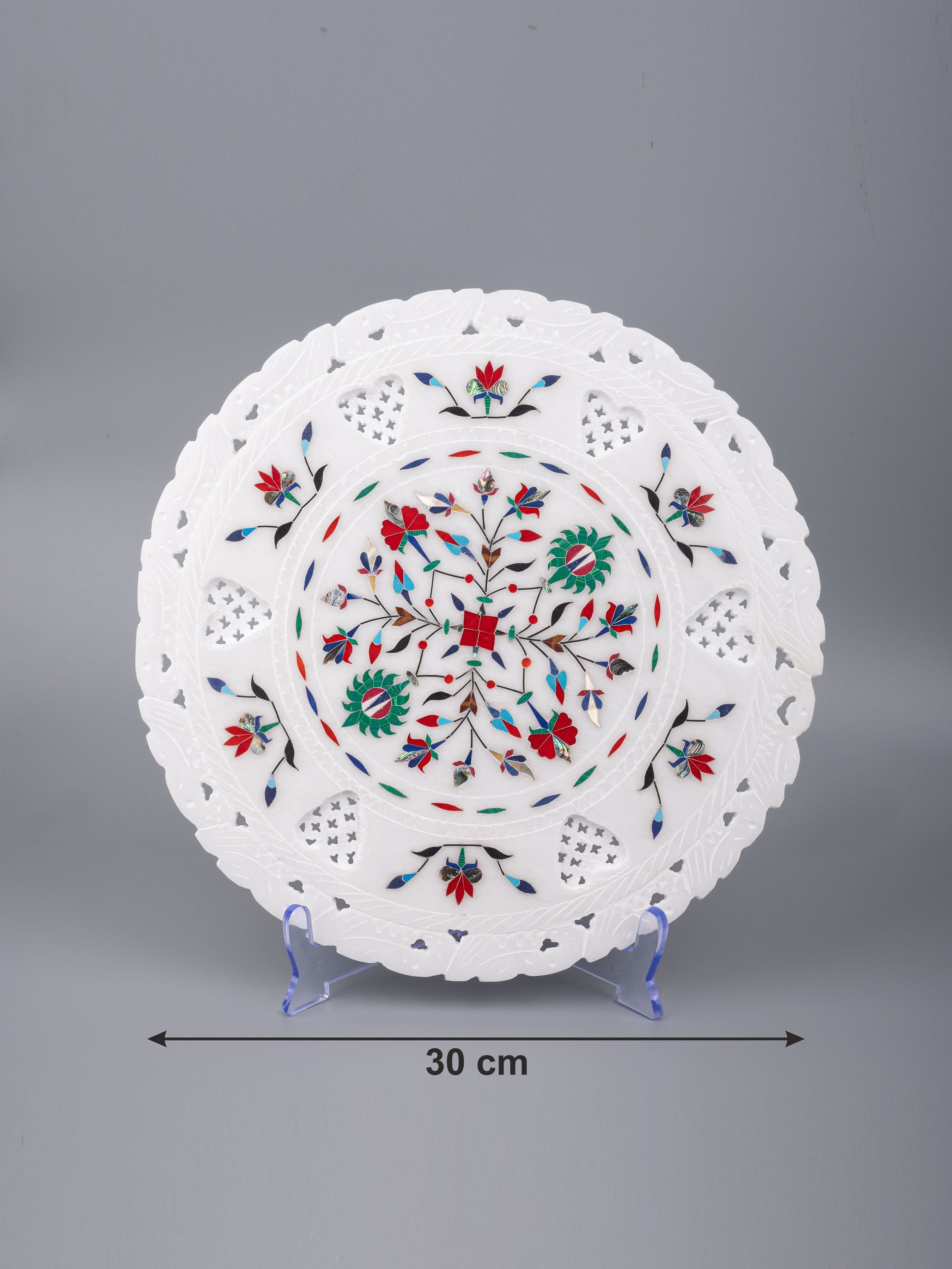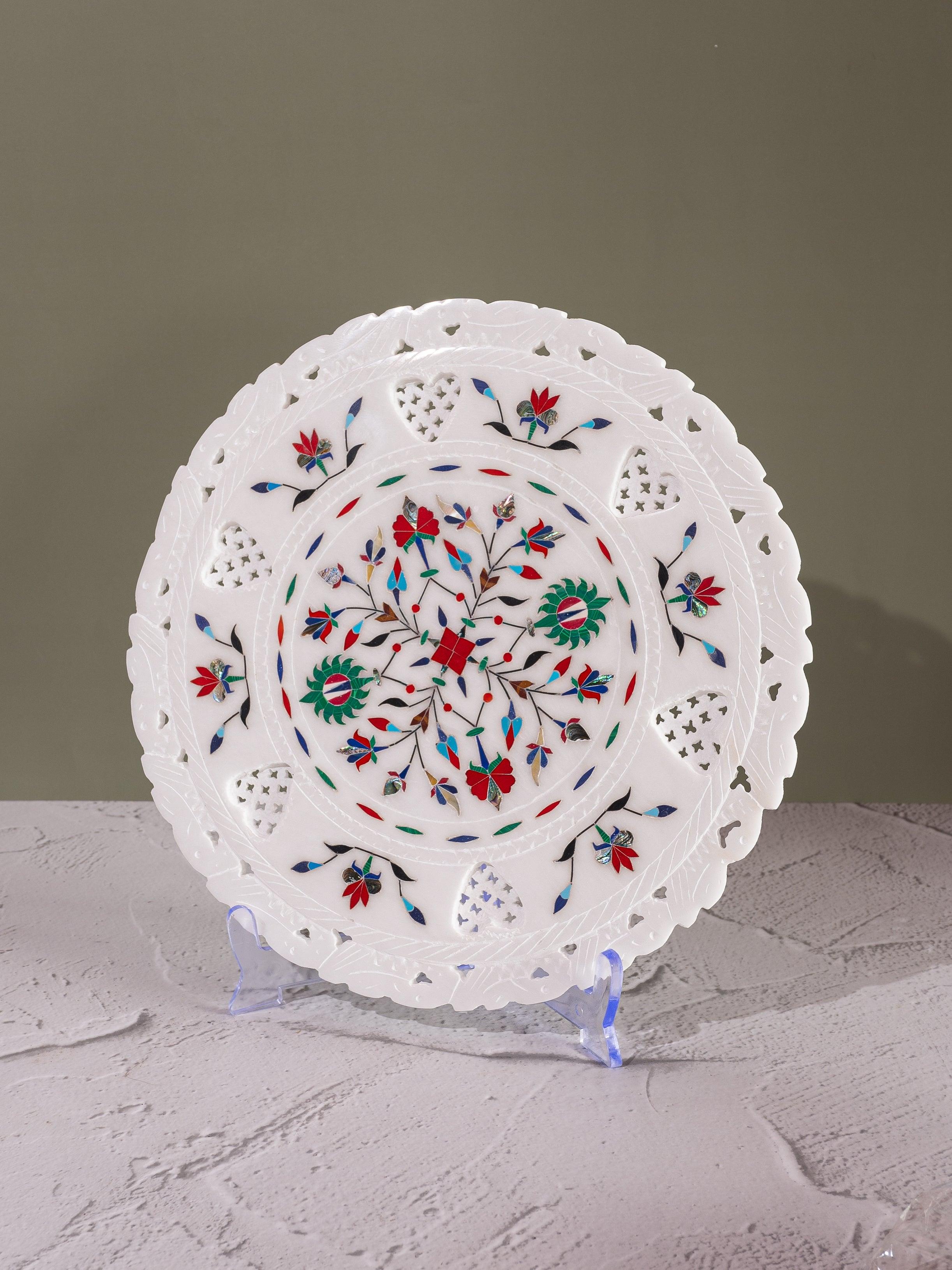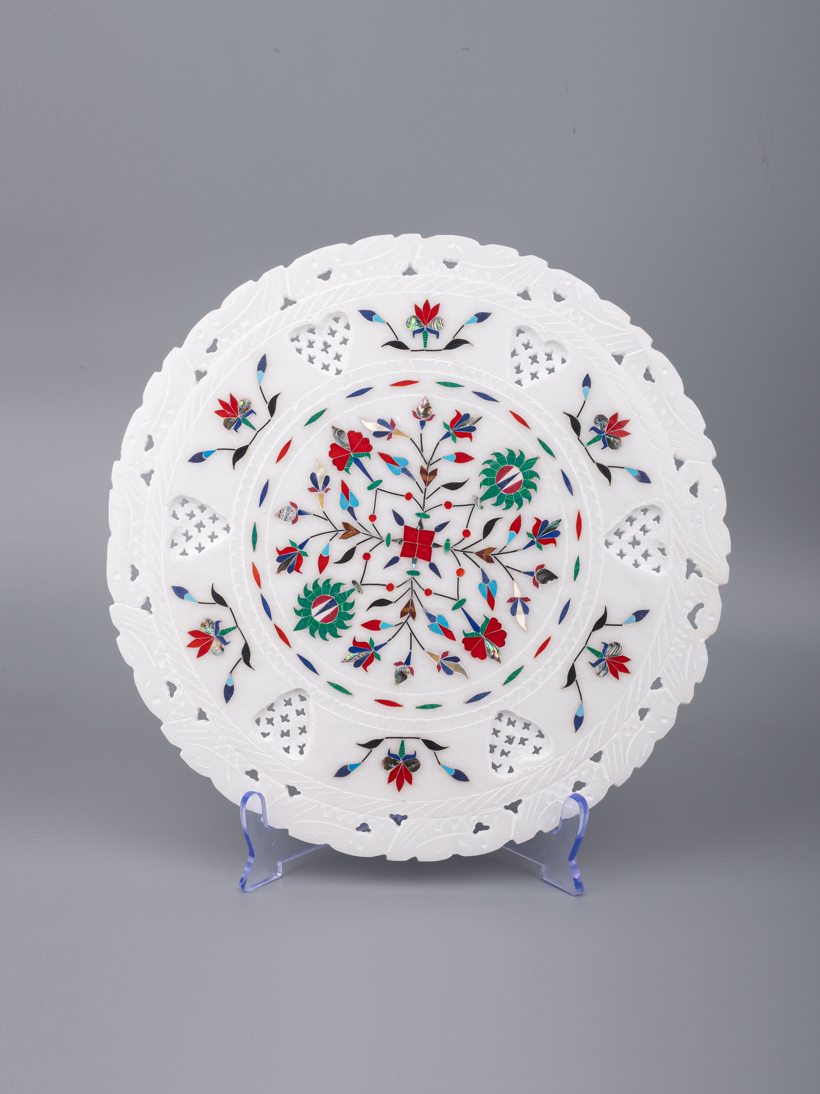 This beautiful plate has an extensive and colorful stone inlay and filigree work making it a fascinating display. It comes with a transparent acrylic stand.
