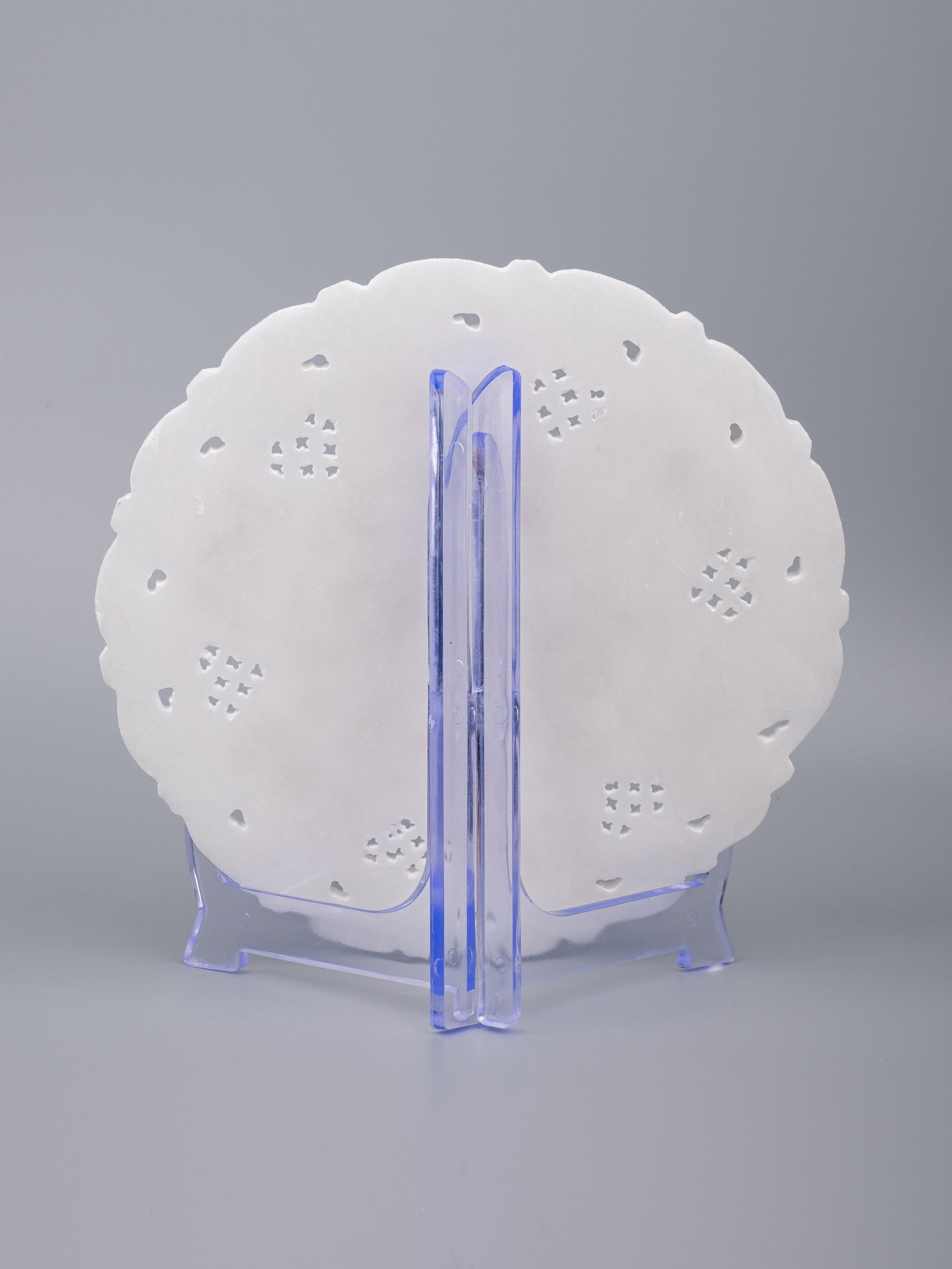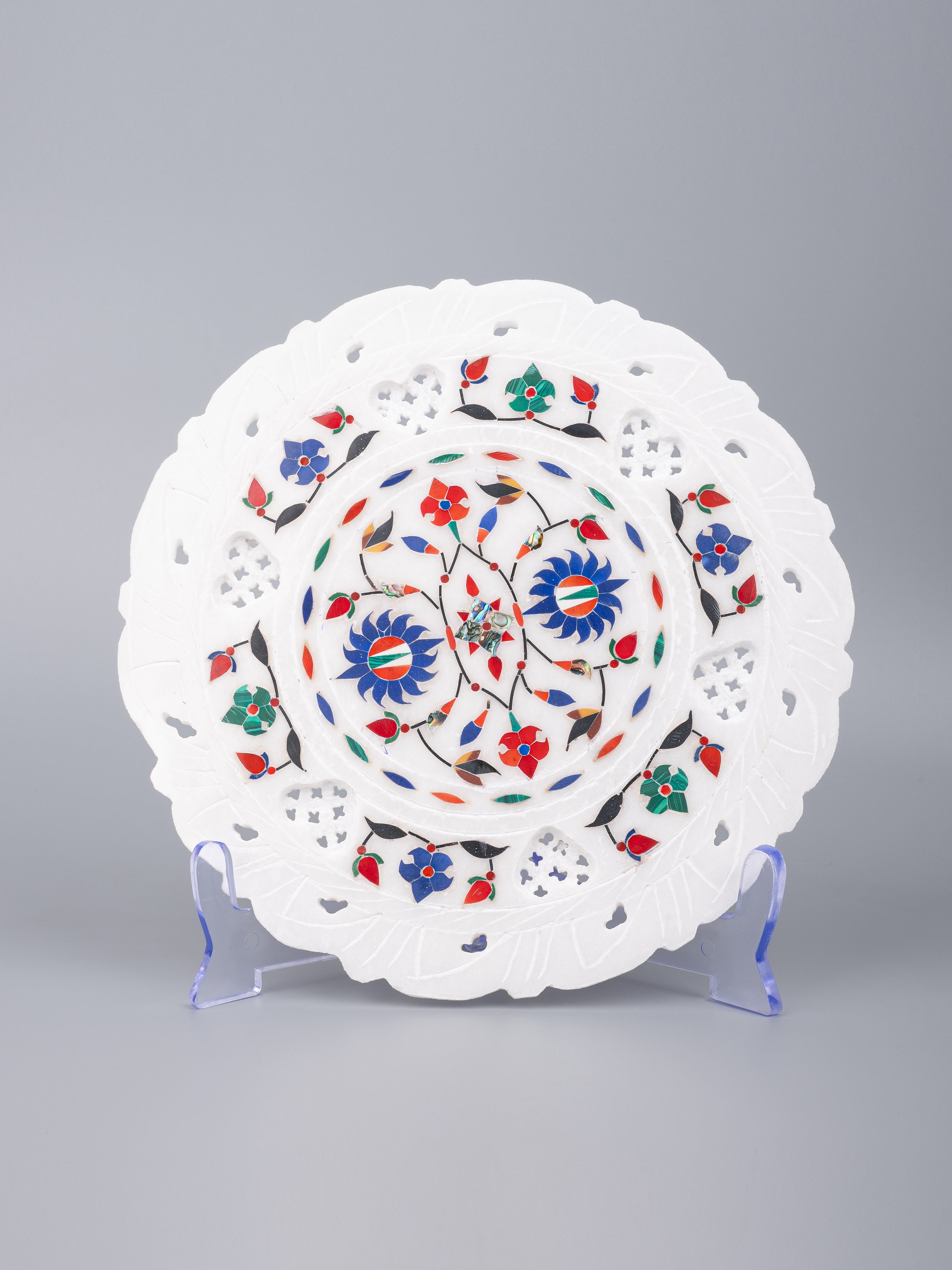 Add glamour and style to your décor with the royal marble wall art plate, made using premium quality marble. This all marble décor plate is artistically adorned with blue and red floral pattern through intricate inlay work. It comes with a transparent acrylic stand.