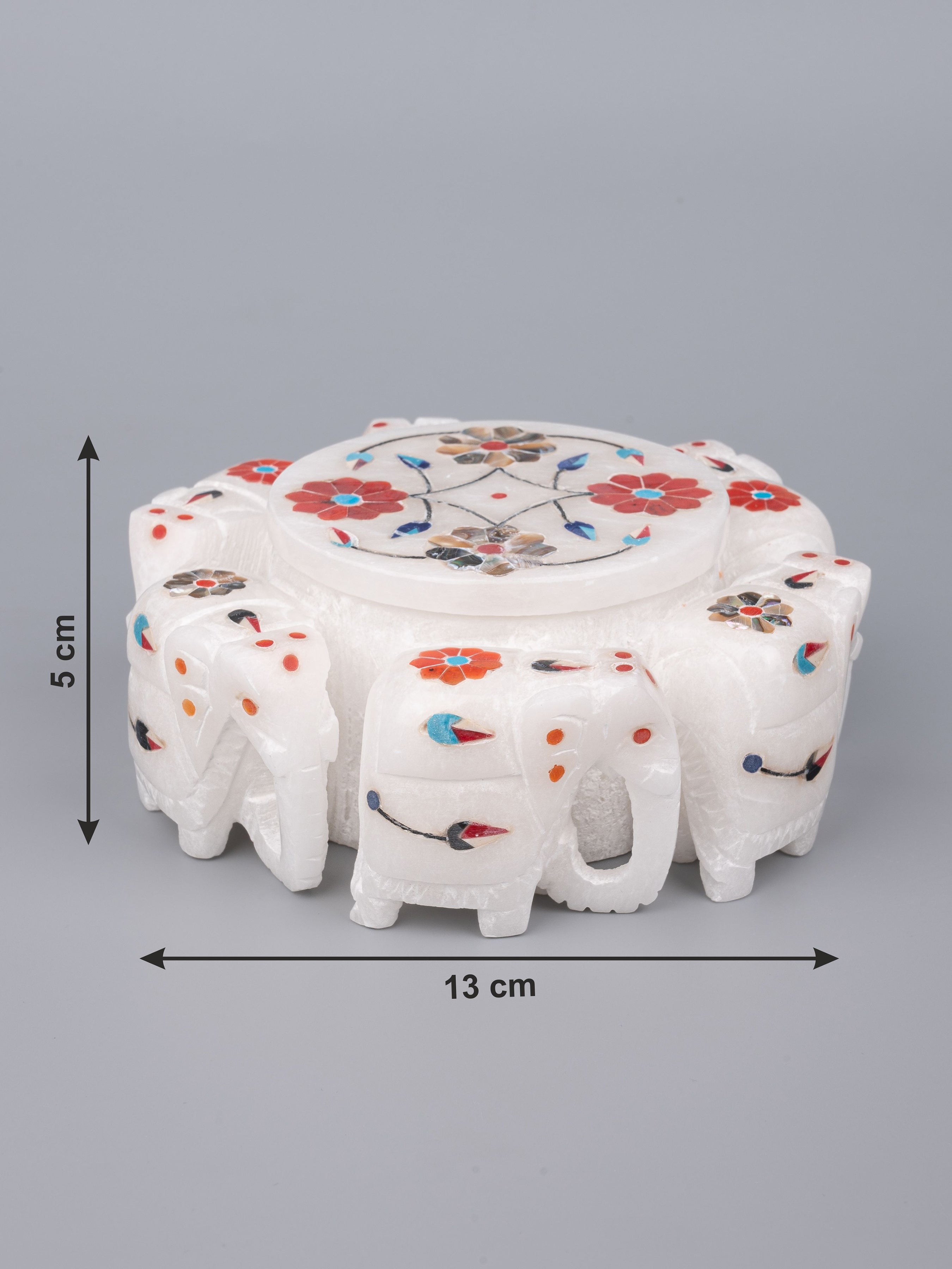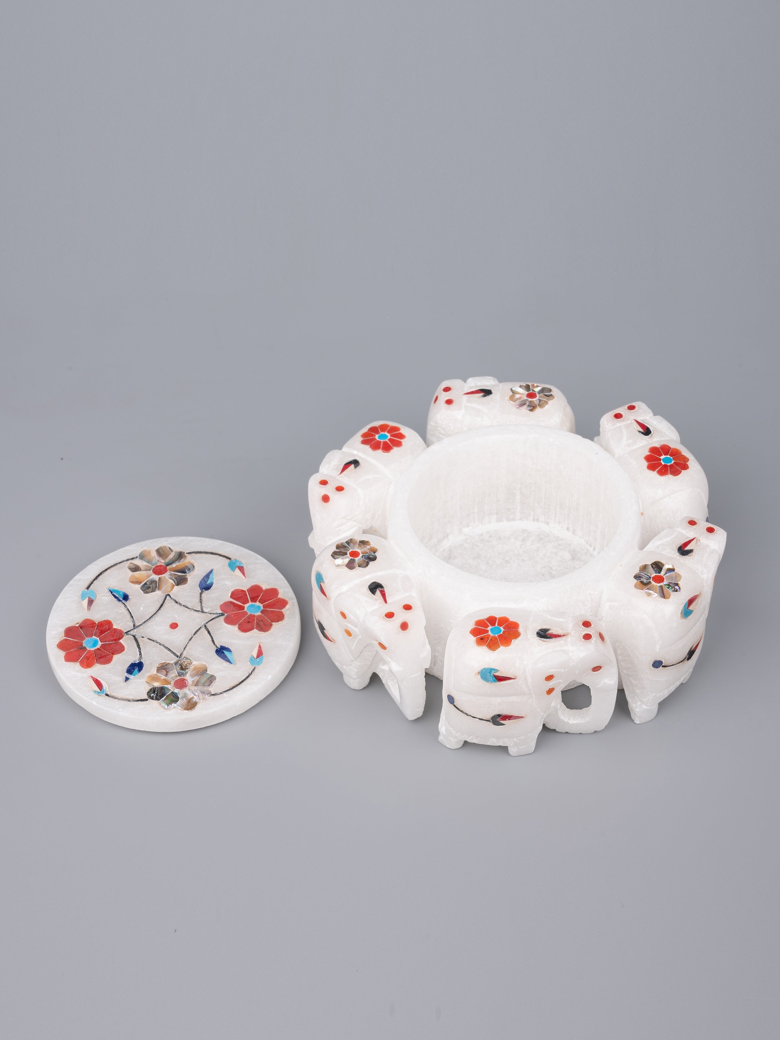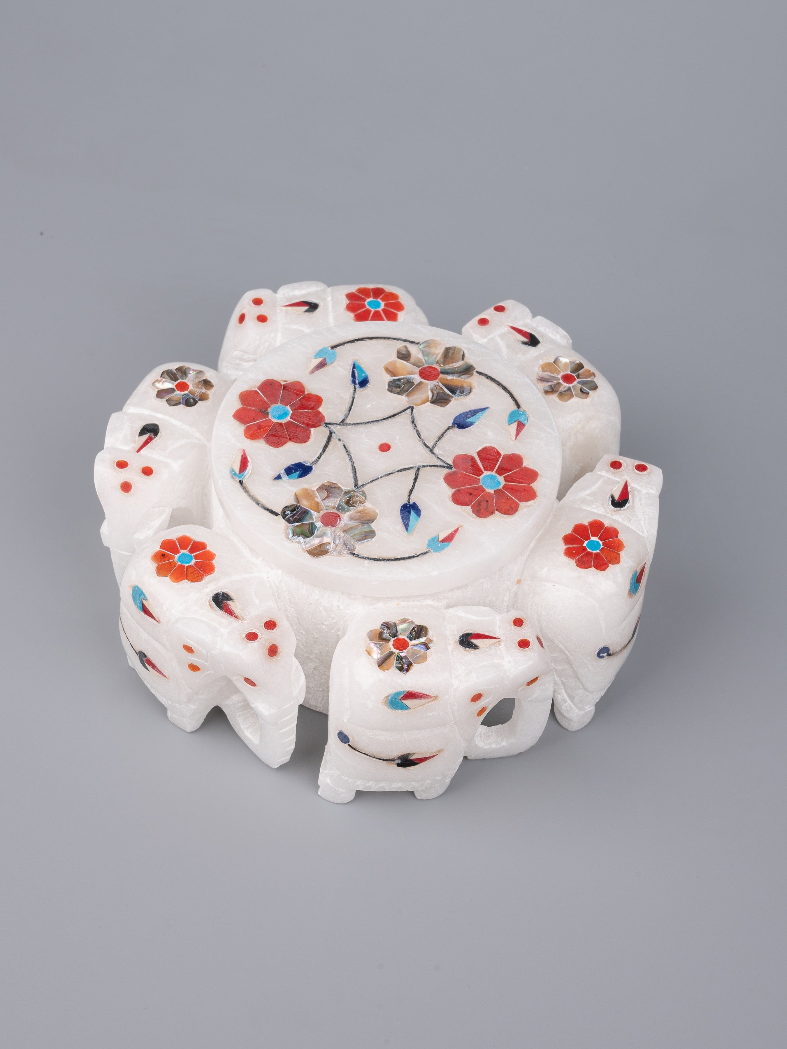 This is a finely hand carved small storage box with 6 elephants surrounding it. Can be use for storage or as a exclusive show piece in your favorite cabinet.