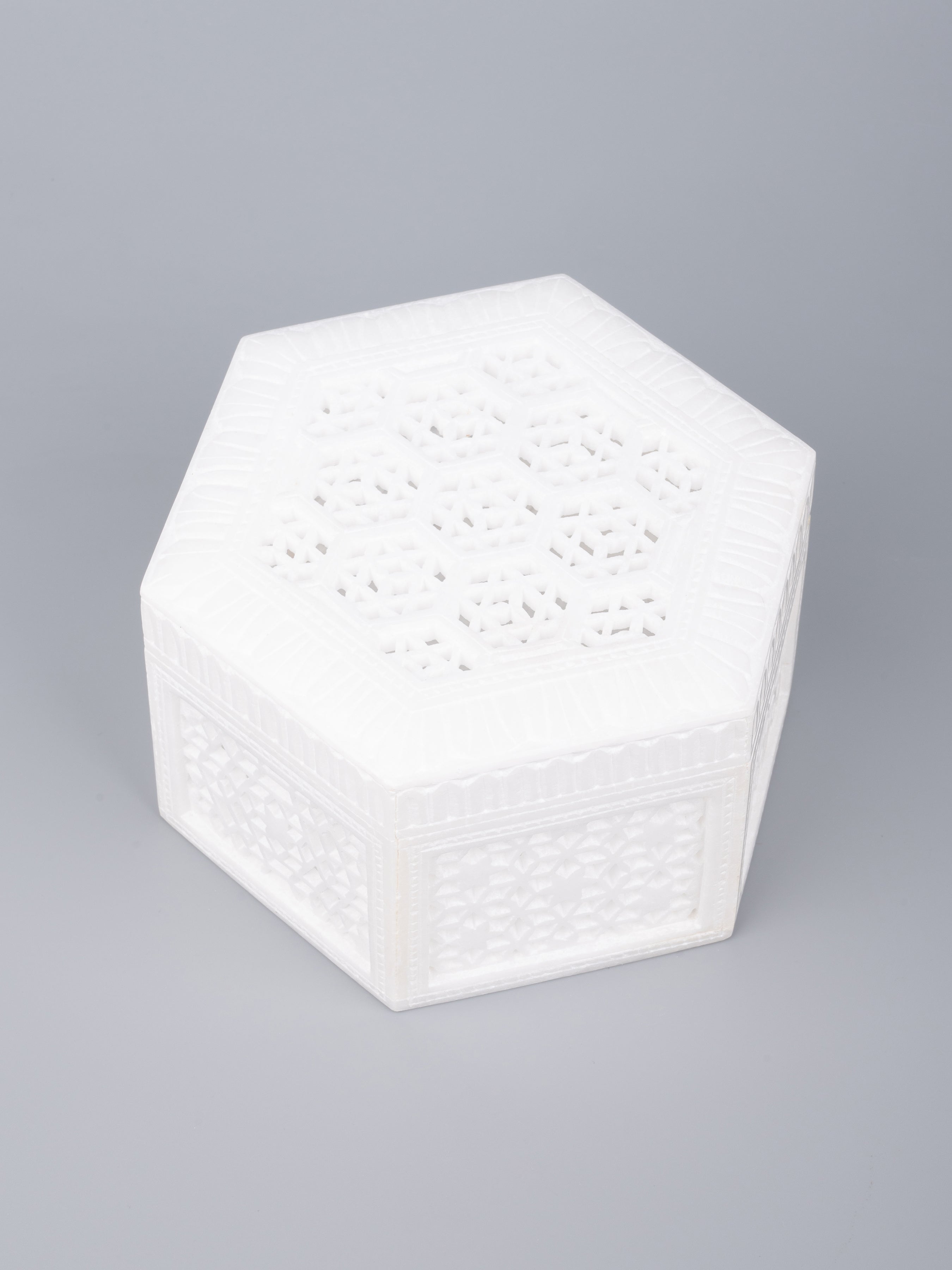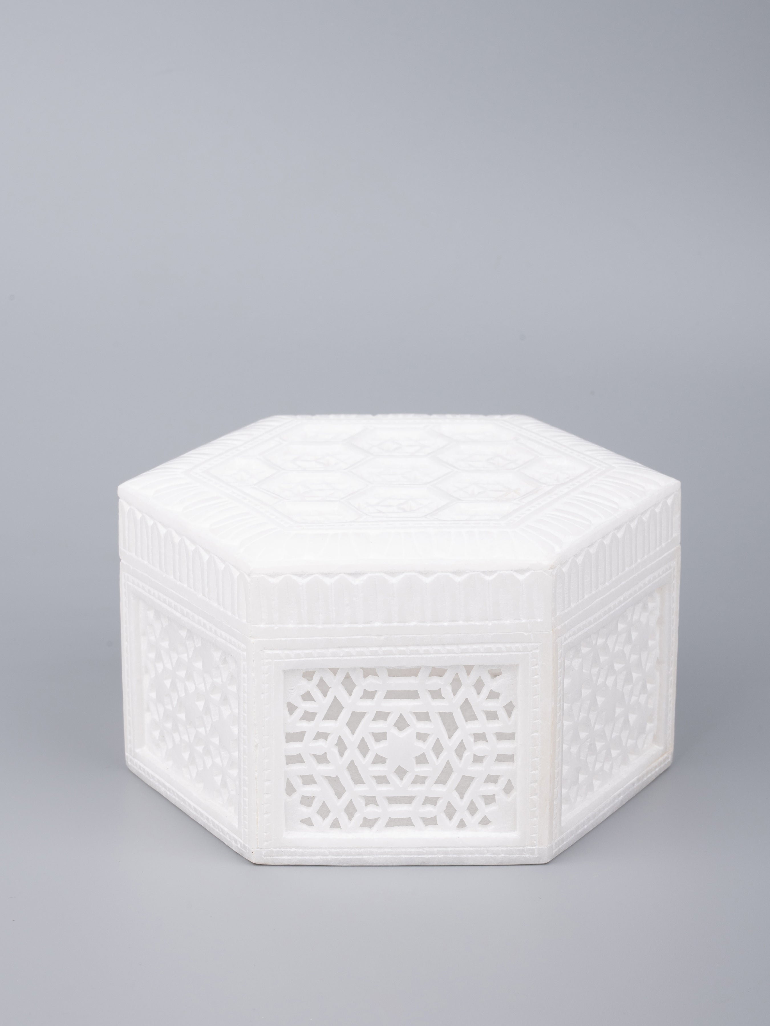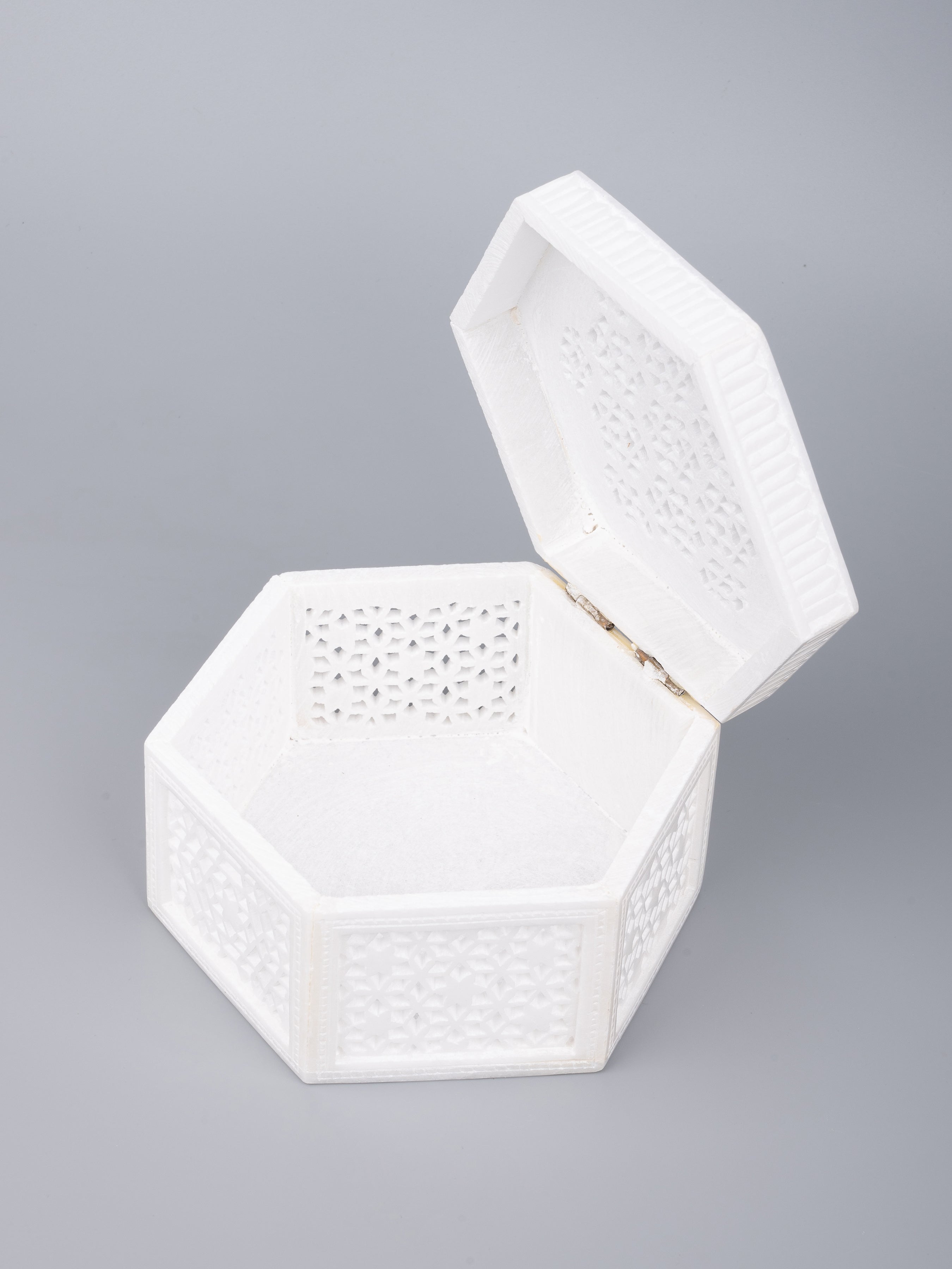 This decoratively carved and uniquely shaped box has been hand crafted to perfection by the artisans of Agra using traditional skills. Suitable for storing earrings, rings, keepsakes or other jewelry. This beautifully hand crafted box is so attractive and eye catching that you won't regret your purchase.