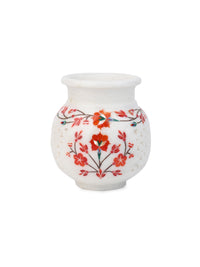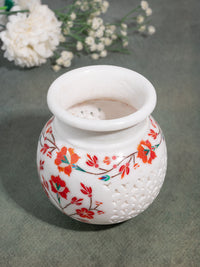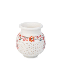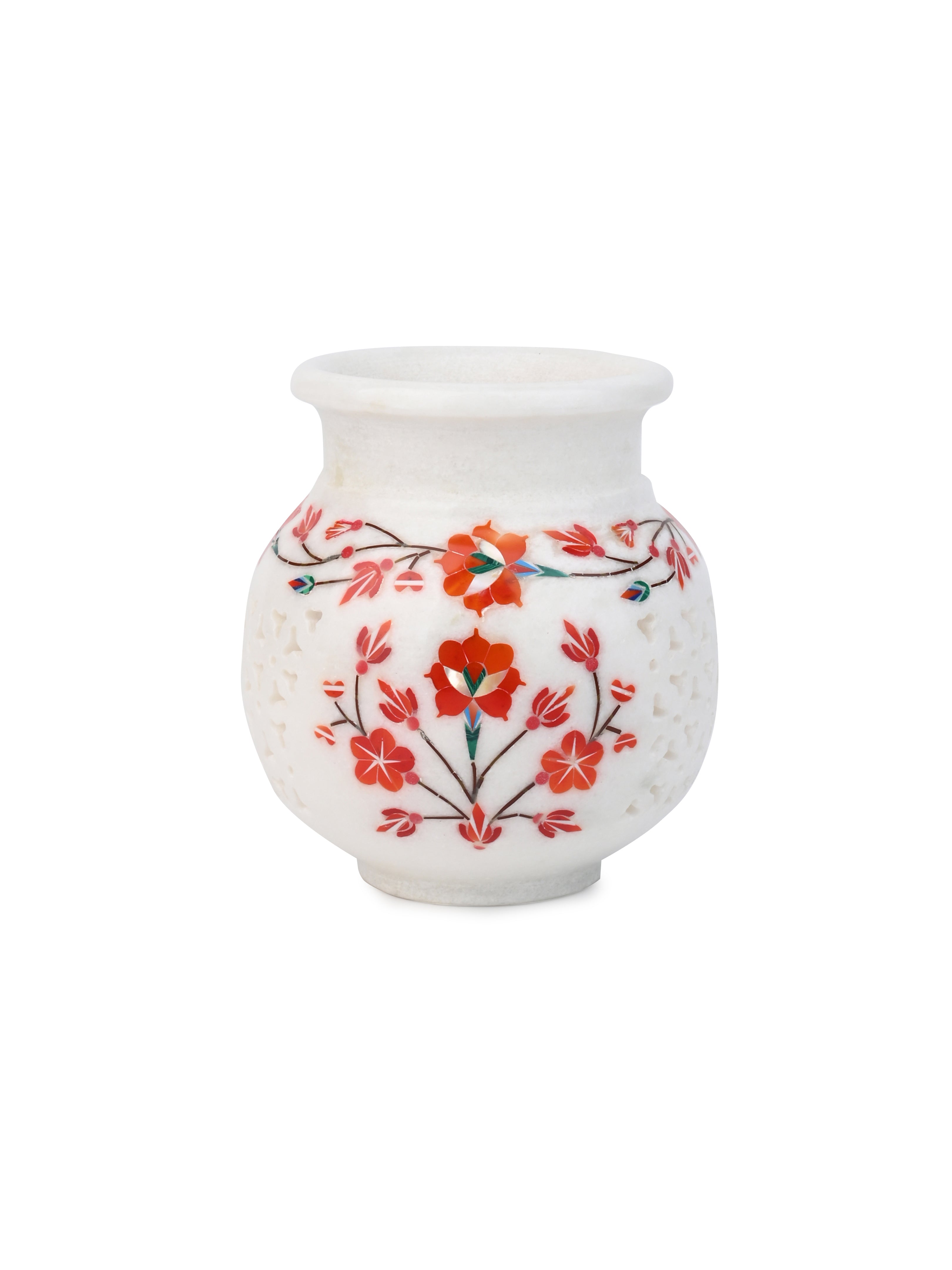 This decorative marble kalash is painstakingly handcrafted by expert artisans of Agra, using the traditional techniques of jali work and inlay work. Amazingly attractive because of the white and red color combination, it can be placed as a single piece or decorated with fresh flowers. Placing a T light candle inside will give the pot a unique look that uplifts the mood and ambience of any room.