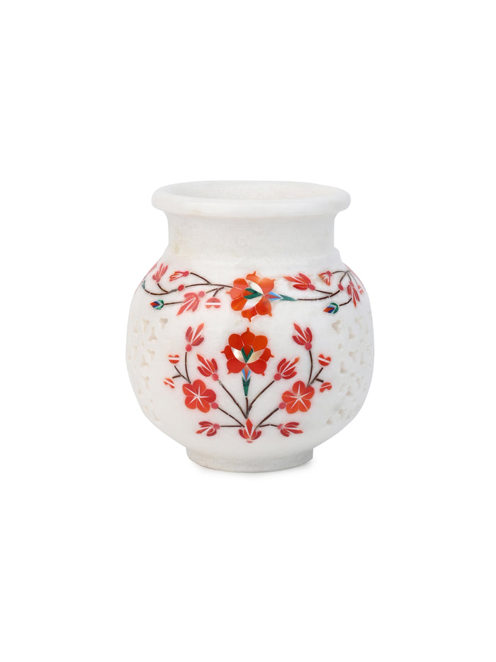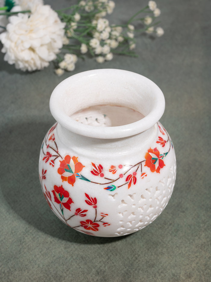 White Marble Crafted Kalash/Pot with Intricate Jali and Inlay Work - 5 inches