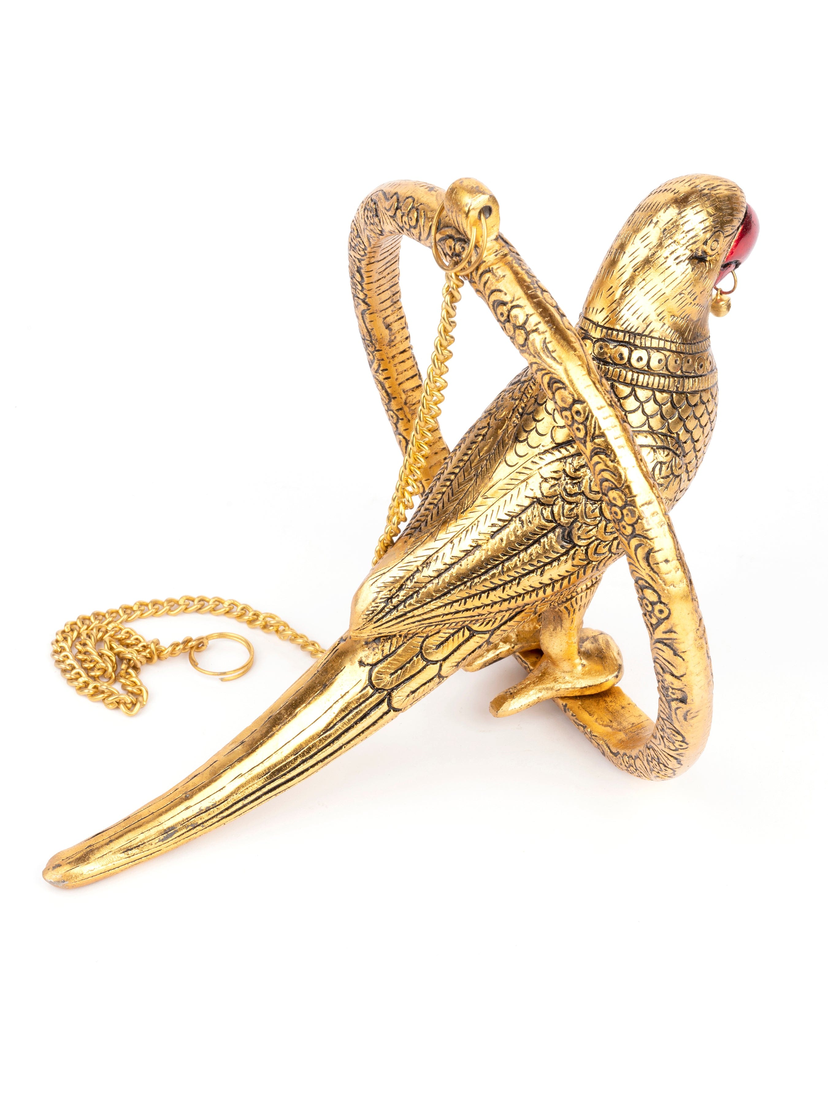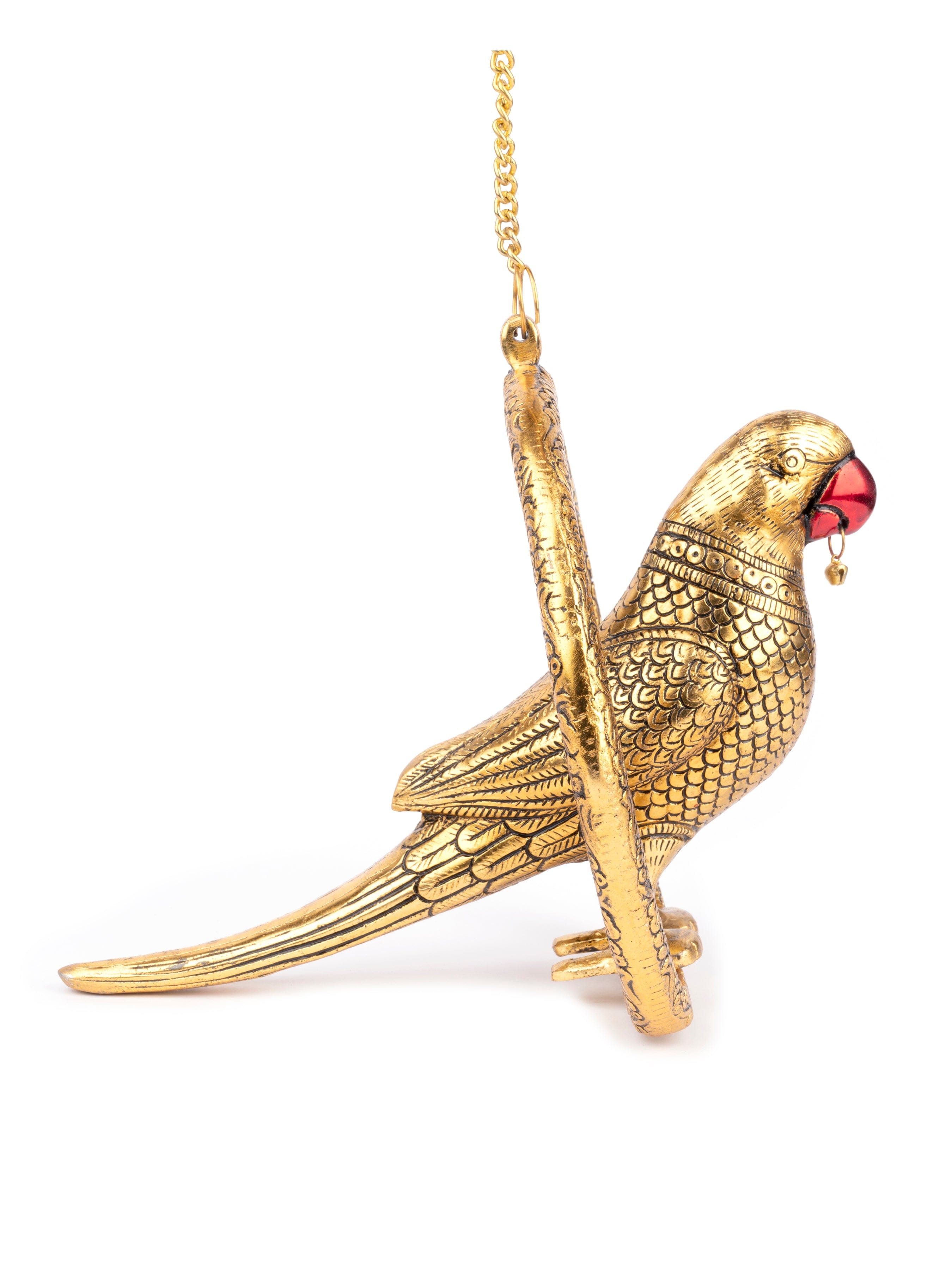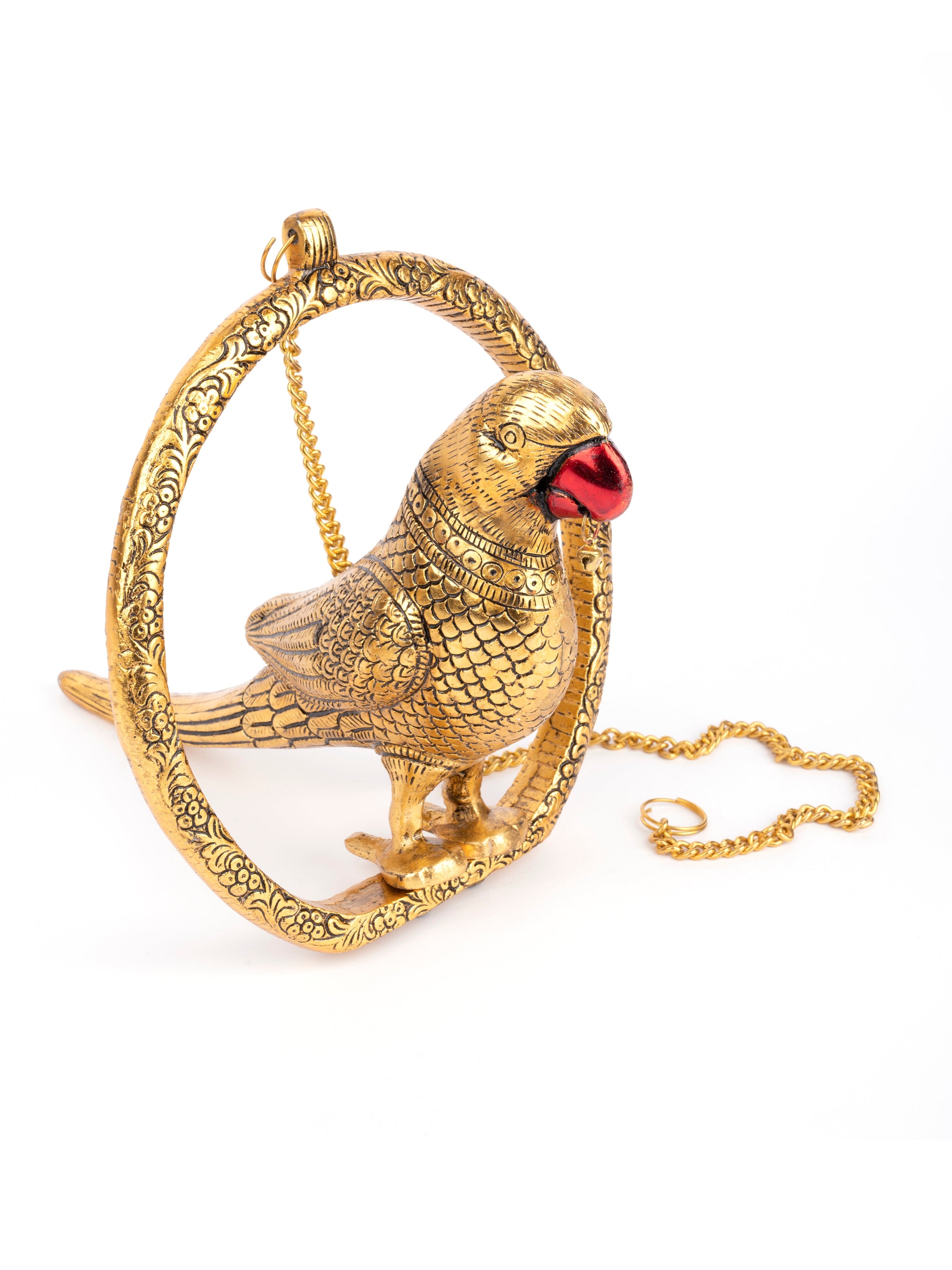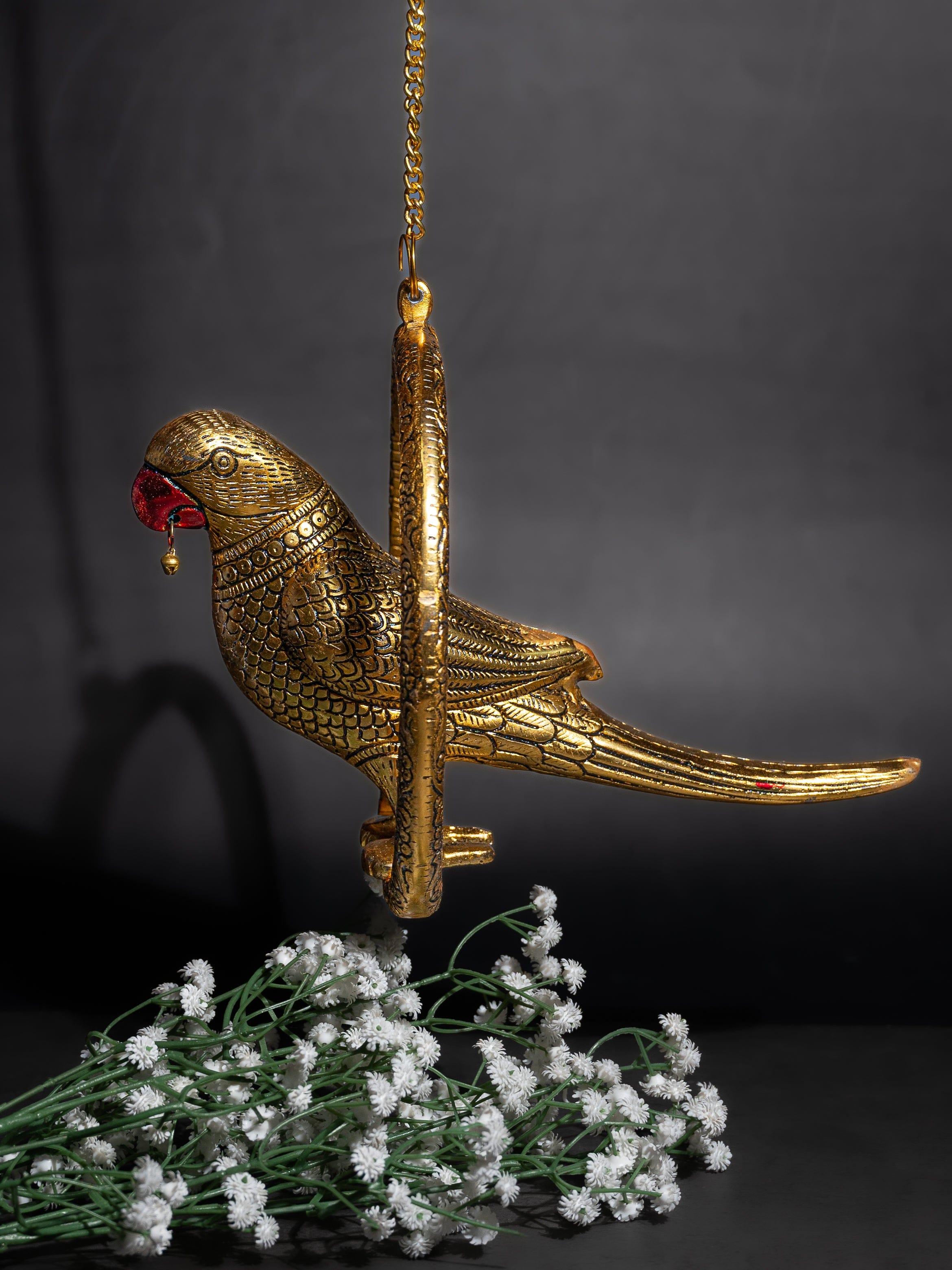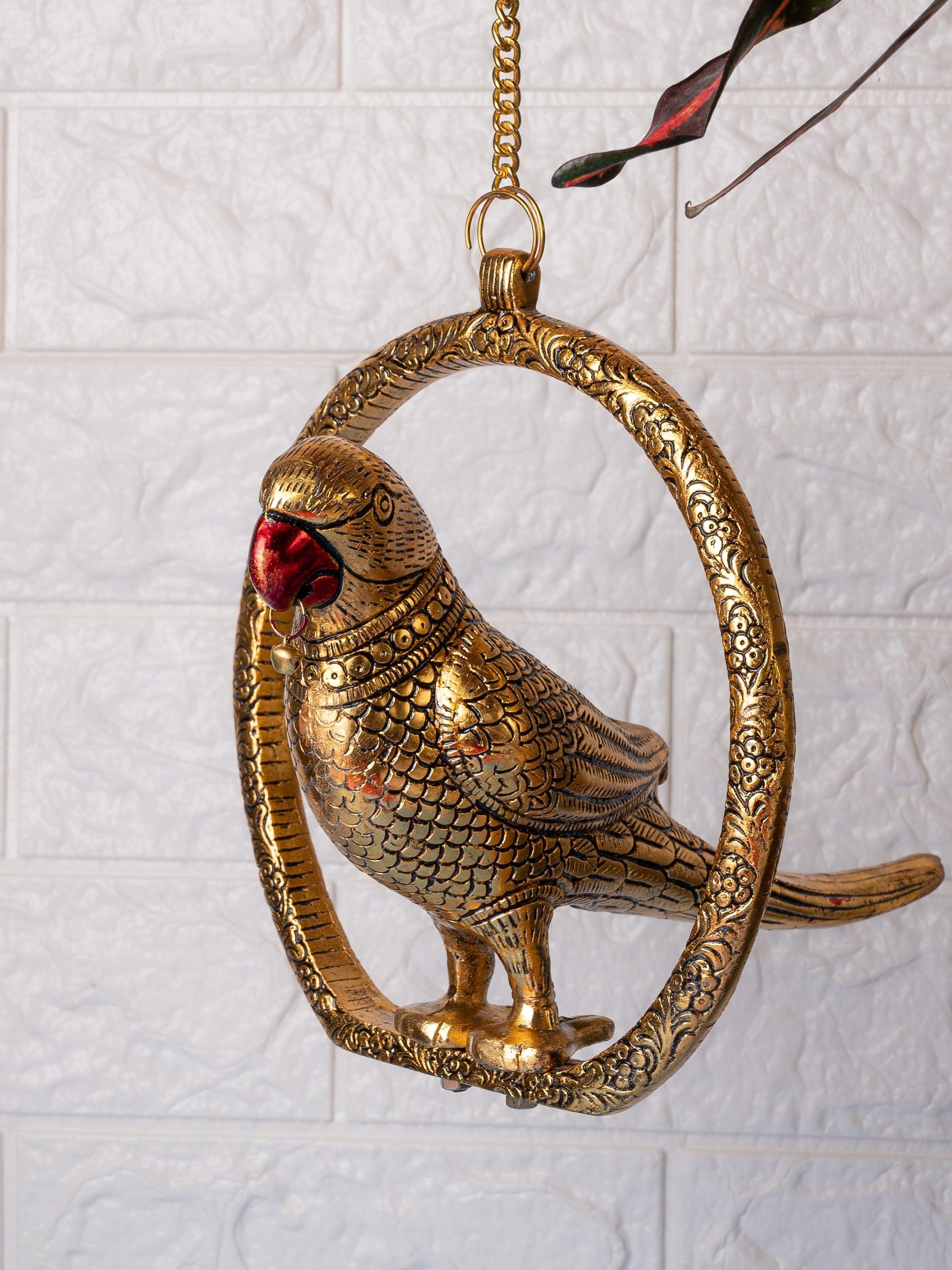 Our hanging golden parrot looks very attractive with the beautiful engravings done on it. It is sitting inside a ring which also has fine detailing on it. A 50 cms long golden chain is provided to hang the parrot either on the door or on the ceiling. The Parrot once hanged looks surreal and adds glamour to your home decor. Parrot is considered auspicious and symbol of truth and brings lot of fortune your way.