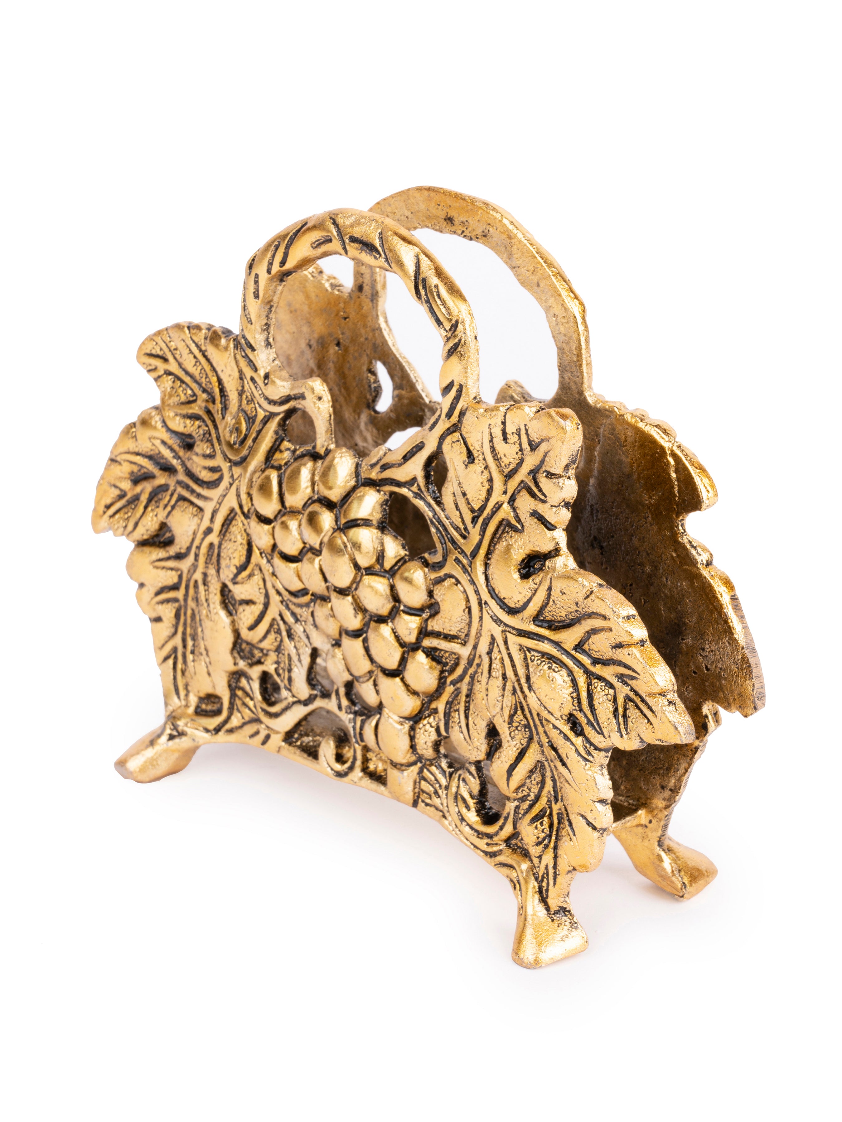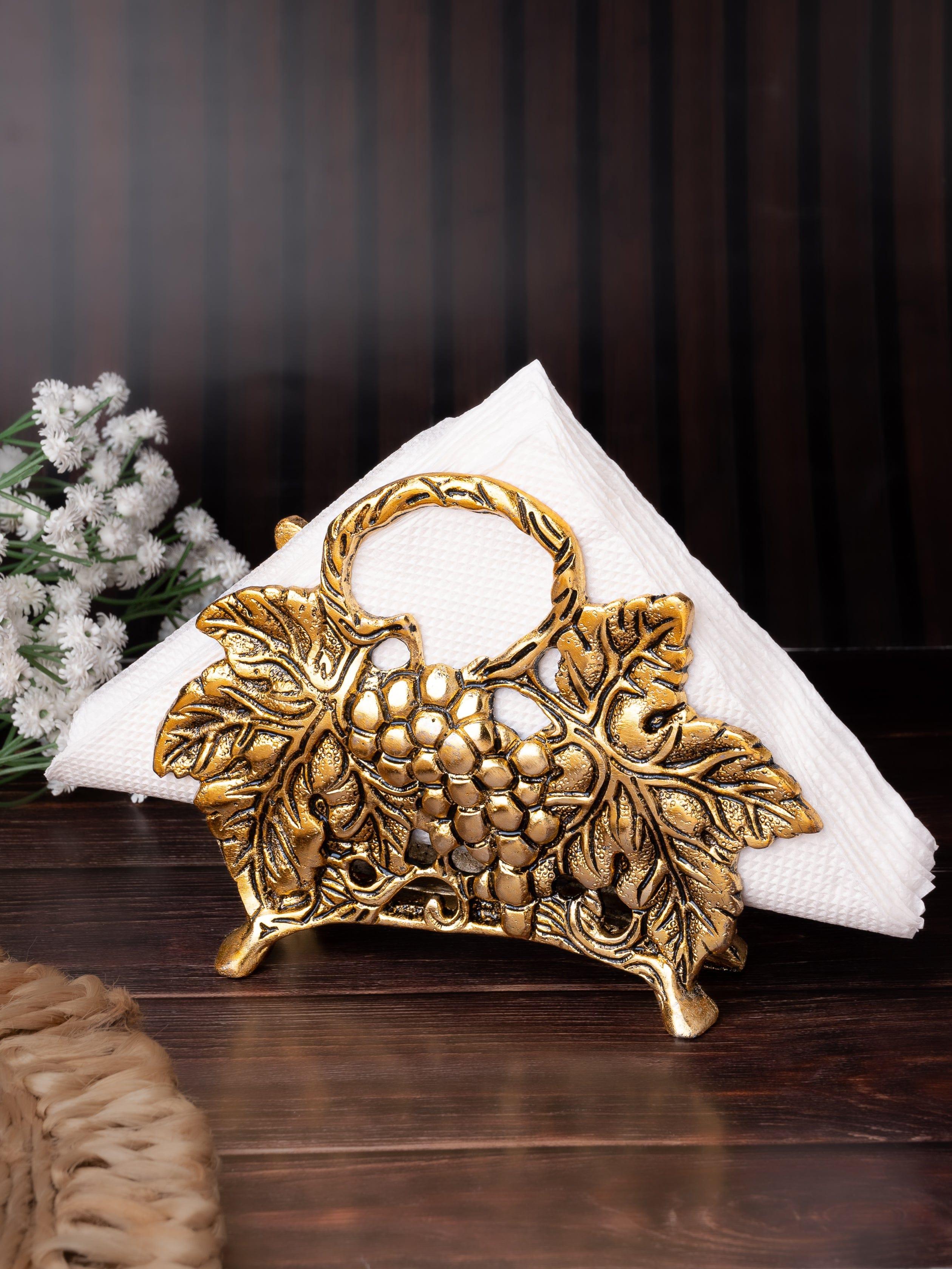 Perfect your dining table settings with our classic design napkin holder. It features intricate engraved detailing, while the antique gold tone ensures a modish touch. Partner it with similarly designed items for a cohesive look.