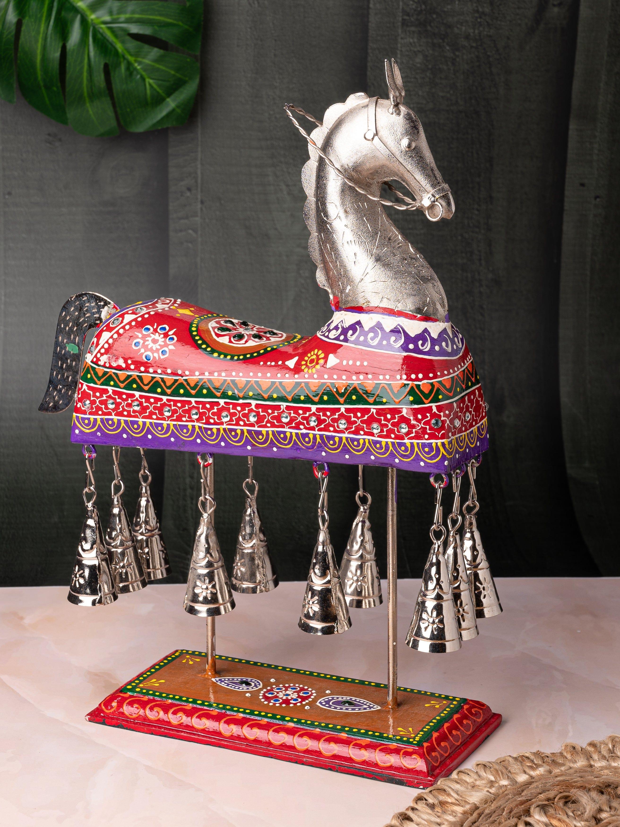 This is a handmade vintage style wood and iron metal horse statue decorated beautifully with chiming bells. The vibrant meenakari colors and music of the bells can bring charm to any boring living area. Also it can be a very unique gift for your loved ones on any occasion/festival.