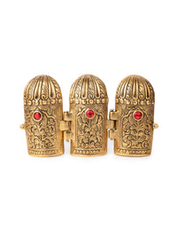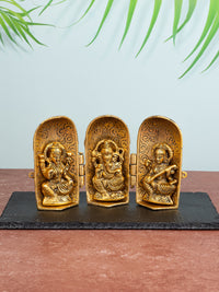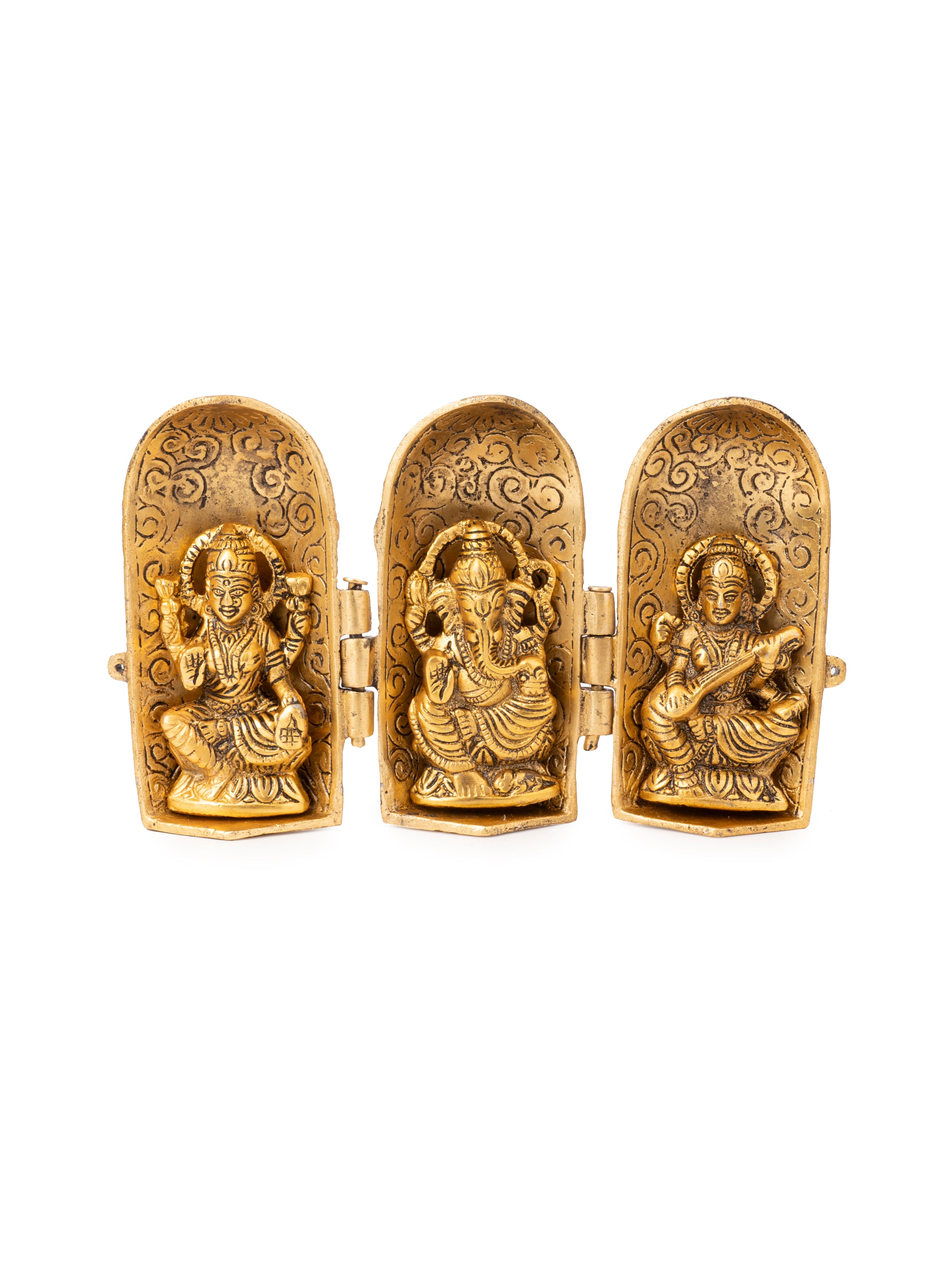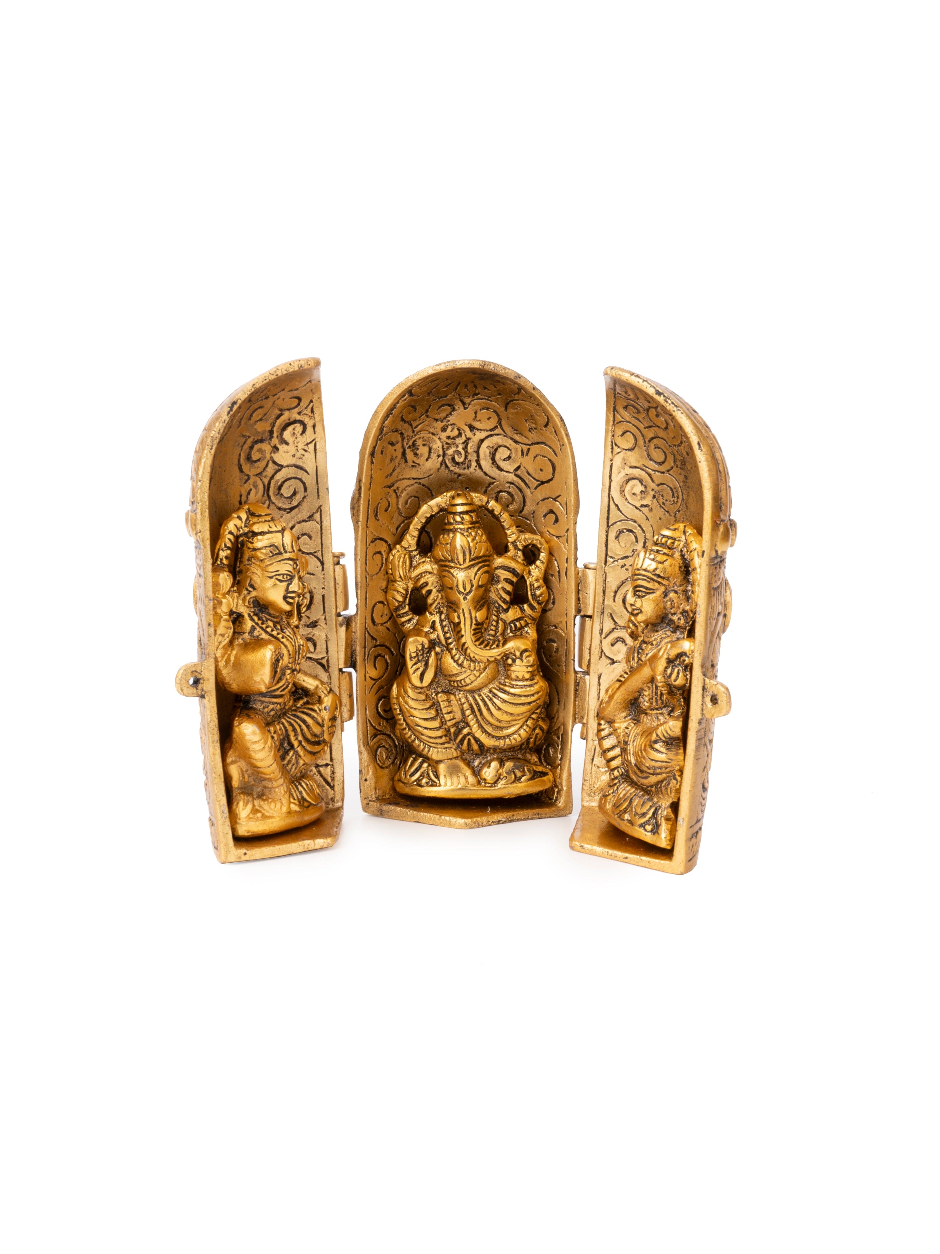 This classic work of art, artistically depicts the holy Lord Ganesh, Devi Laxmi and Devi Saraswati. Made of aluminium with antique gold finish on top, this folding temple or darbar is perfect to bring home the spiritual energies you need to achieve prosperity, wealth and knowledge. Place it in your pooja room or gift it to your dear ones on any occasion to convey your best wishes.