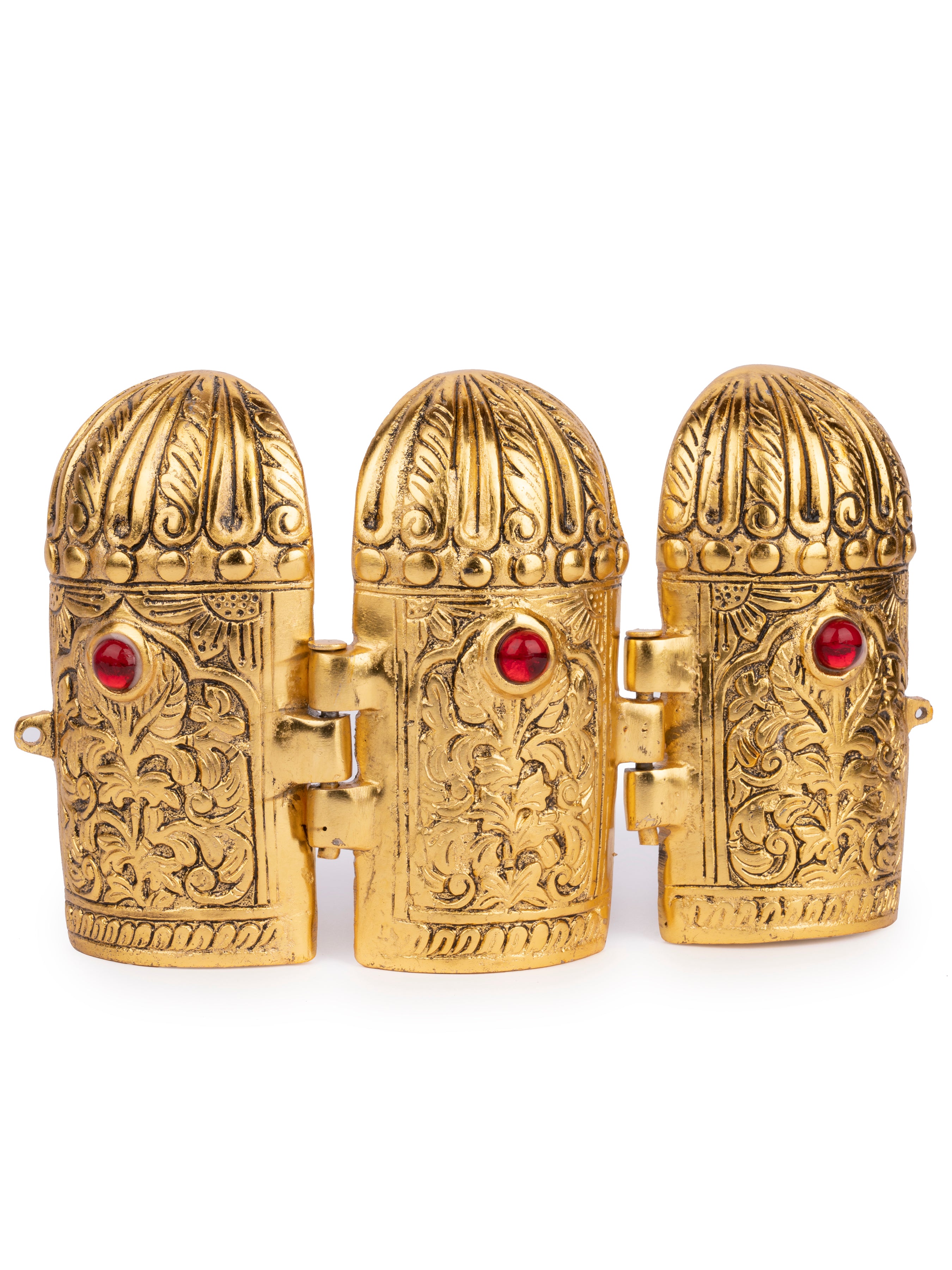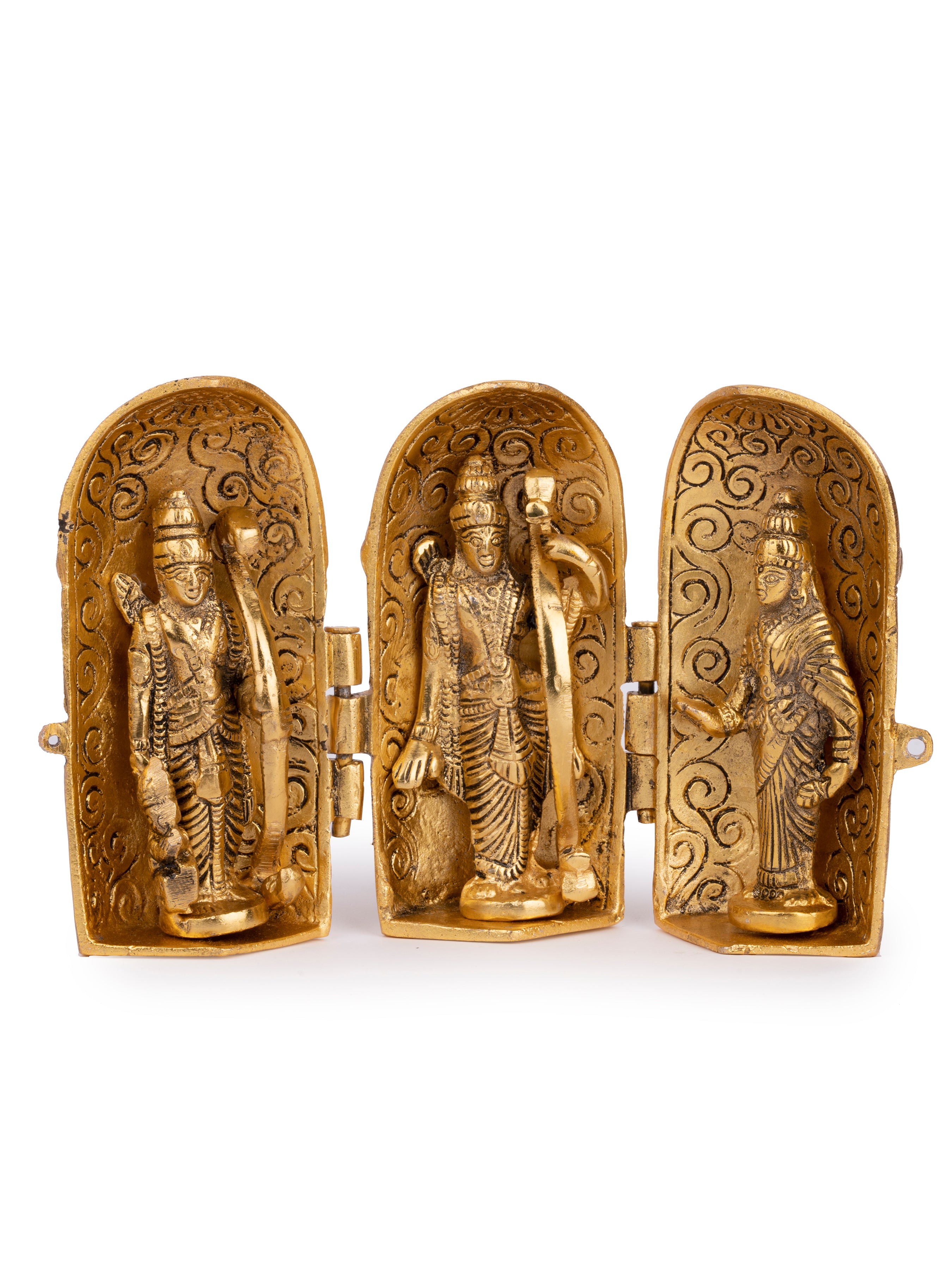 This beautiful and spiritual gift item consists of idols of Lord Ram, Lord Lakshman with Lord Hanuman at his feet and Goddess Sita. It is foldable and comes in a box packing, ideal for all occasions gifting or for placing in your home temple. It is made of Aluminium metal with antique gold finish.