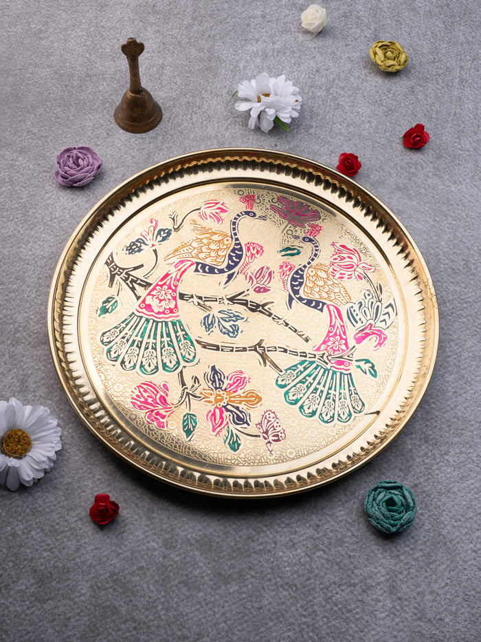 Handcrafted Brass Plate with Colorful Peacock Design - 10 inches