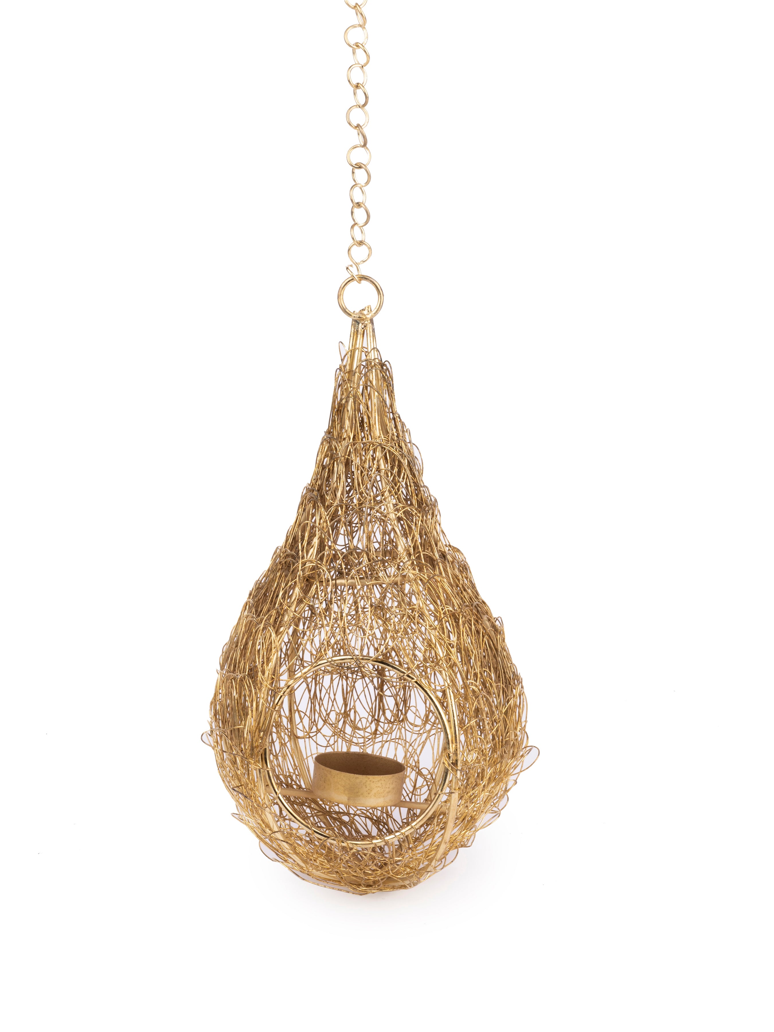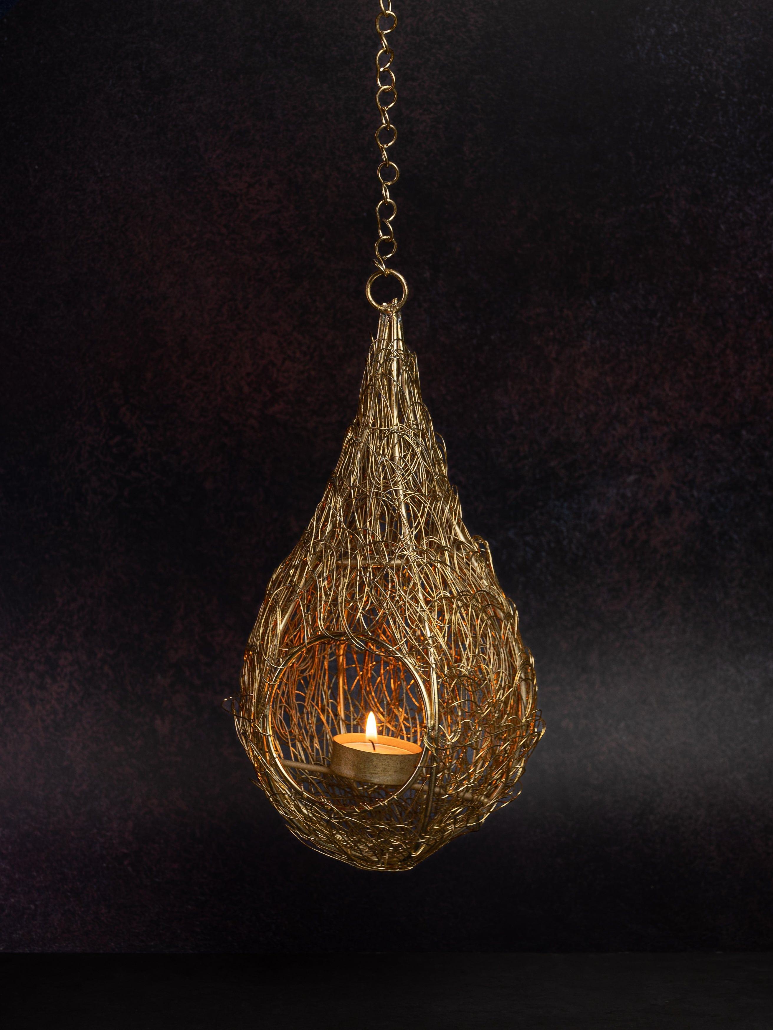 A gorgeous gold color bird's nest hand woven from metal wires into a teardrop shape. The intricate detailing ensures that this looks stunning during day and creates beautiful patterns at night. The nest can be hung from a tree or as an accent inside the house, balcony, terrace etc. with the metal chain from top. The holders sparkle and glow when a tea light is added, giving a warm and romantic light.