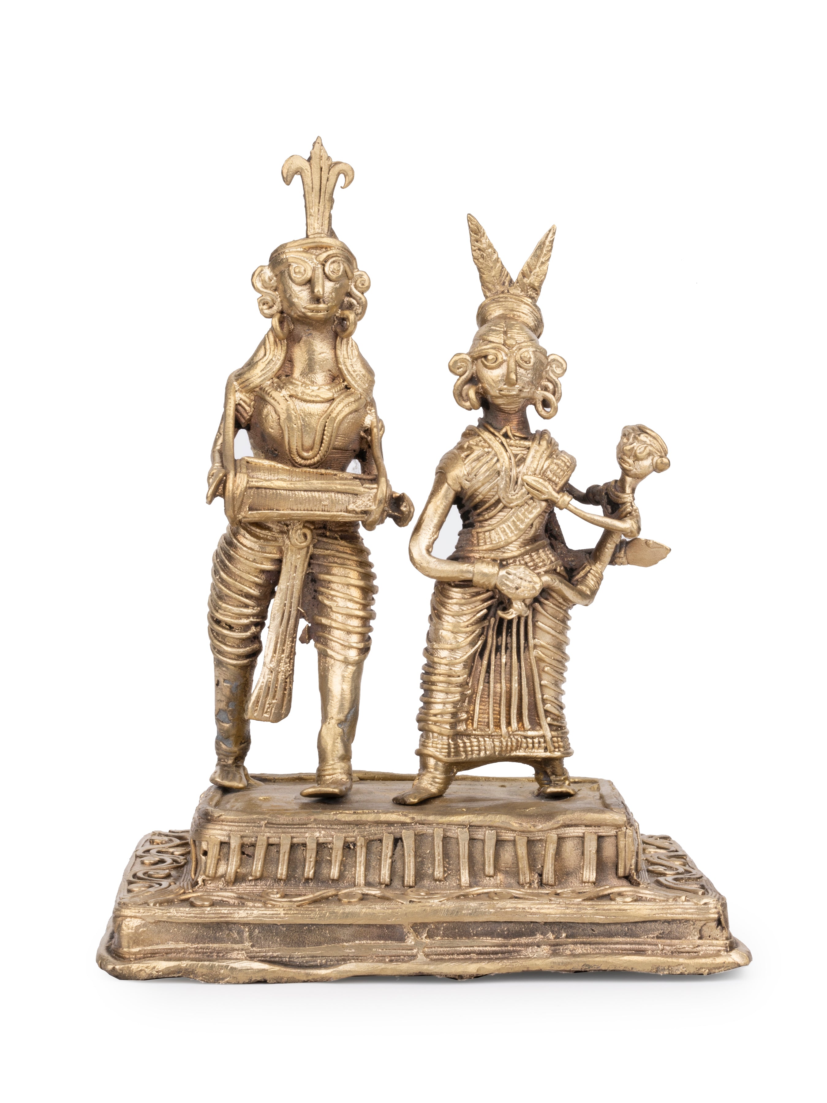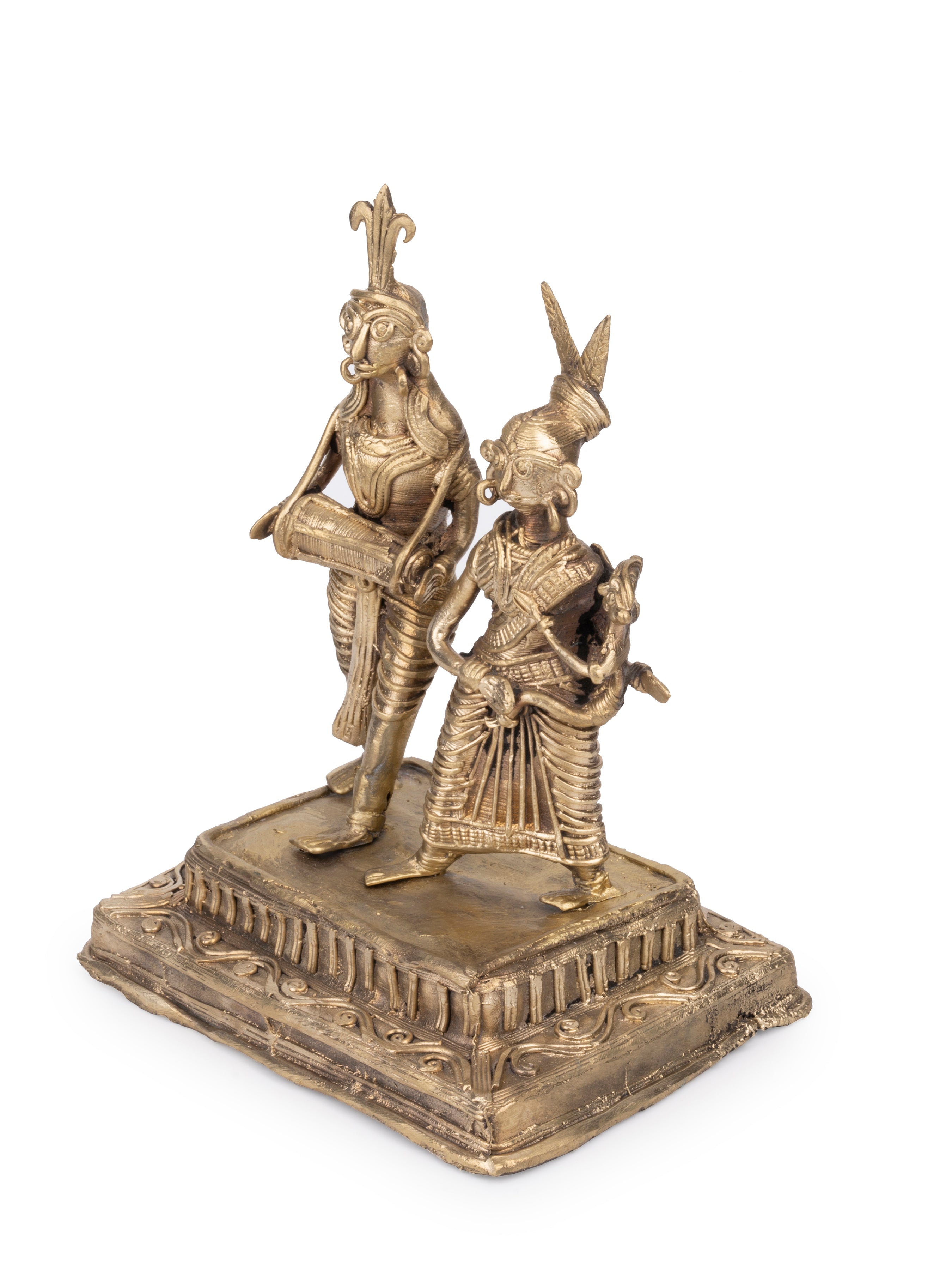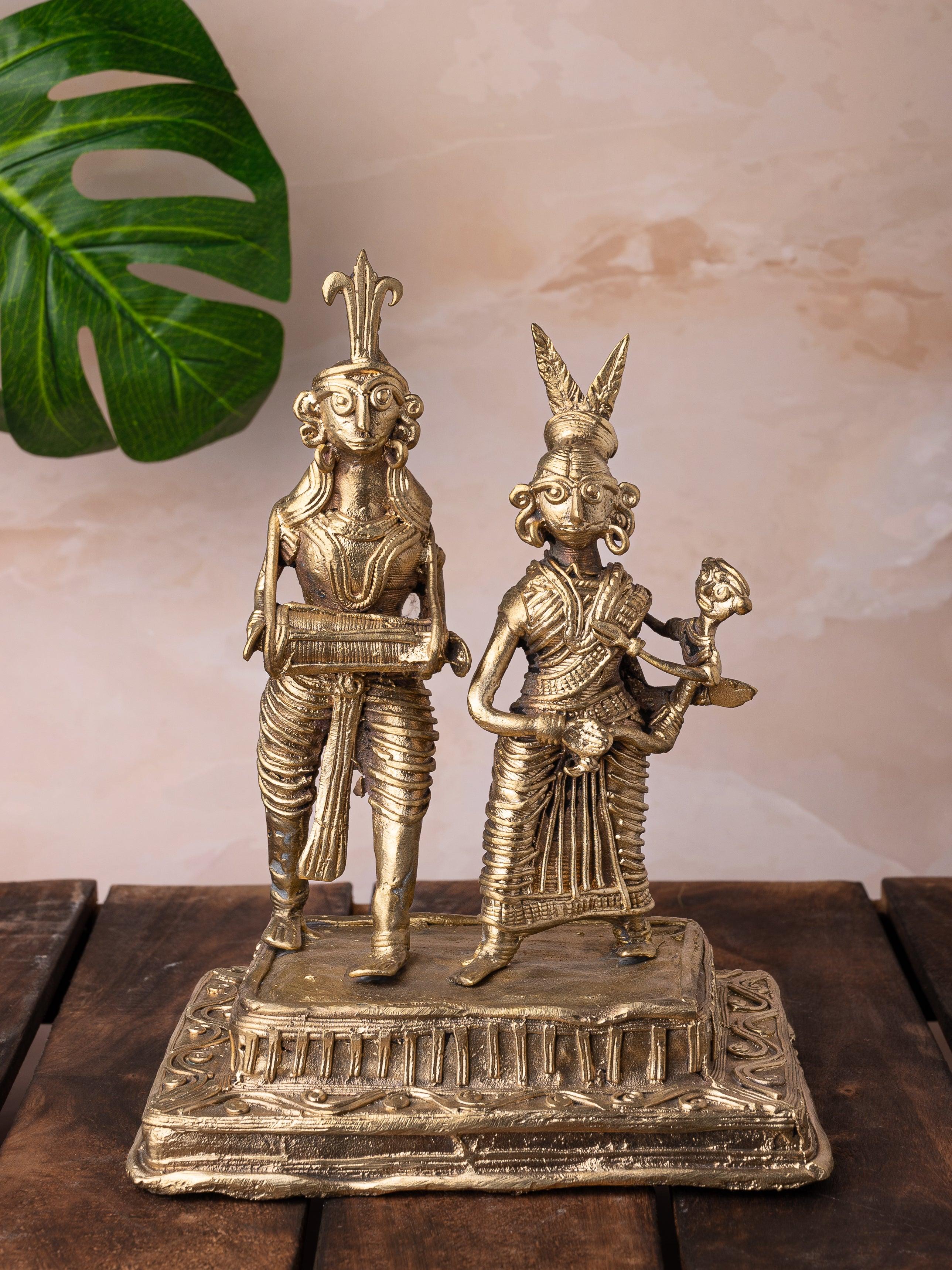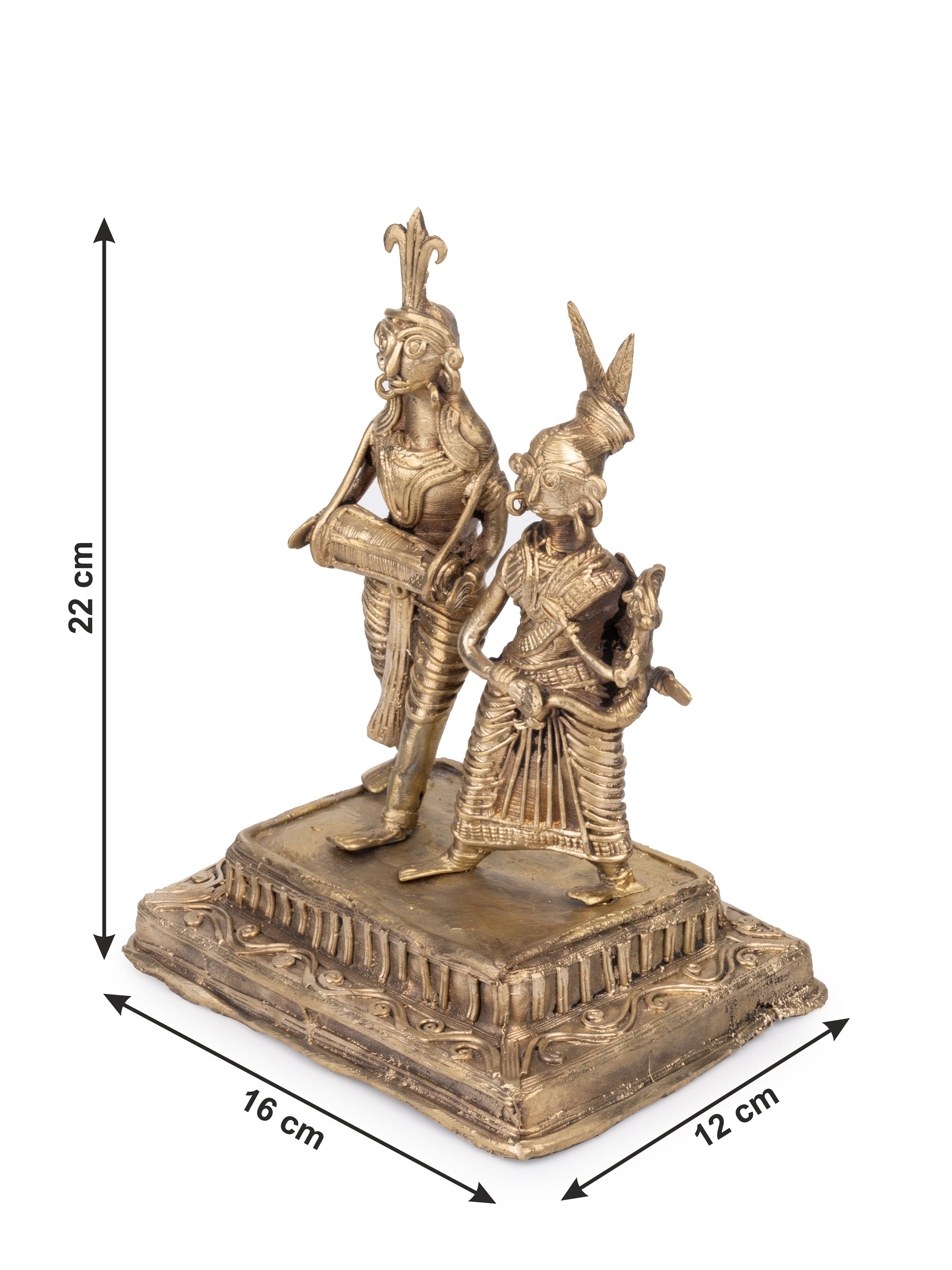 A beautiful Dokra craft artifact displaying a tribal couple in singing and dancing mode. This makes for a great ethnic Indian gift & also looks stunning on a side table or the mantle piece. These figures are made of brass as per the Dokra craft or lost wax casting method.