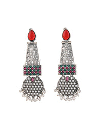 MAURYANA - Oxidised silver pair of earrings with red stone embellishment - 4 inches