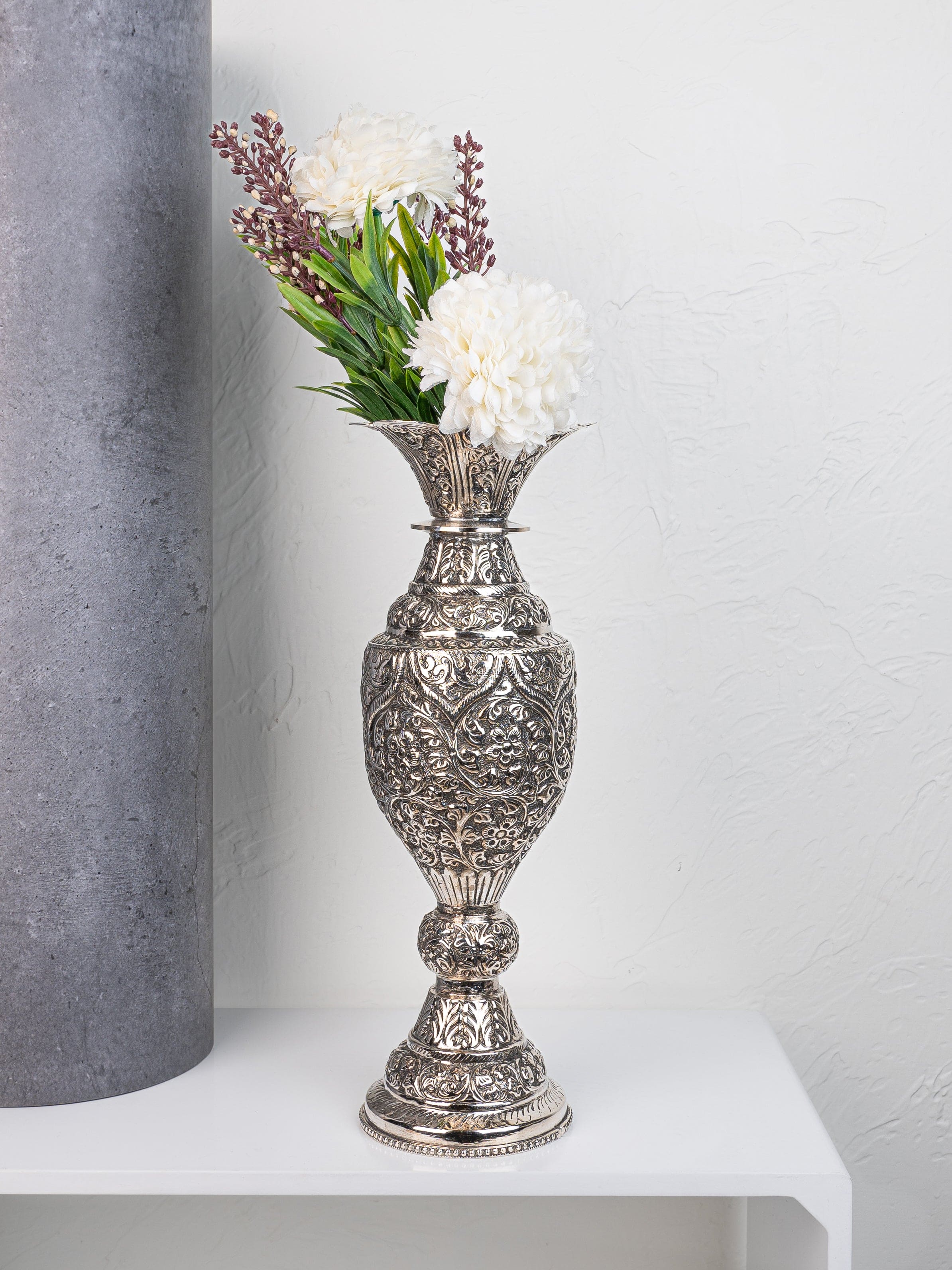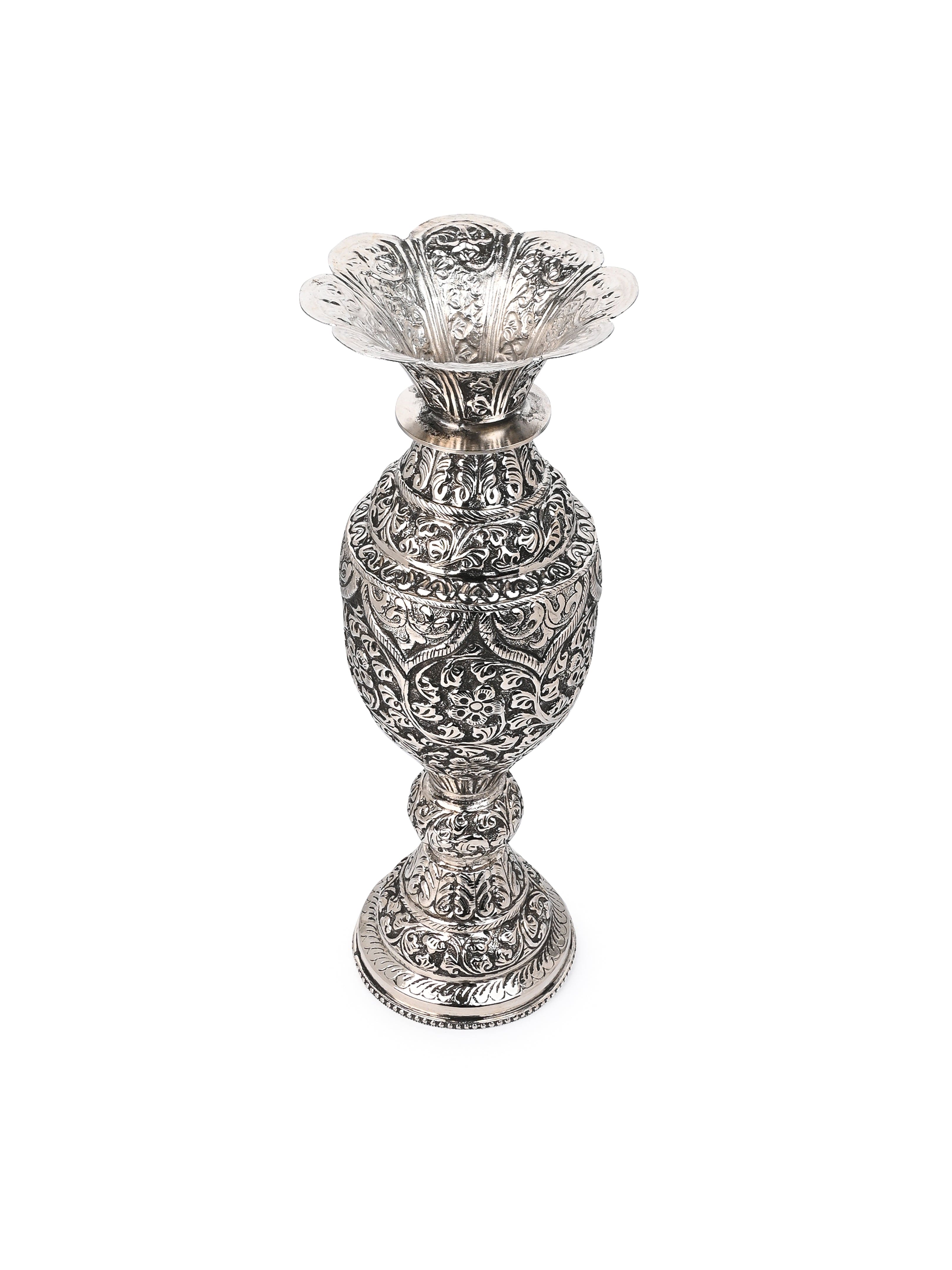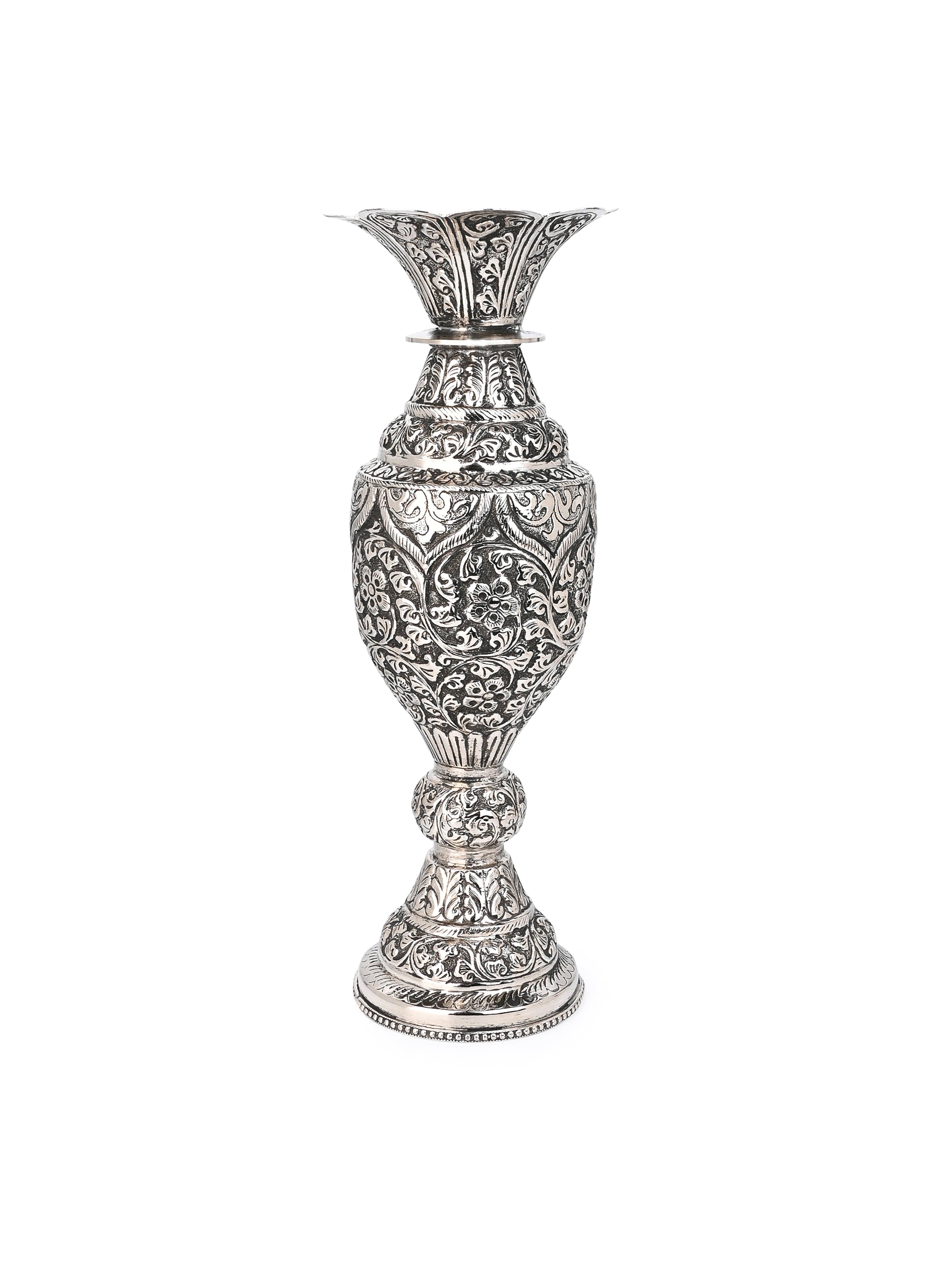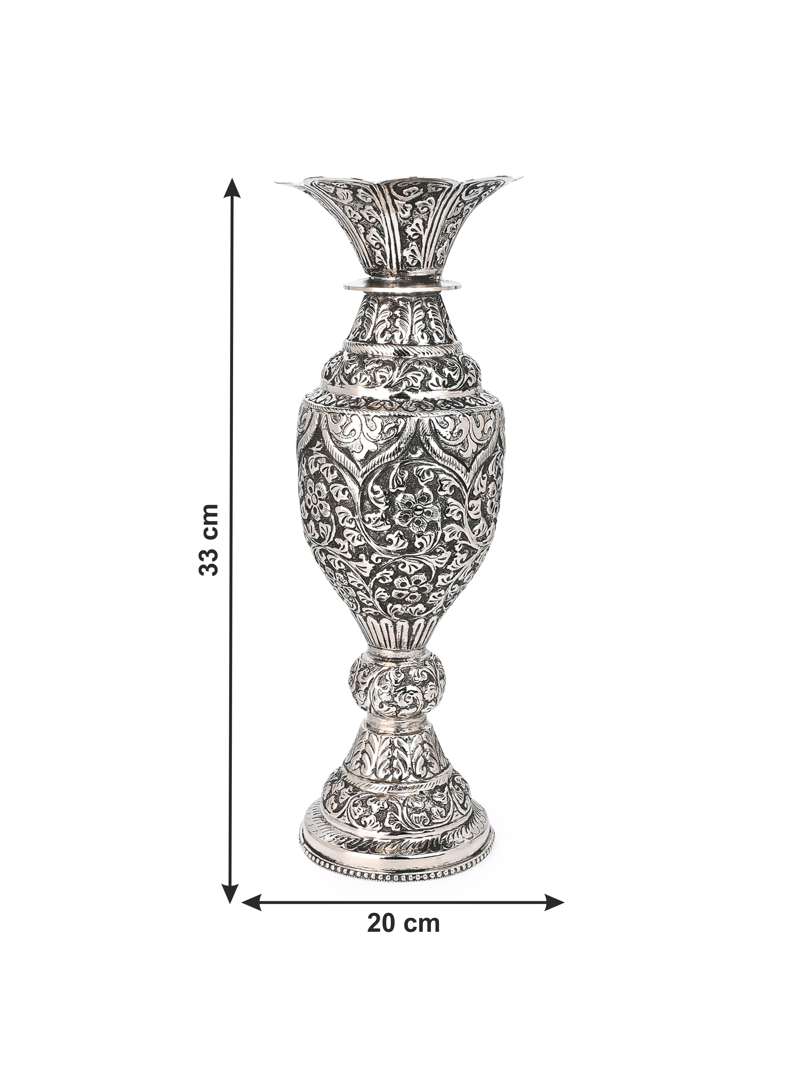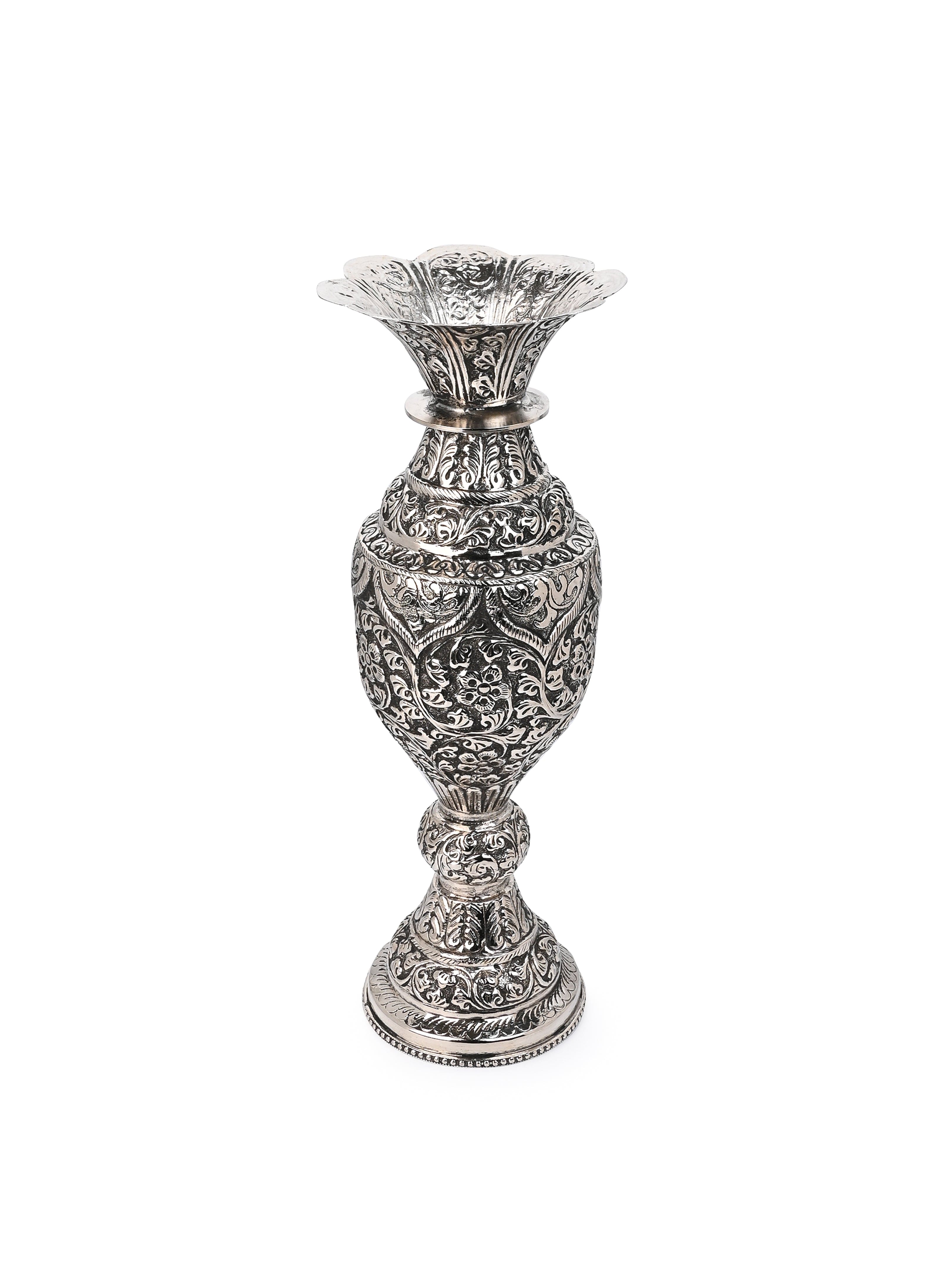 Indulge in the royal rhapsodies of vintage silver accent pieces rooted in traditional craftsmanship and design. This intricately hand crafted vase with oxidized silver plating over brass, suits every ambiance and makes a powerful statement when gifted.