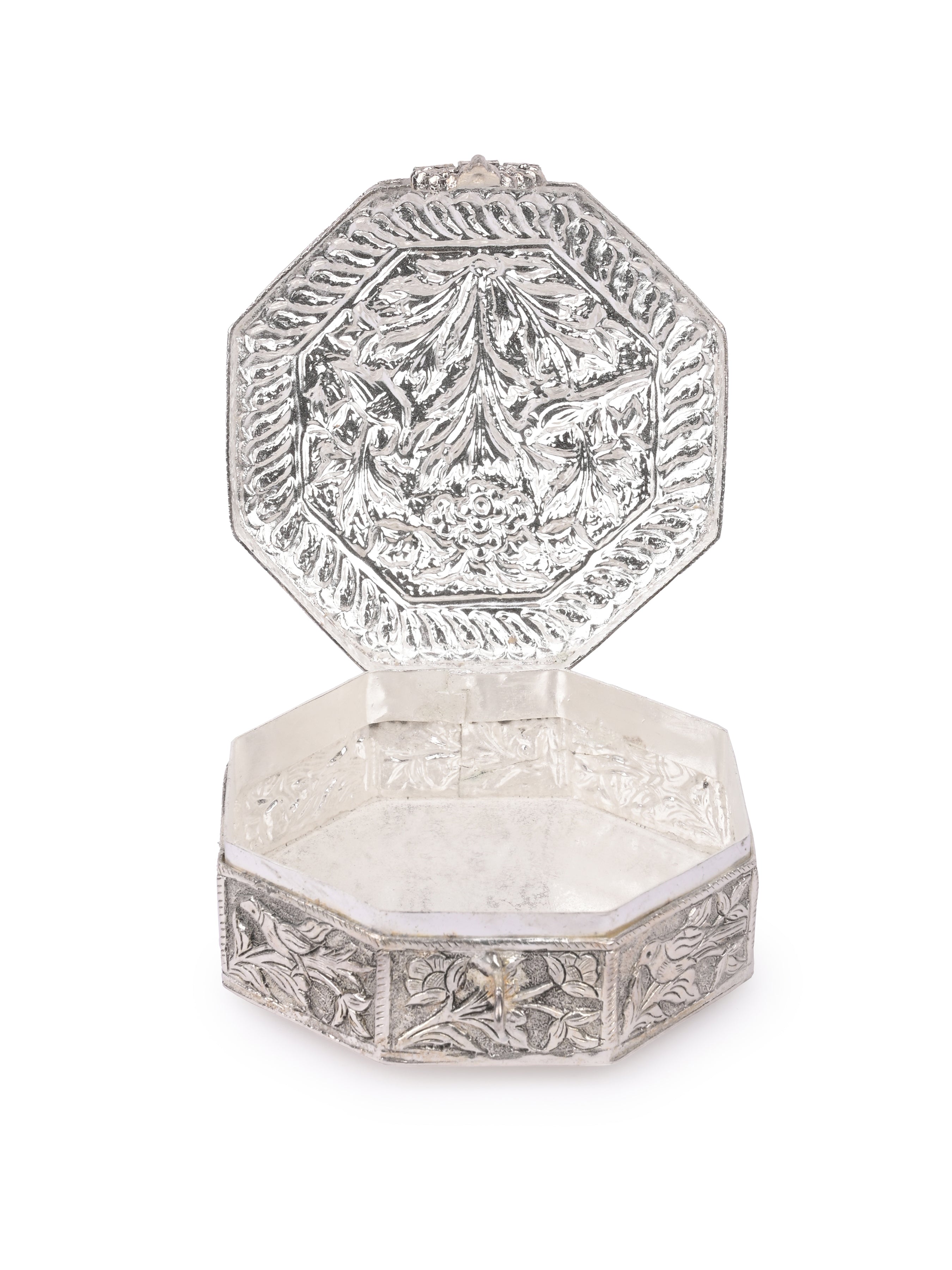 Flower and Leaves handcrafted very finely over a silver coated brass sheet and then oxidised to give that antique old finish. It can be used as a trinket box, candy box or a corporate gift box.
