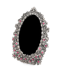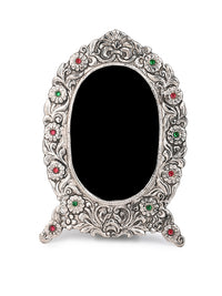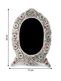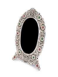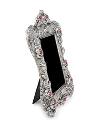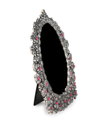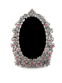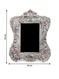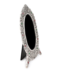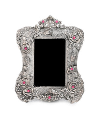 Handcrafted with oxidised silver finish, these unique frames feature intricate motifs all around, adding a regal touch to your cherished memories. Perfect for any mantle, side table, or shelf, our colorful stone embellished frames embodies both luxury and nostalgia, making them an ideal gift for any occasion.