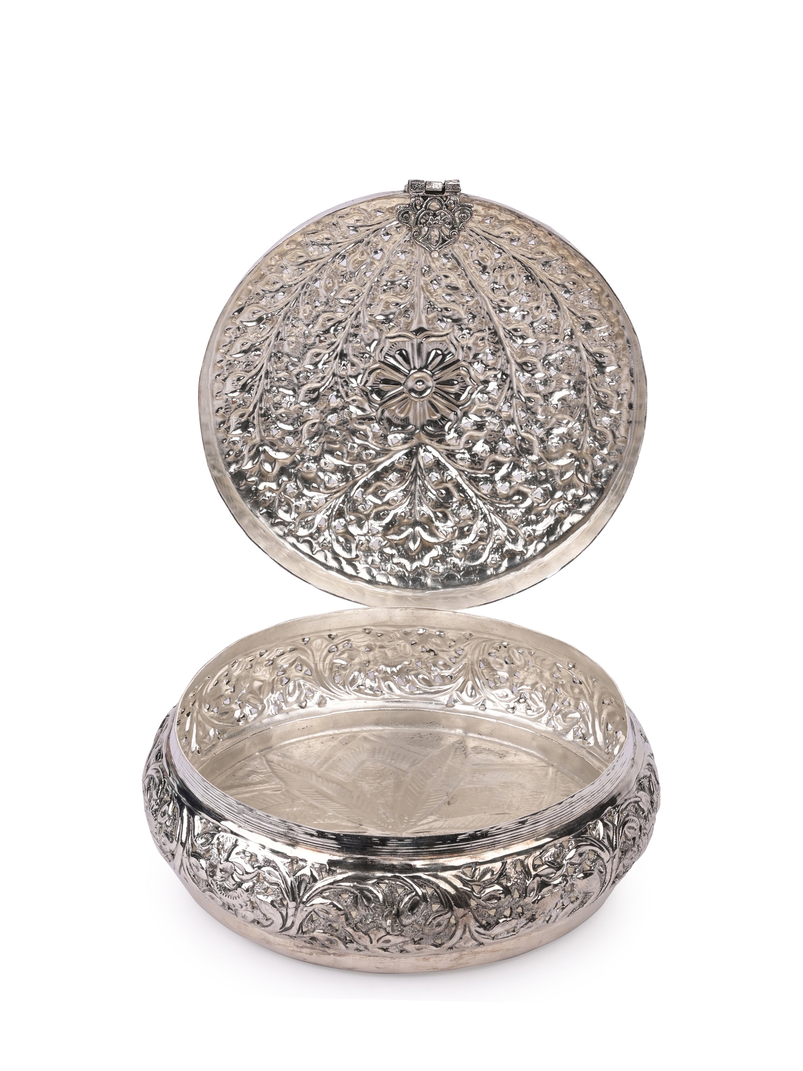 German Silver oxidised over a brass sheet and then hand carved very carefully to make this royal jewellery box. The gorgeous looking box can also be used for brides gift or corporate gift.