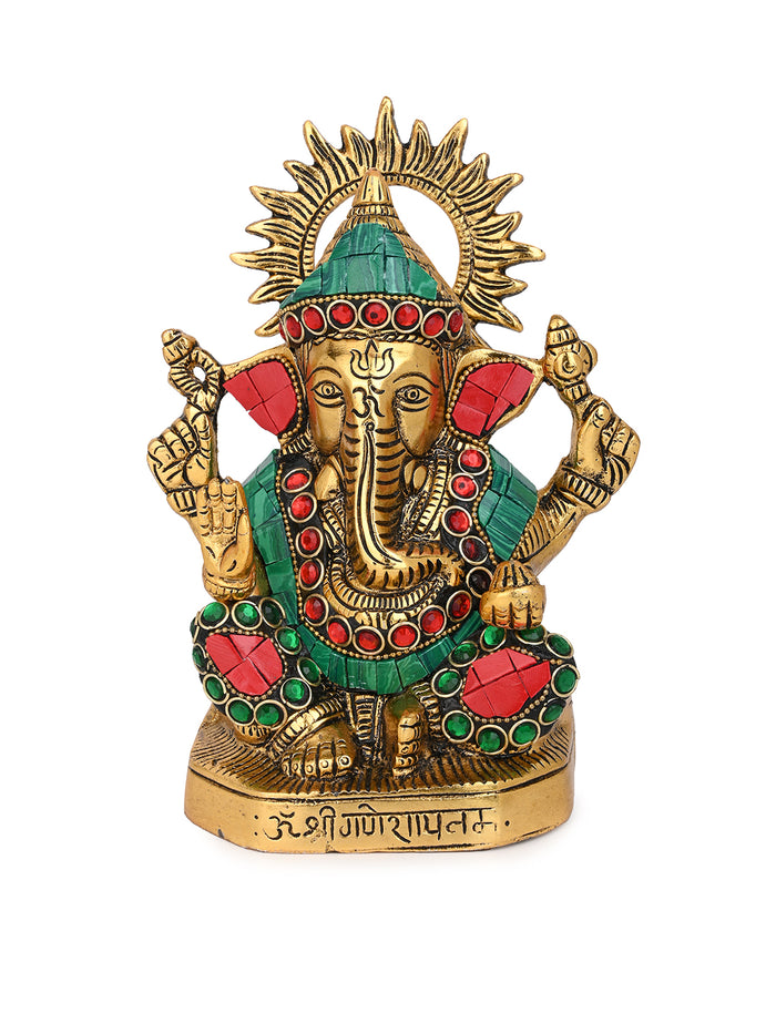 Aluminium Crafted Lord Ganesh Idol with Colorful Stone Embellishment - 8 inches