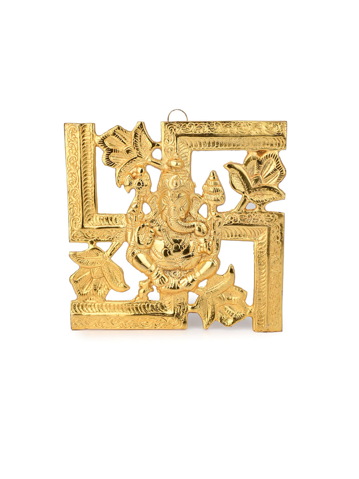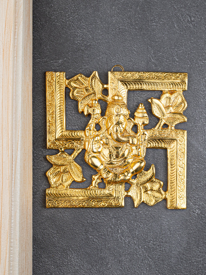 Metal Crafted Golden Swastik Ganesh Hanging Wall Decor - 8 inches