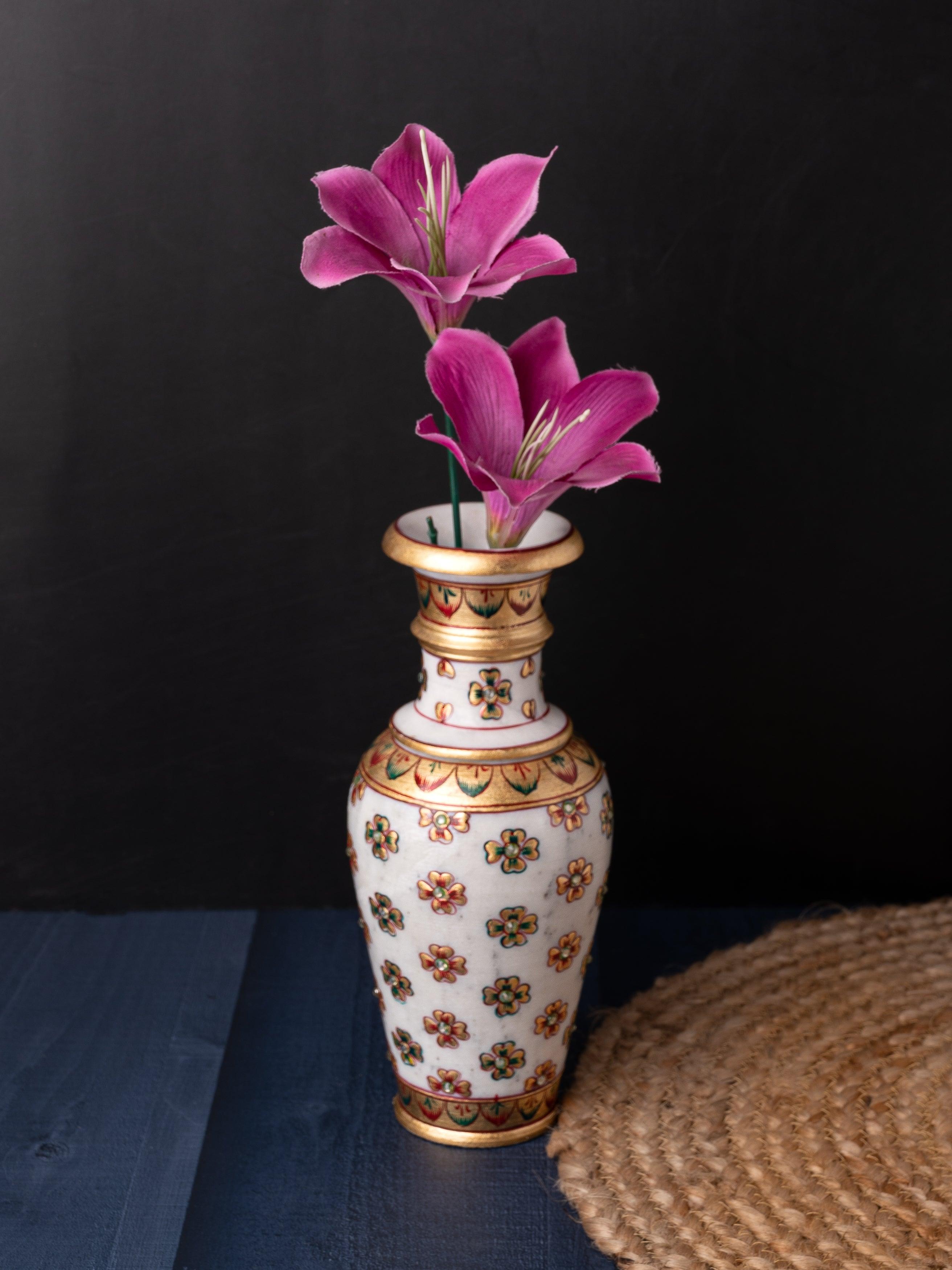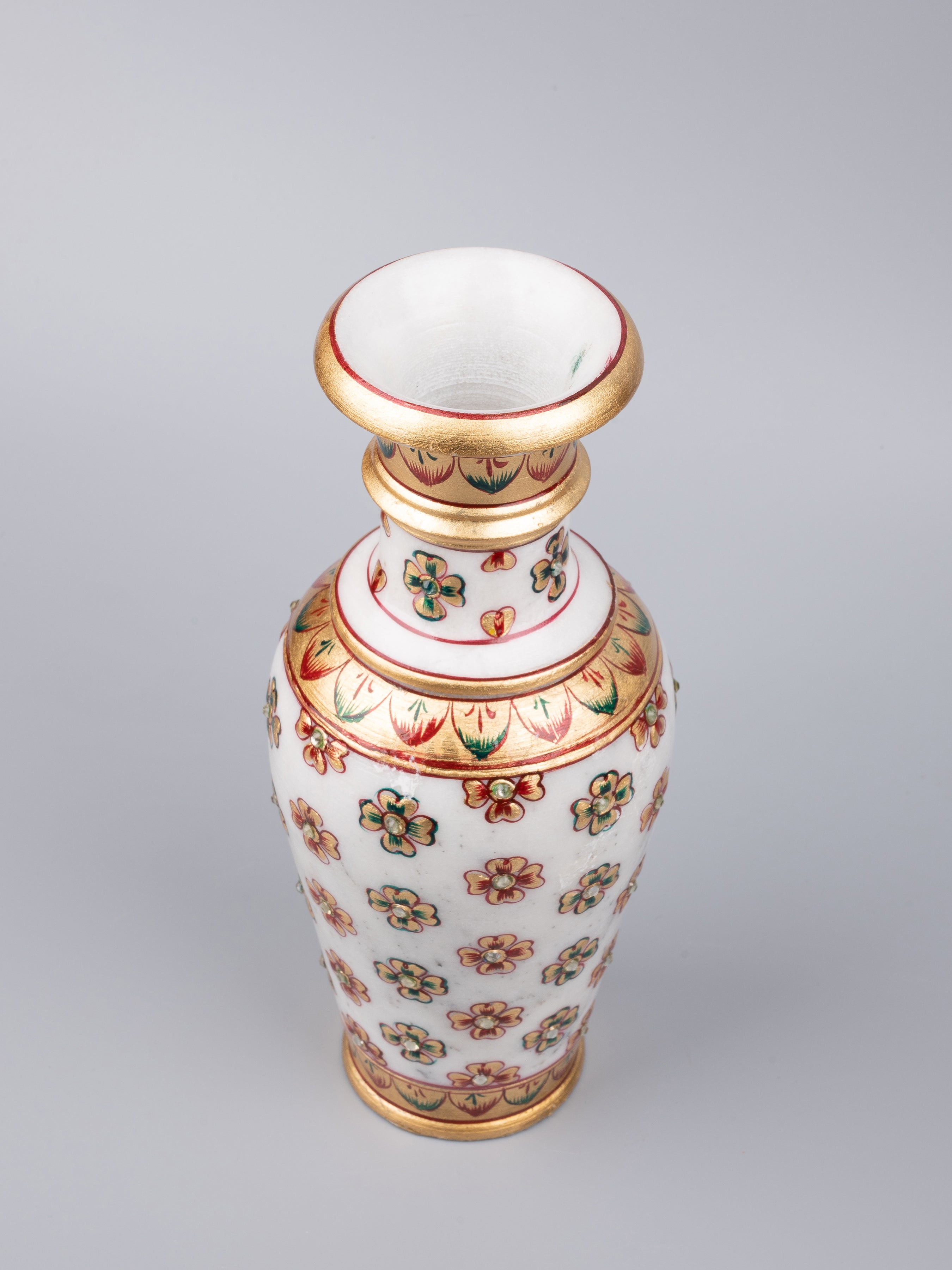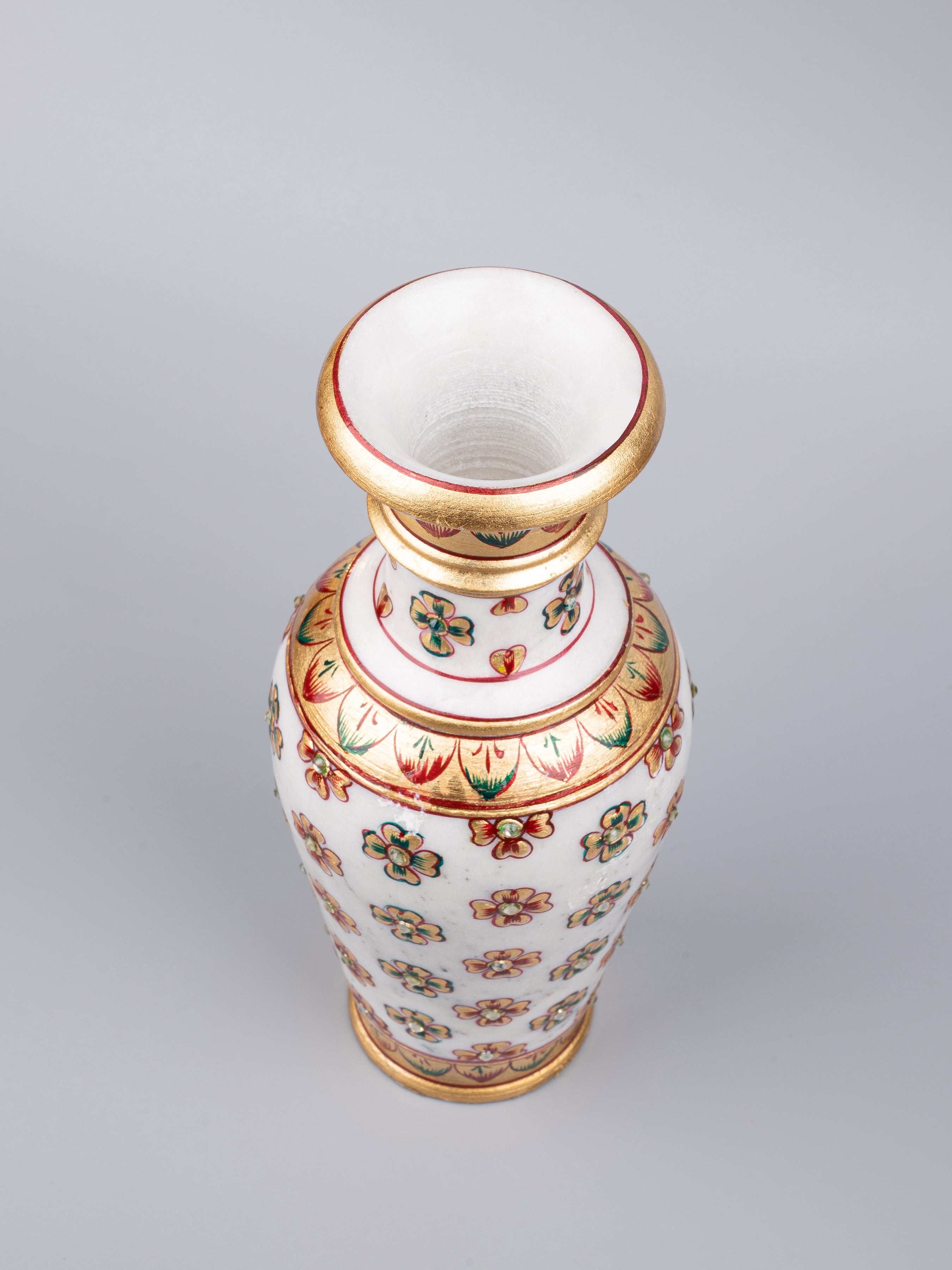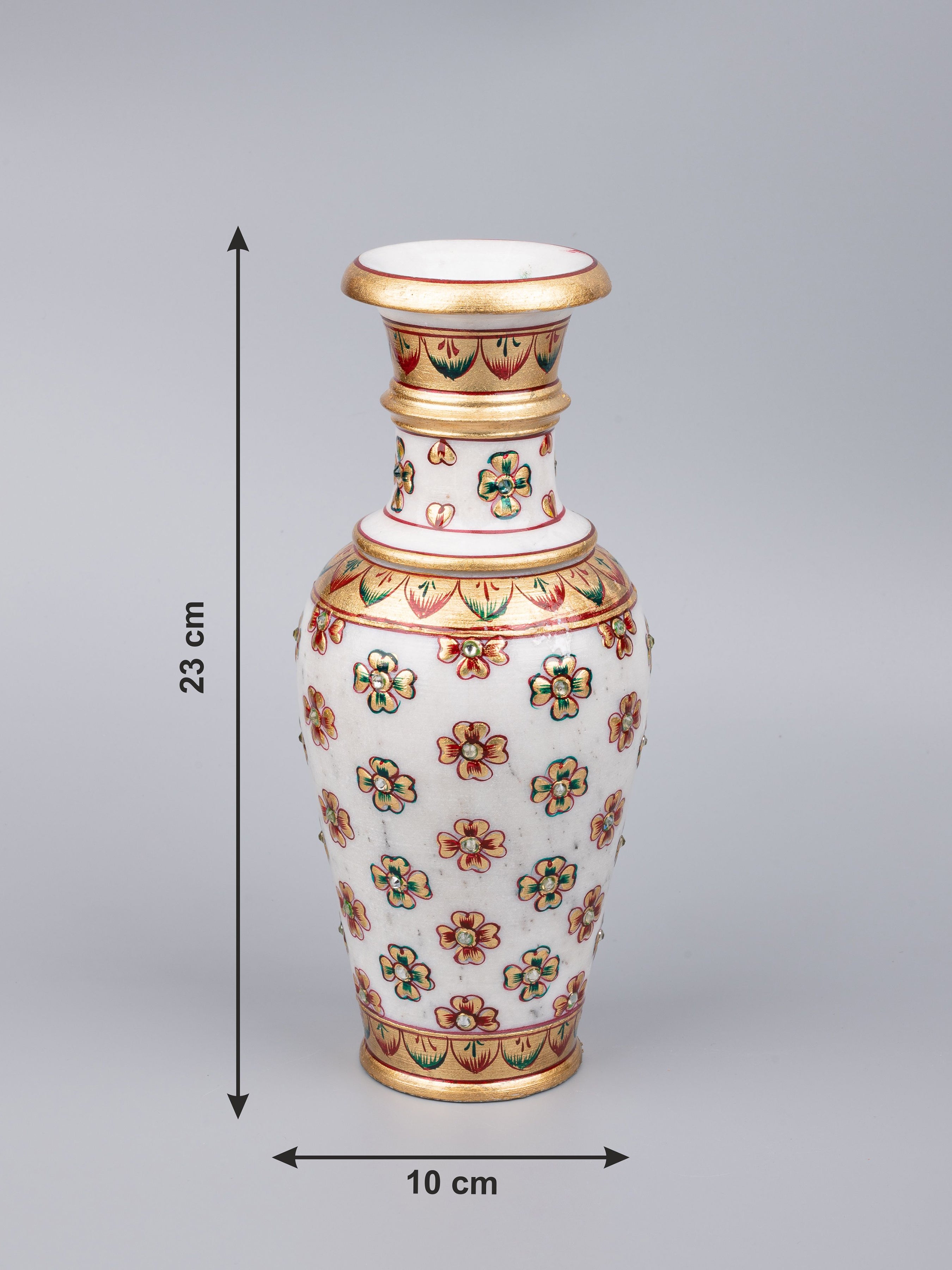 This vase is made of the premium quality marble and is painted with a combination of green and red color, decorated with shiny golden brocade. After being varnished to make the colors last longer, artificial stones are fixed all over its body which adds a traditional touch to the vase yet maintaining the elegant and royal design.