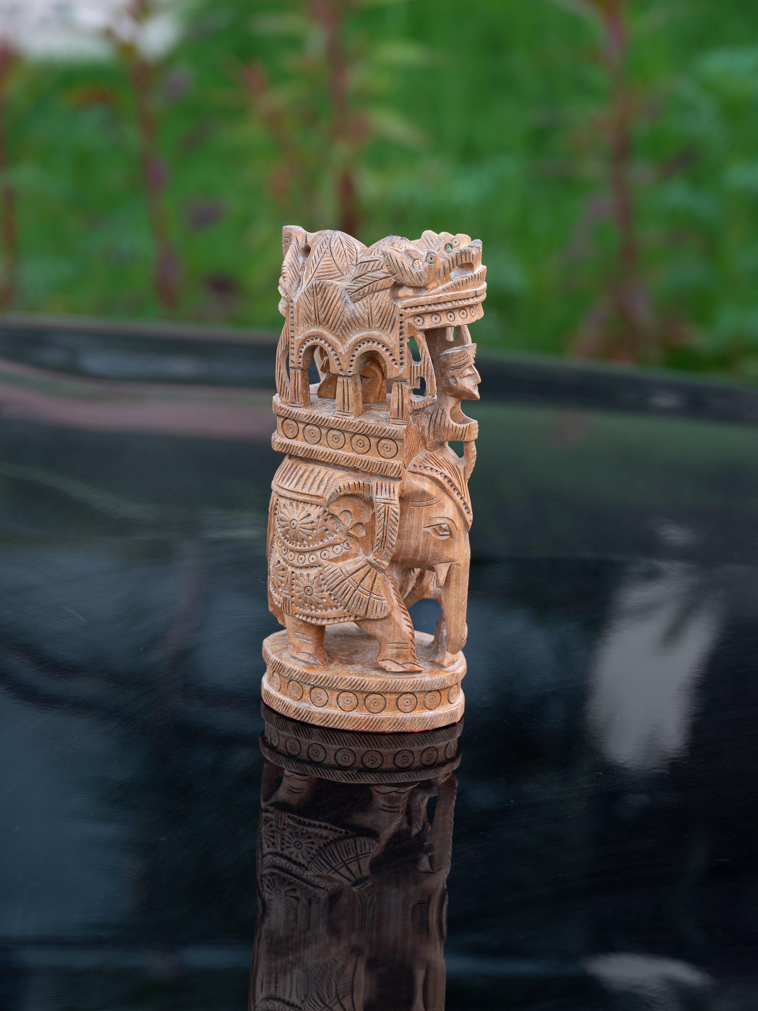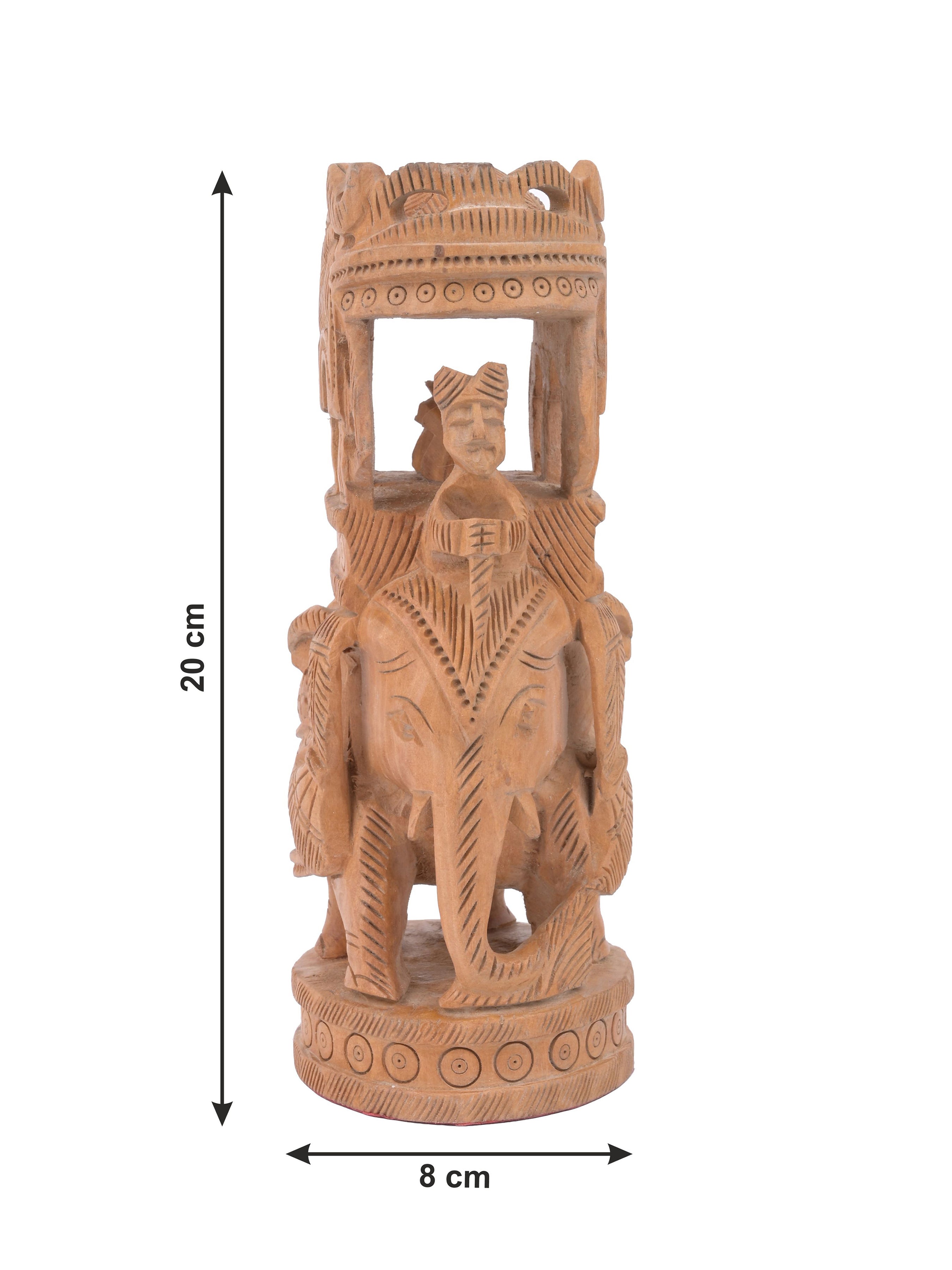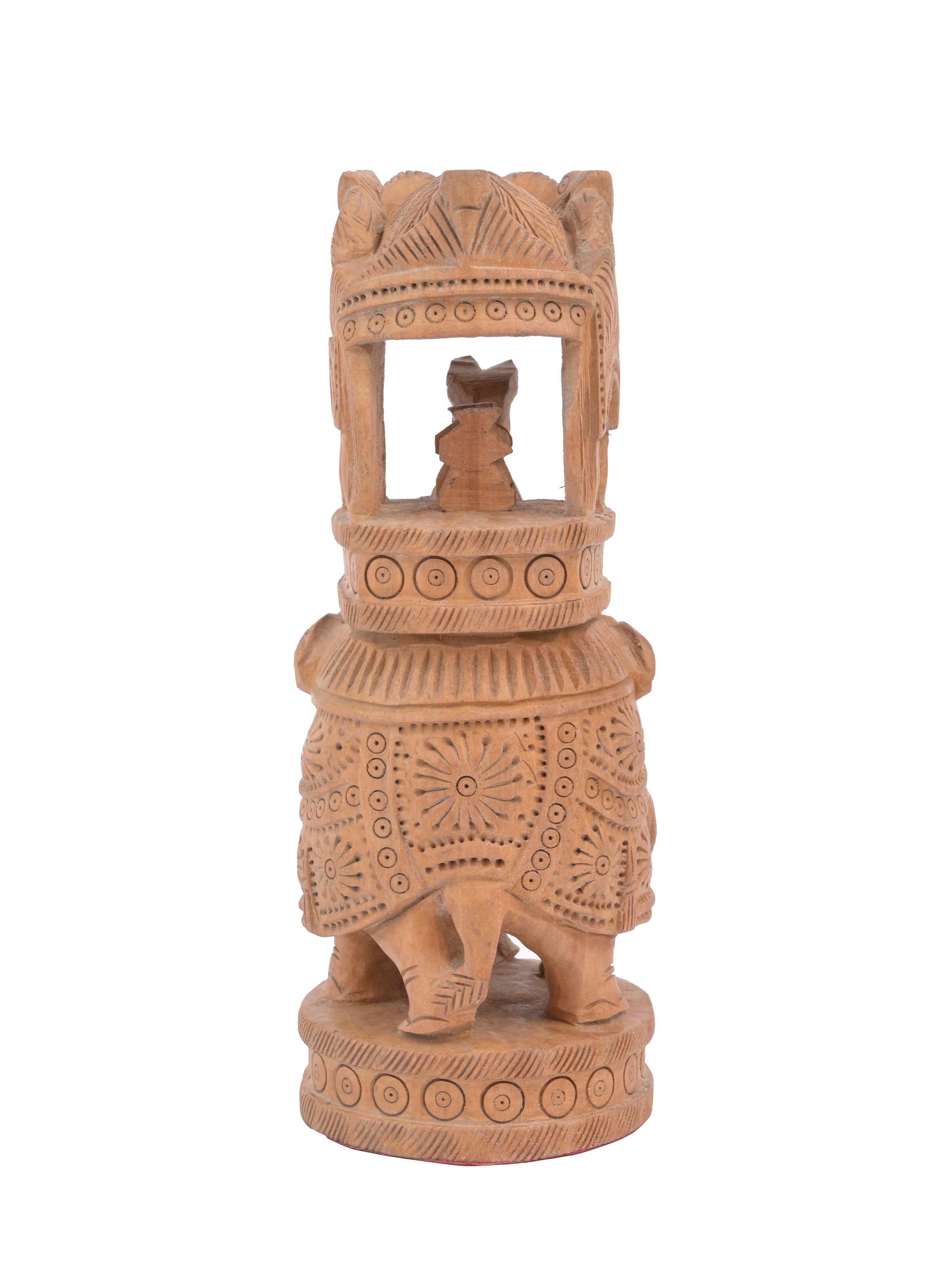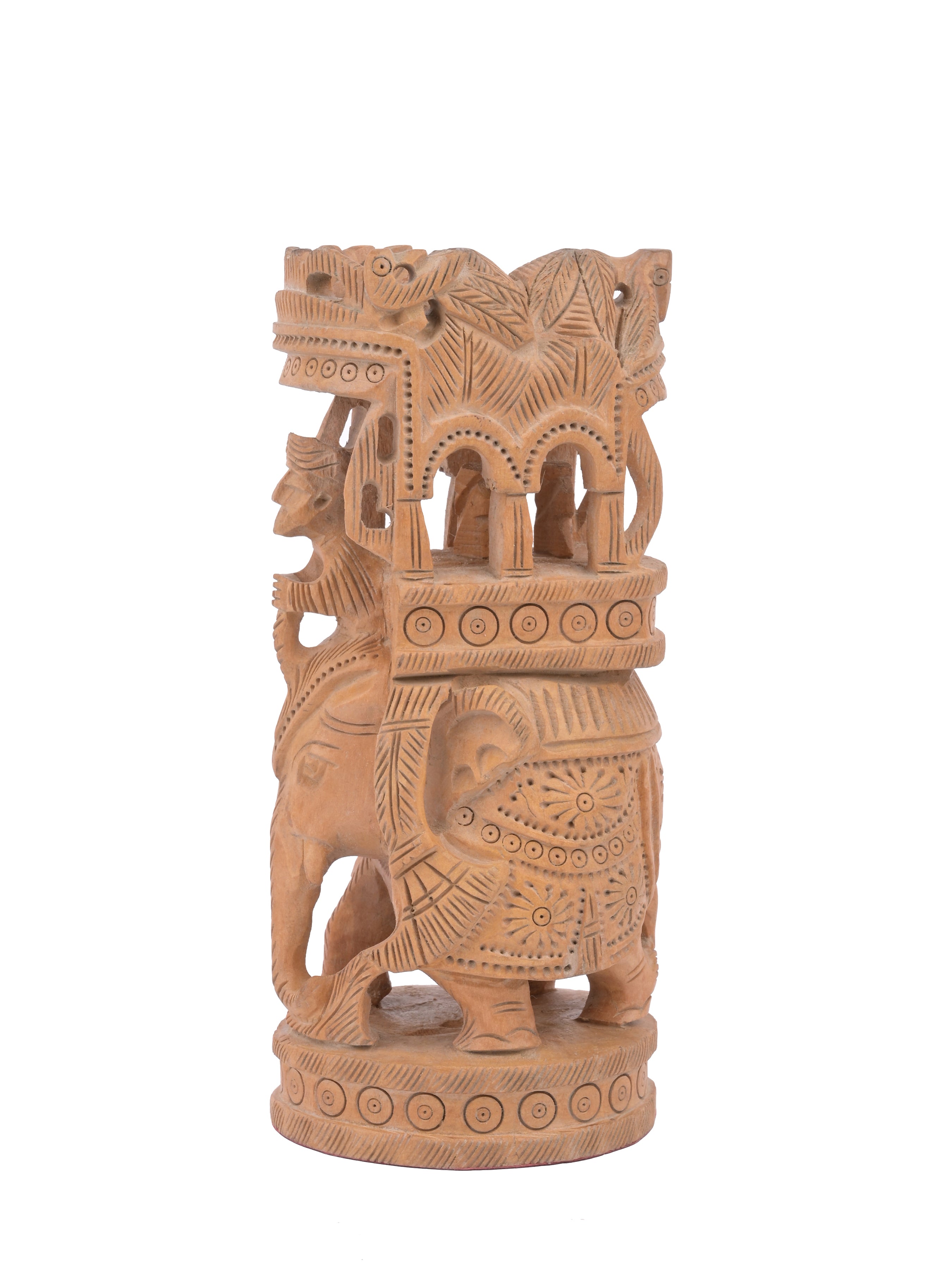 This ornate wooden ambabari elephant figurine with howdah represents tradition and art. A powerful elephant, majestically clad, bears members of the royal household in a howdah on his back. The magnificent pachyderm is dressed up with hand carved details on its headdress, trunk, and cloak. An elaborate canopy shades them from the blazing Indian sunshine. This magnificent hand carved, finely detailed wood sculpture is brought to you from crafts man of Pink city, Jaipur.