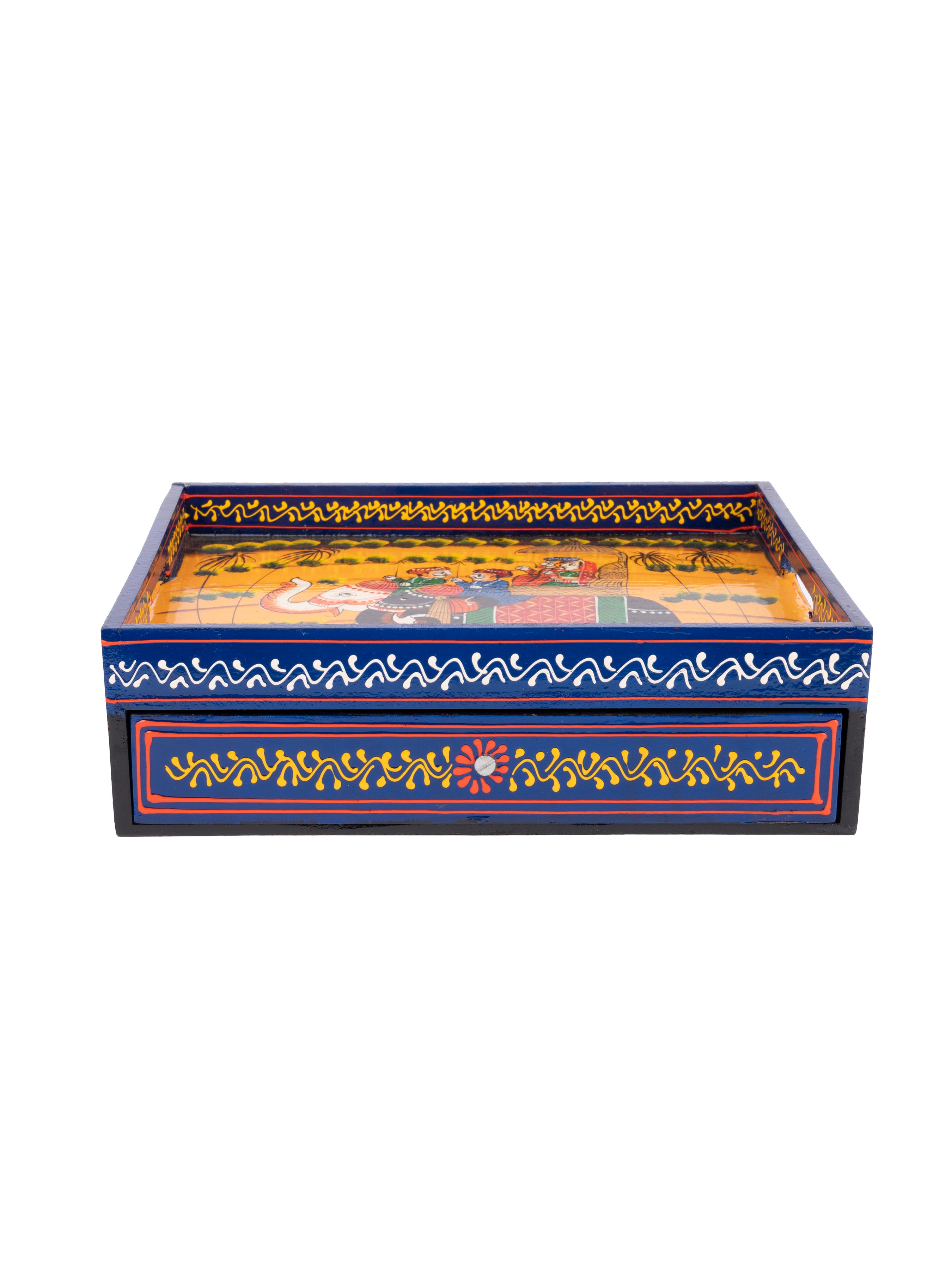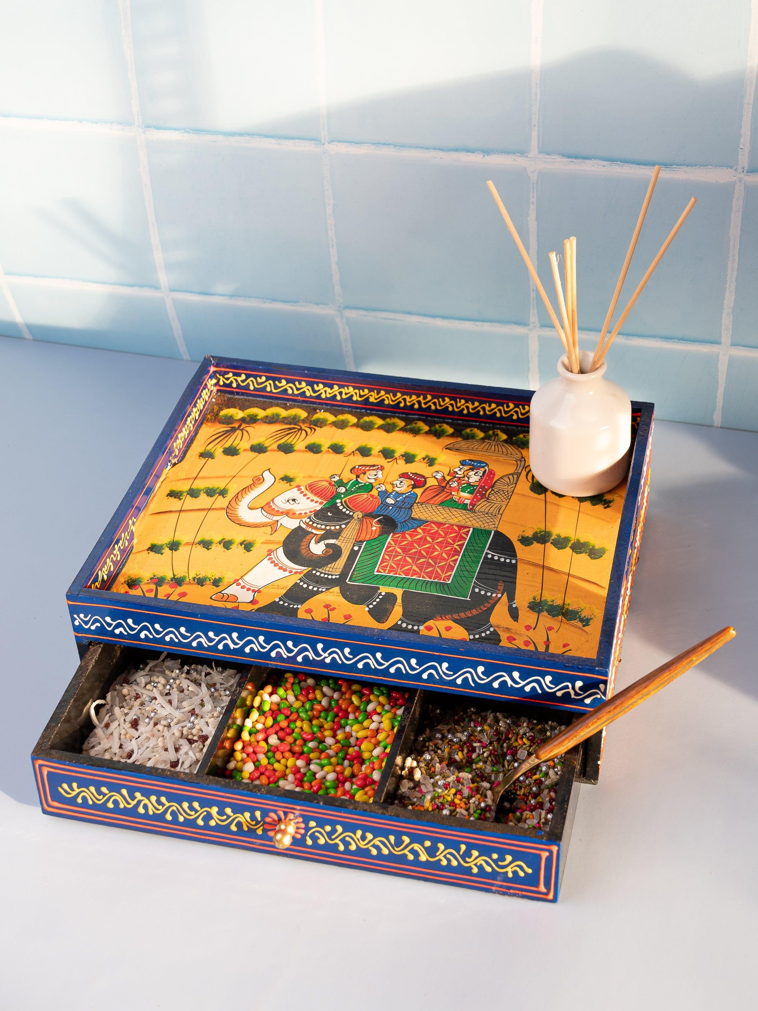 This versatile tray is built with MDF and comes with a bottom drawer, allowing you to store all the small items that would otherwise clutter your coffee table. It’s a clean and simple storage unit along with a serving tray on top so you can even store tea bags, sugar or snacks. The tray is hand painted with traditional Rajasthani design and has a rustic appearance. Beautiful and useful, this is a wonderful addition to your kitchen.