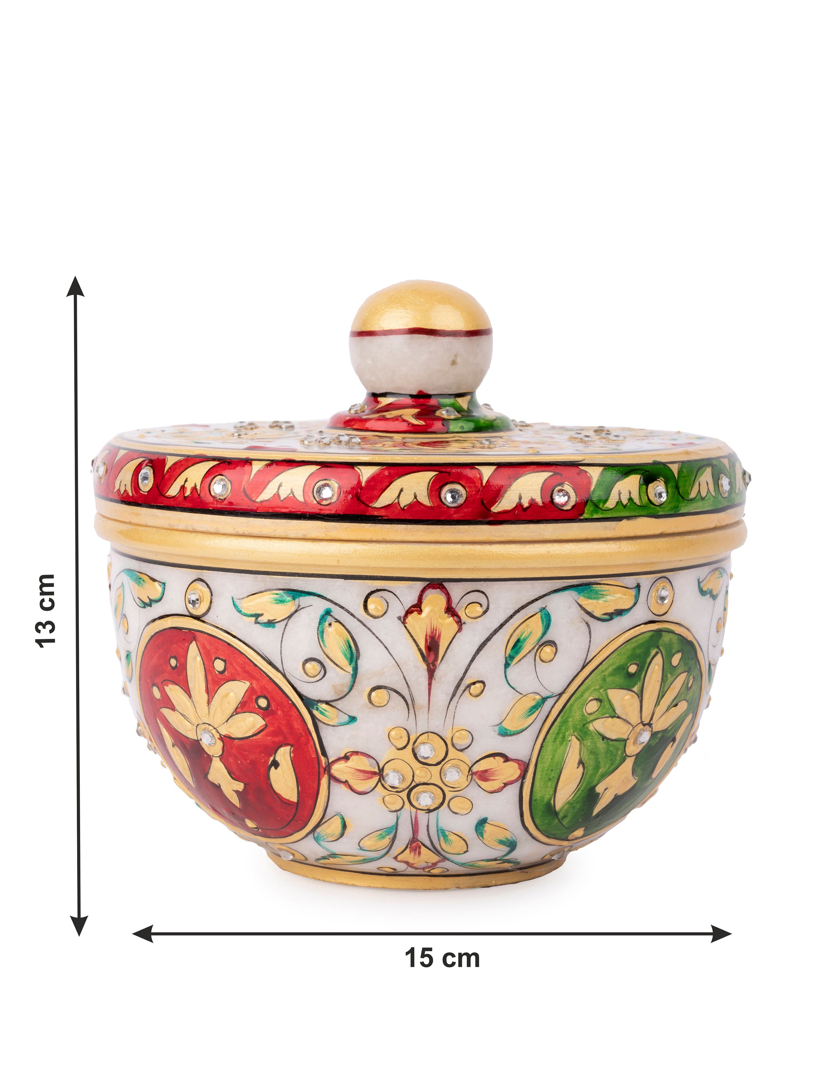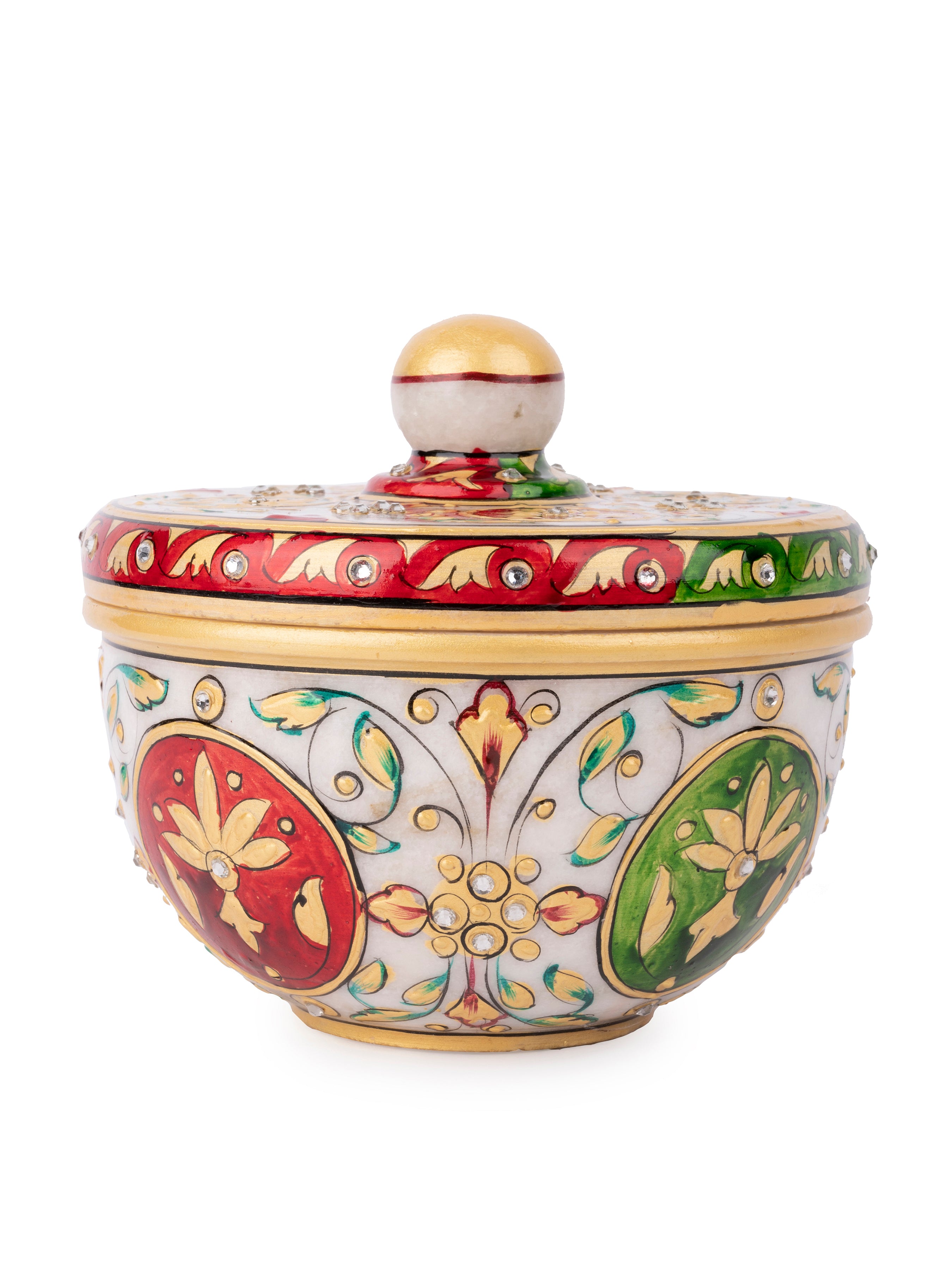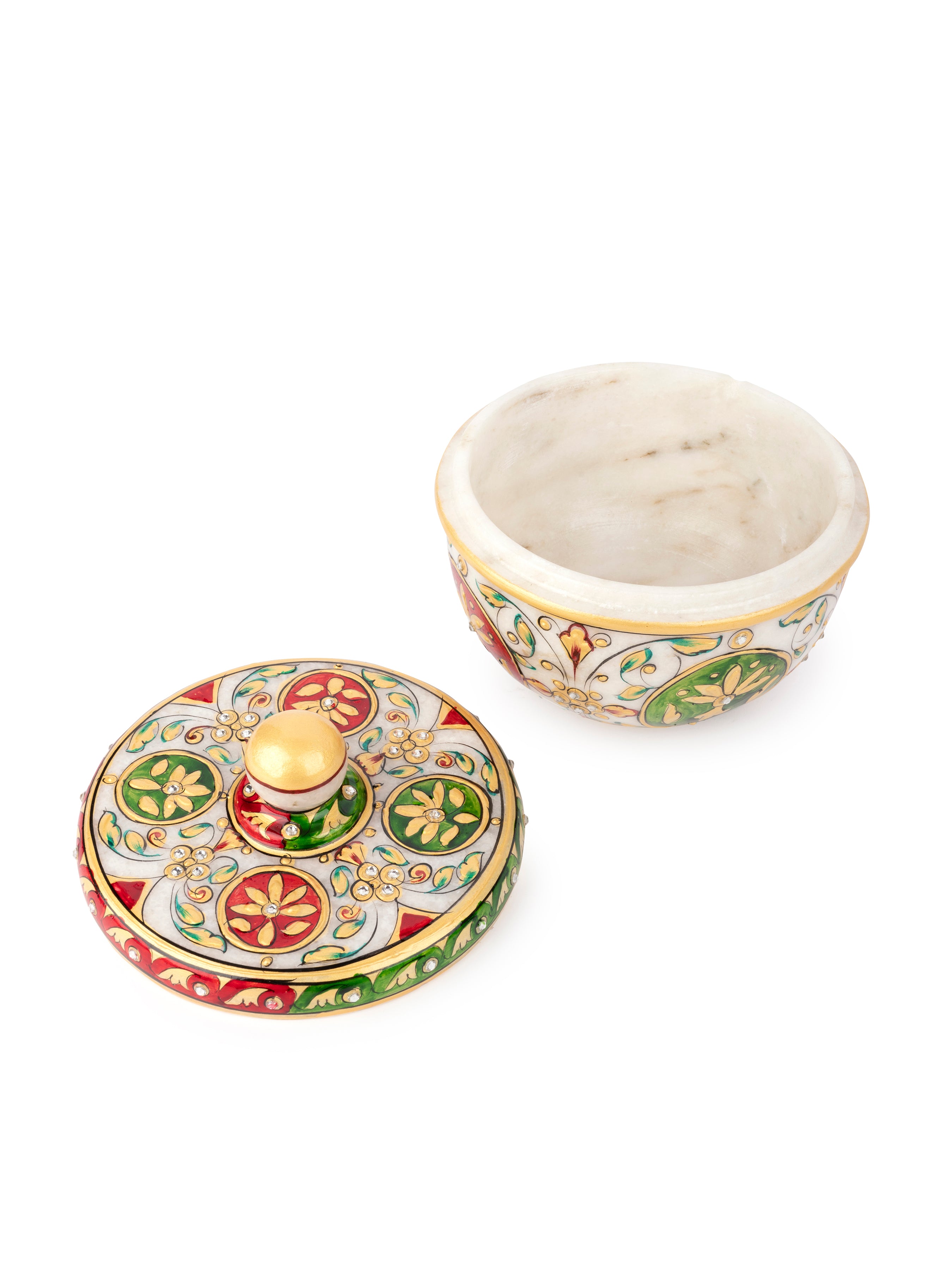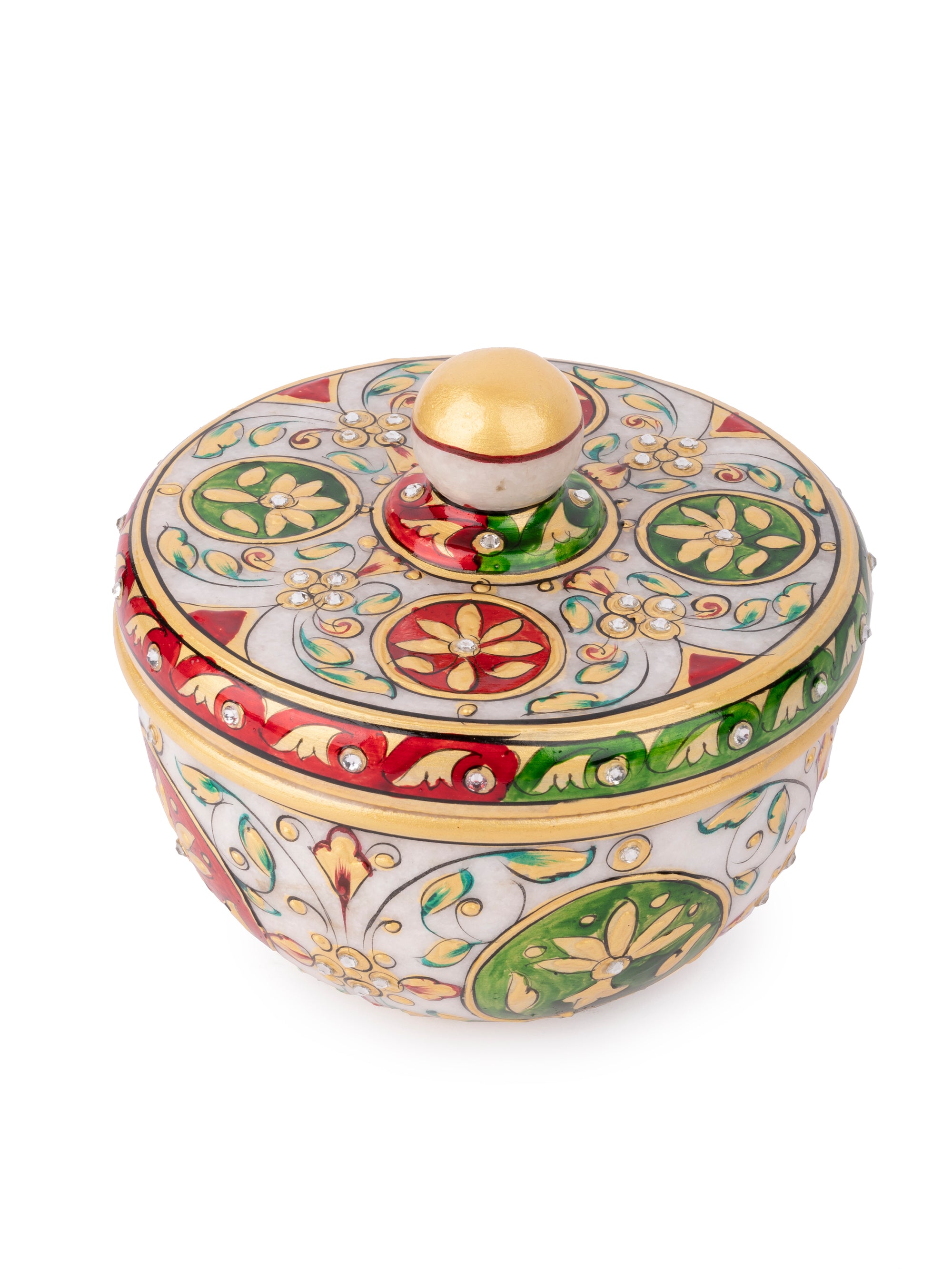 This colorful Meenakari design marble box depicts the beauty of the flora of northern India and the royalty of the Mughal era. Brought to the country hundreds of years ago by Iranian craftsmen, this box is a creative rendition of a time that appreciated, valued and encouraged unconventionally beautiful art forms. It can be used for jewelry storage & also can be used for decoration on coffee table & dressing table.