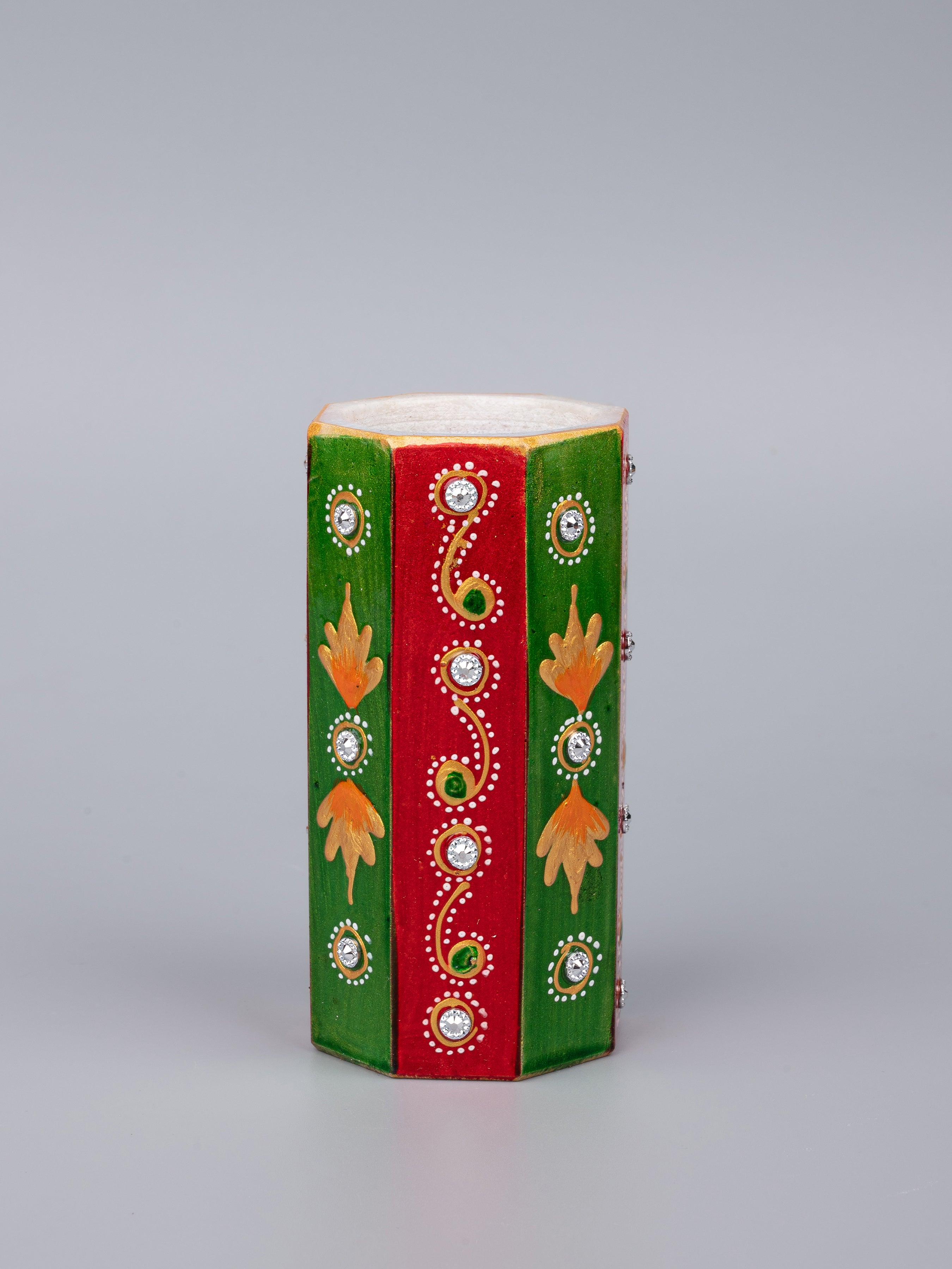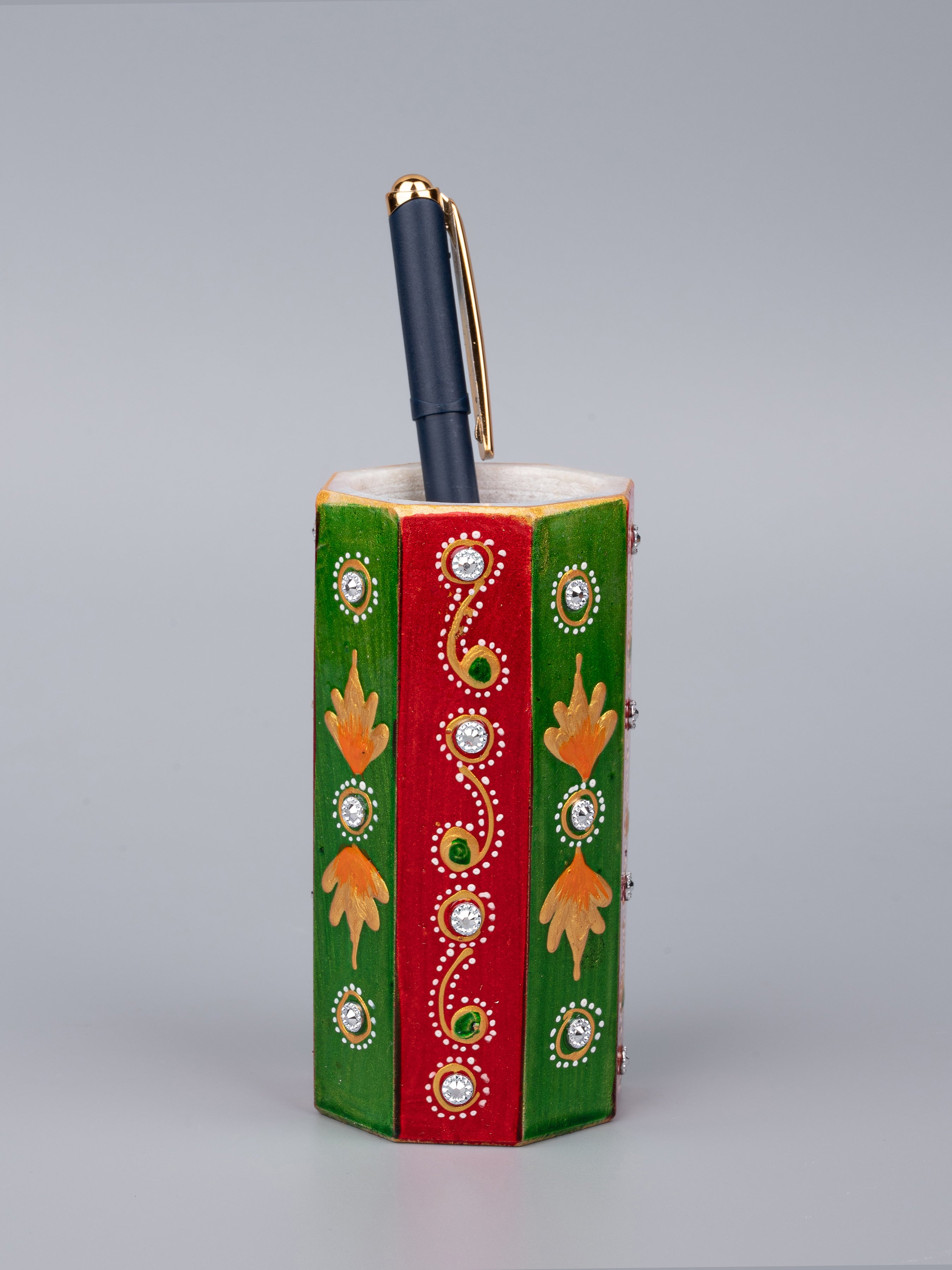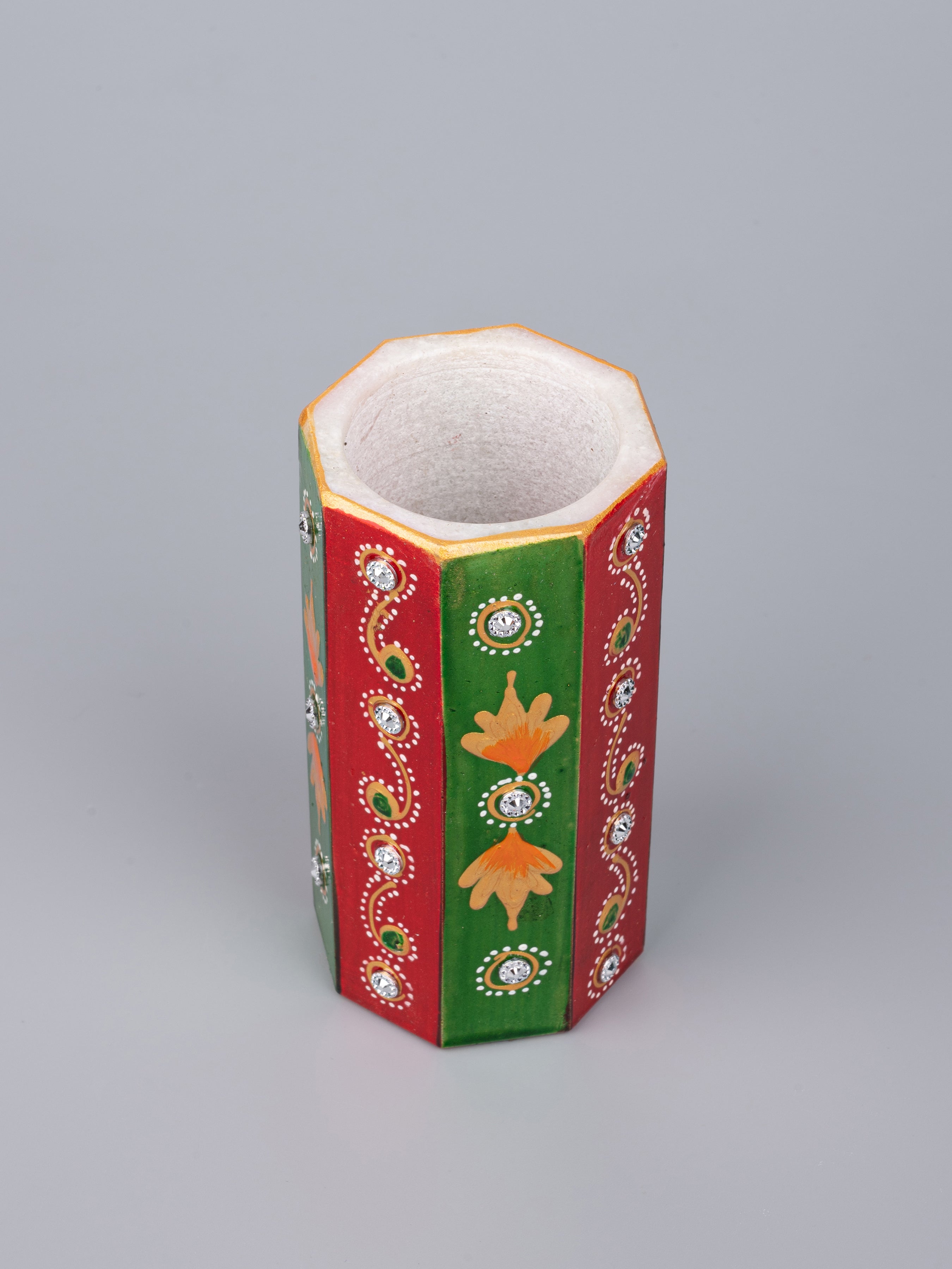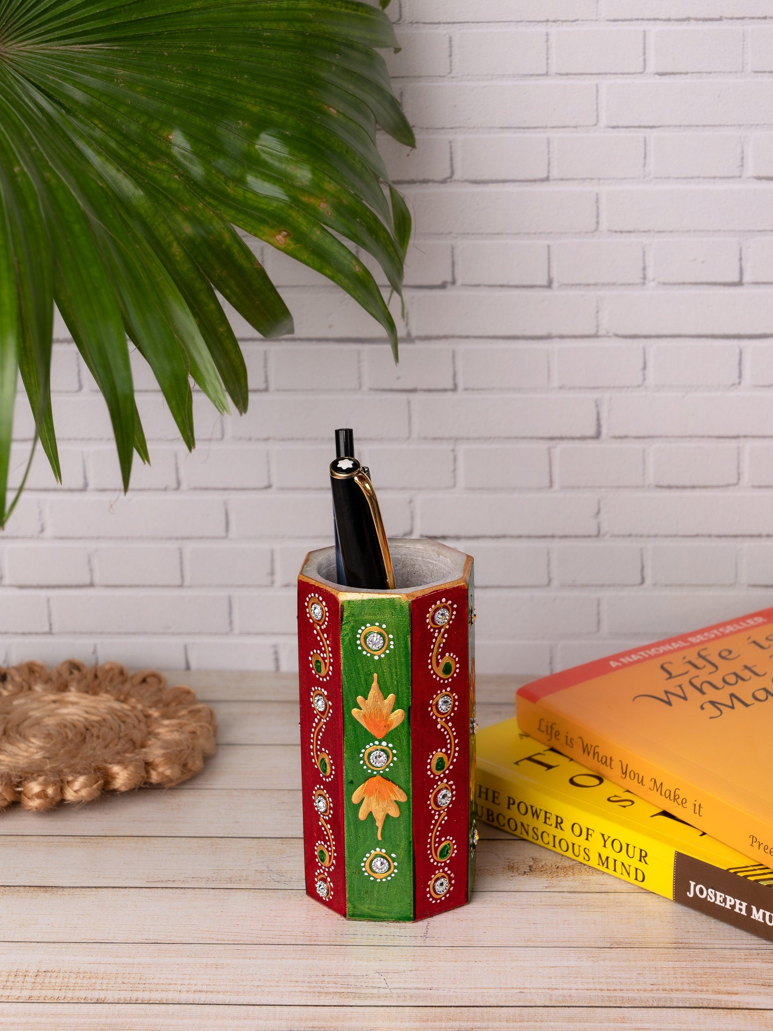 Make your office desk, children's desk and computer table look fantastic with this glamorous marble Pen stand. Crafted in pure white marble, it is embellished with the traditional Meenakari and kundan work of Rajasthan.