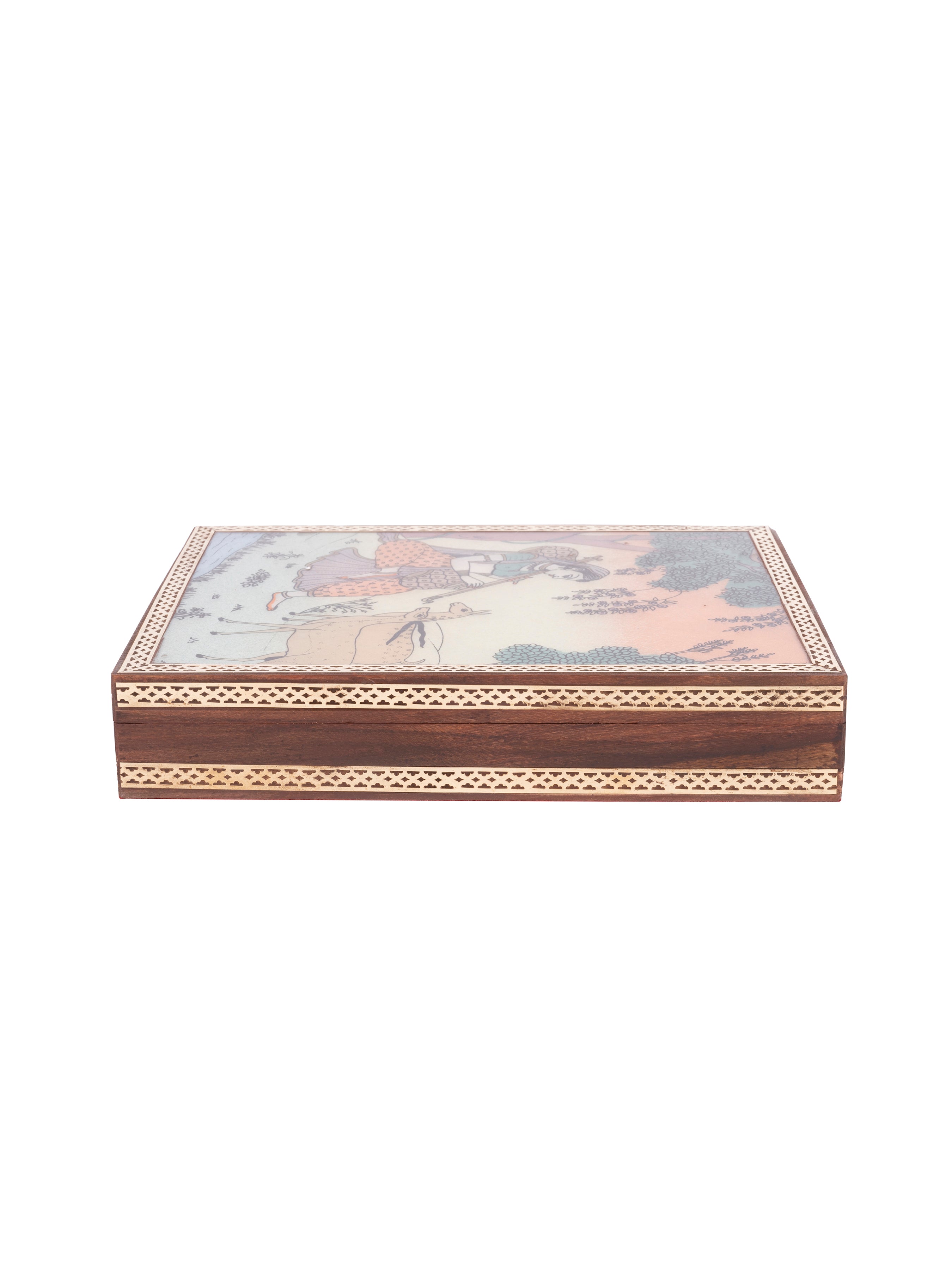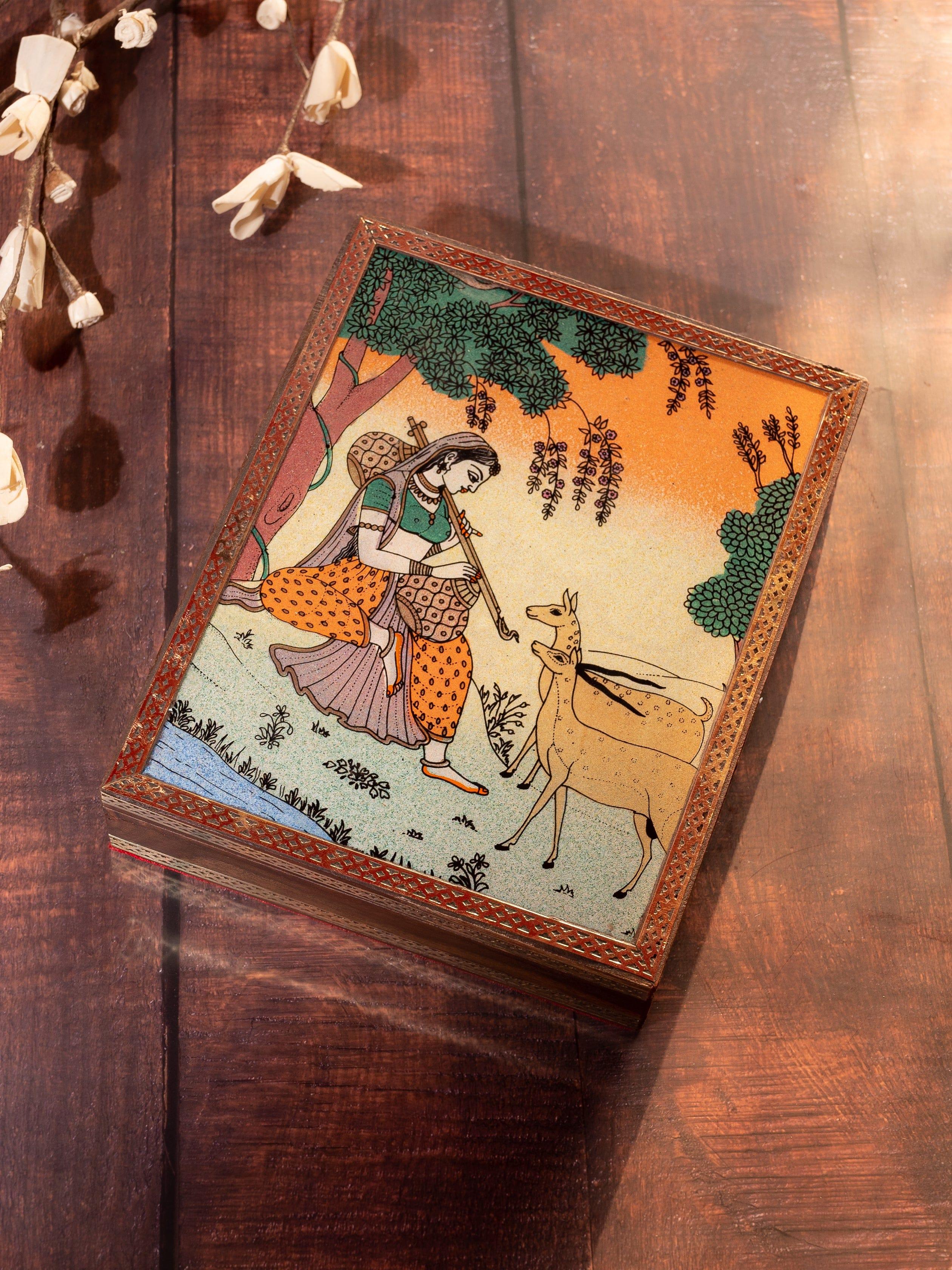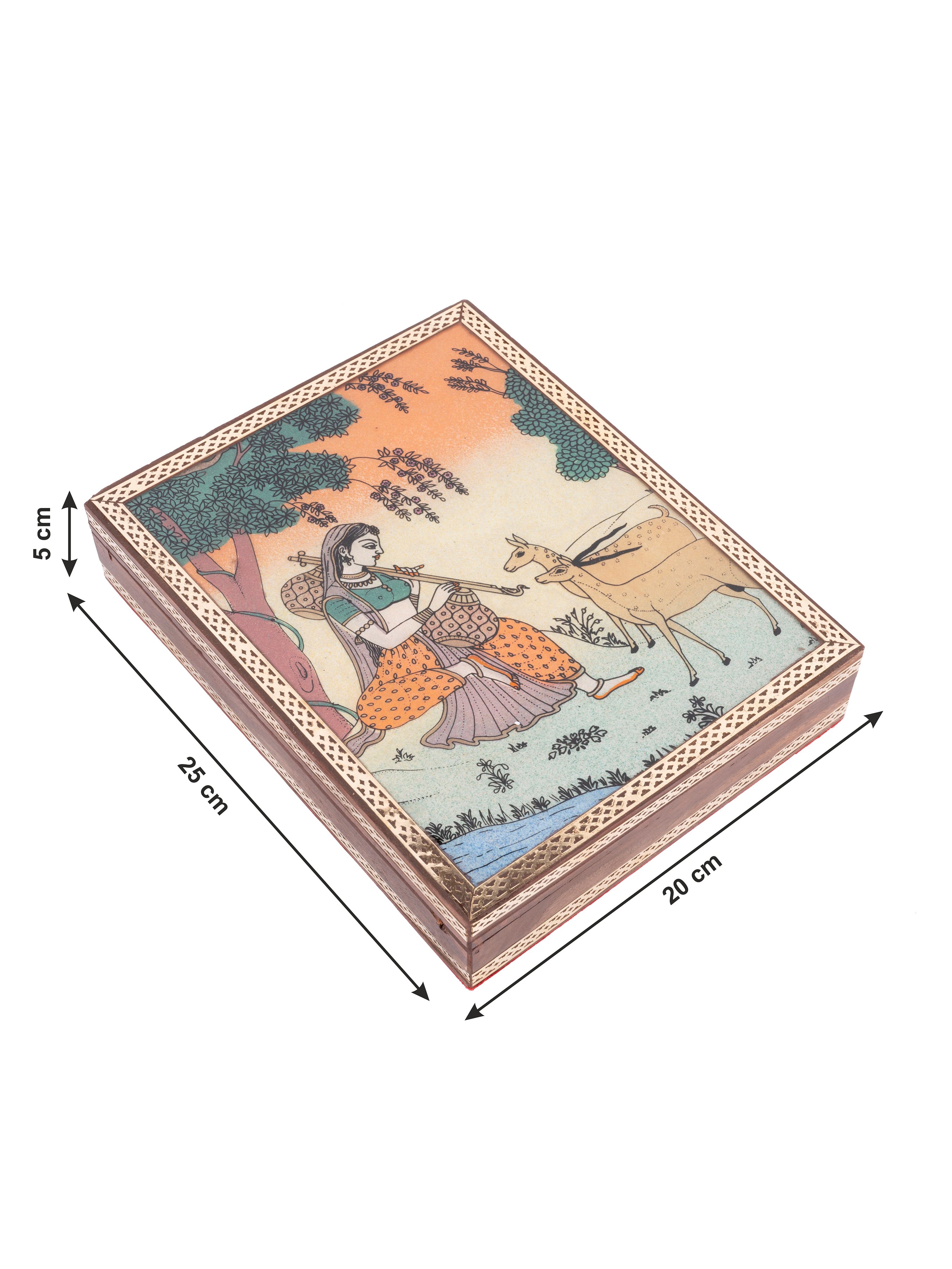 This handcrafted jewellery box is made of wood and decorated with gemstones with a flawless Meera painting. The painting is hand made with finely crushed real gemstones on a glass base which is a royal and traditional art of Rajasthan. Handcrafted brass beading finish on the edges gives it a more elegant and rich look. Perfect for gifting, storing daily jewellery or other items of regular use.