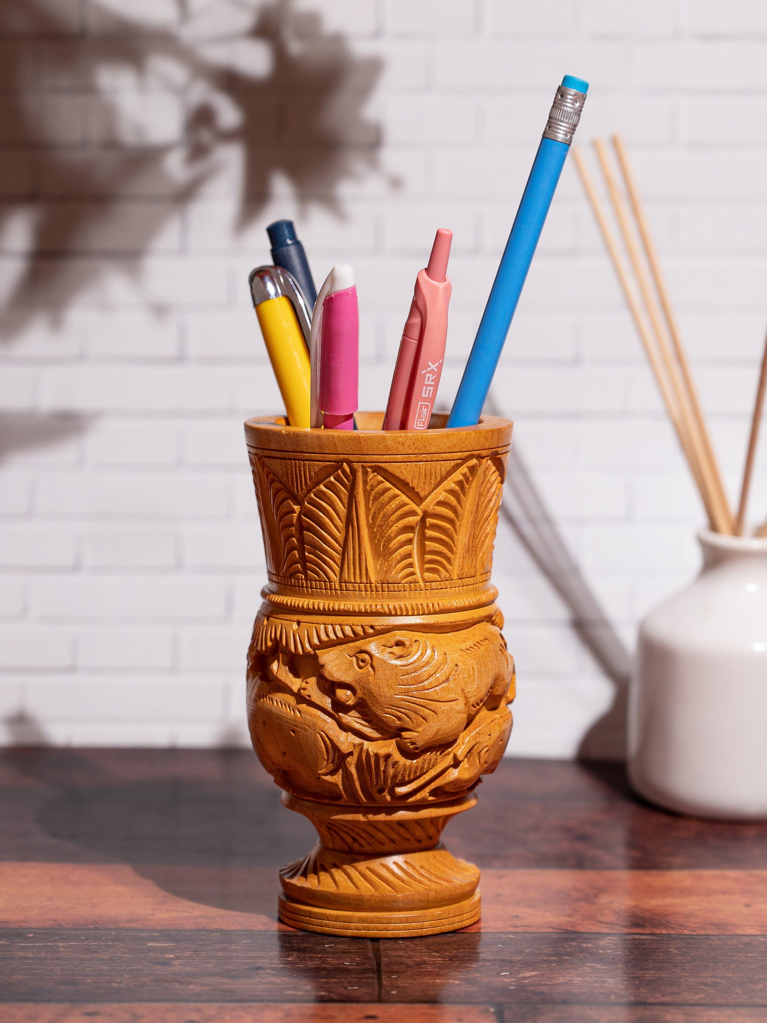 Organize you pen, pencil and other stationaries in this wooden hand carved exclusive pen holder. With leaf motifs on the upper part and animals at the bottom, this beautiful and elegant table accessory will always be appreciated for its classy appeal.