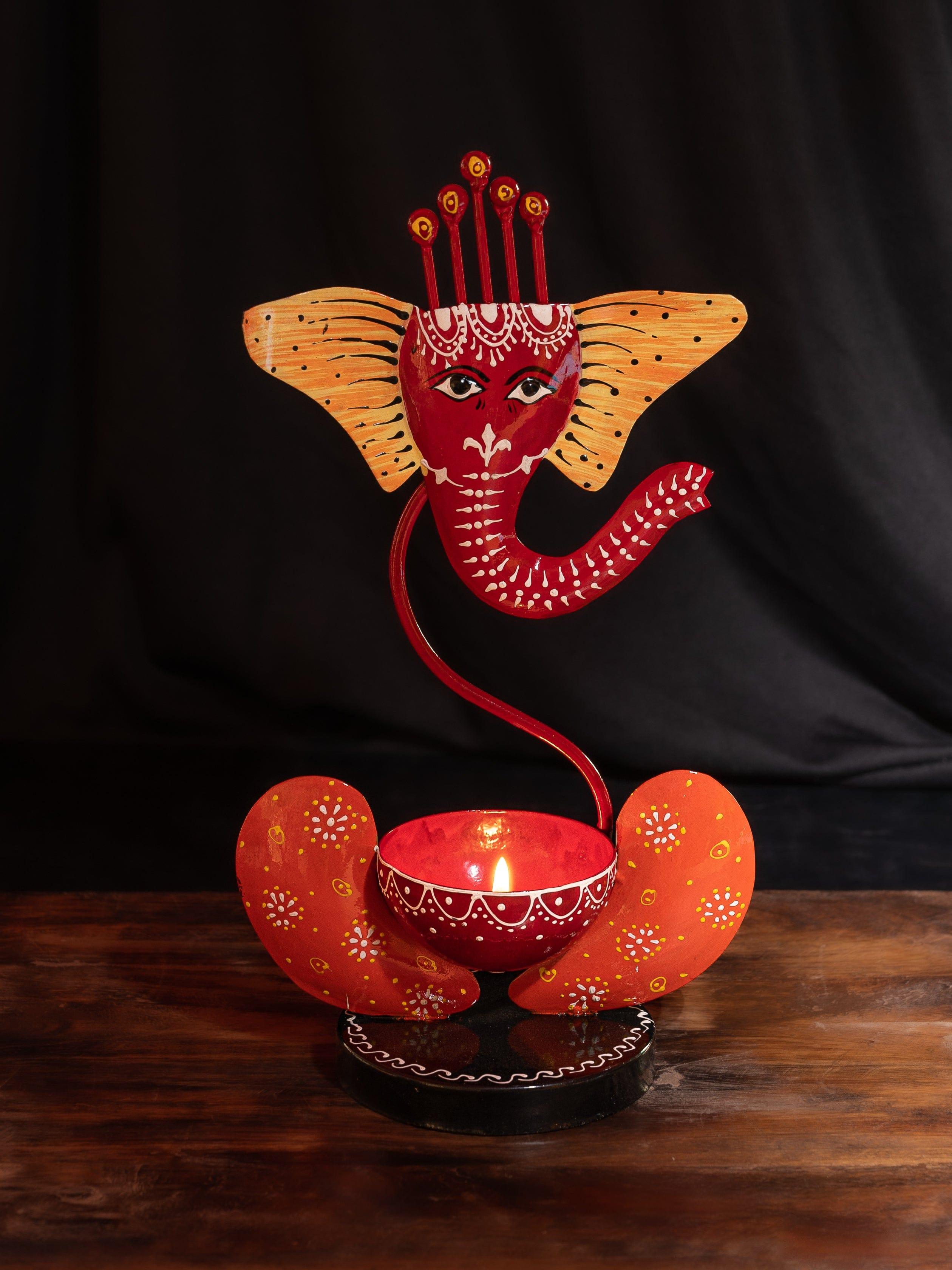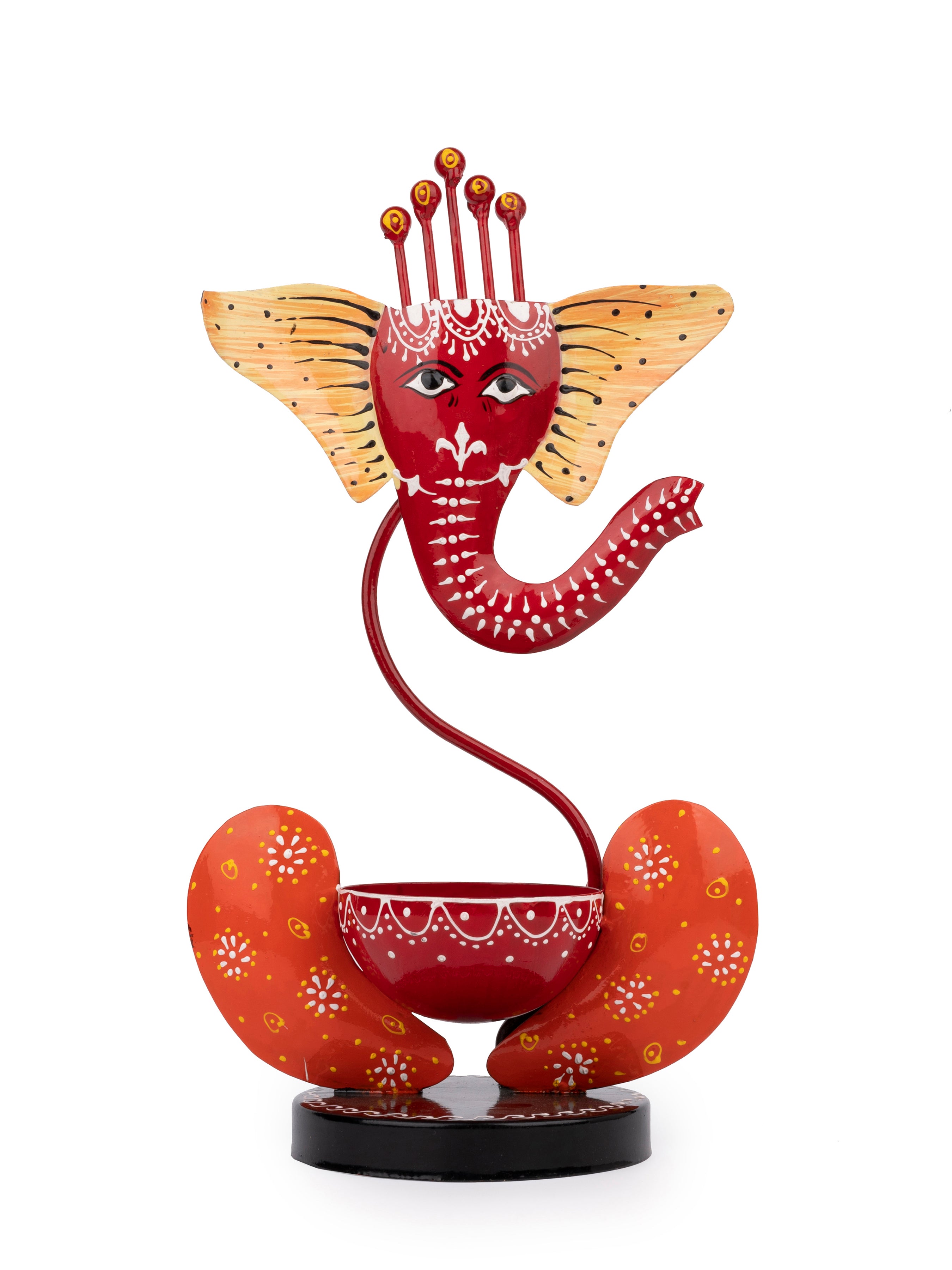 Handcrafted Metal Ganesh Tea light Holder in Red Color - 12 inches height