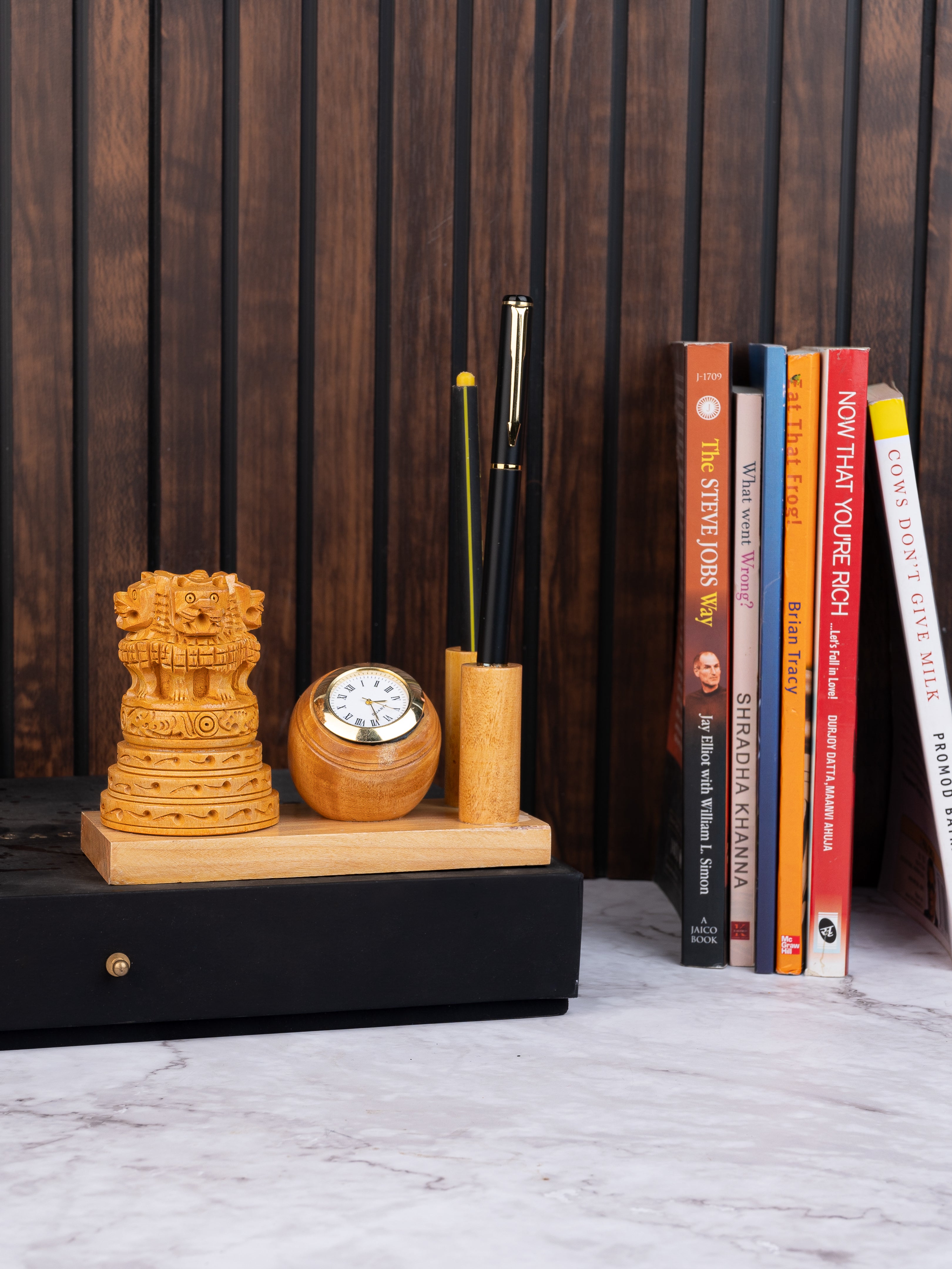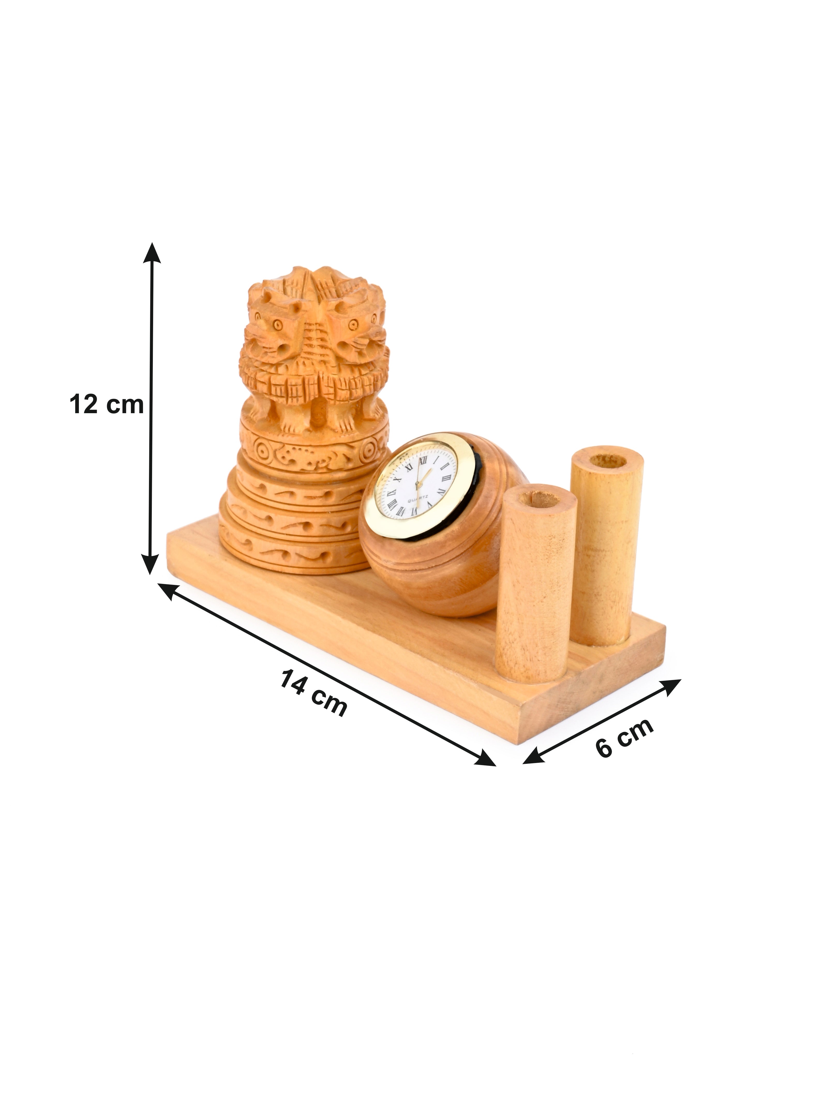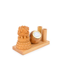 Hand crafted with perfection from best quality kadam wood, this pen stand is a perfect choice for any office desk. Stylish with a clean finish, it is a great gifting option too. The stand has a working clock and can accommodate 2 pen/pencil for daily use.