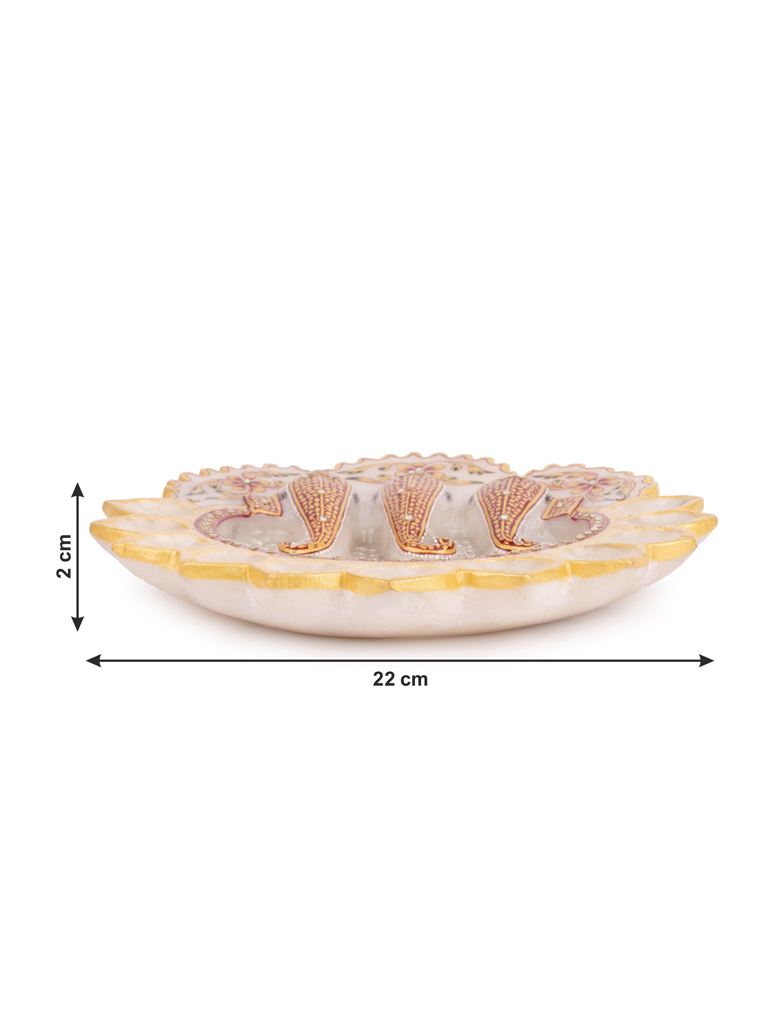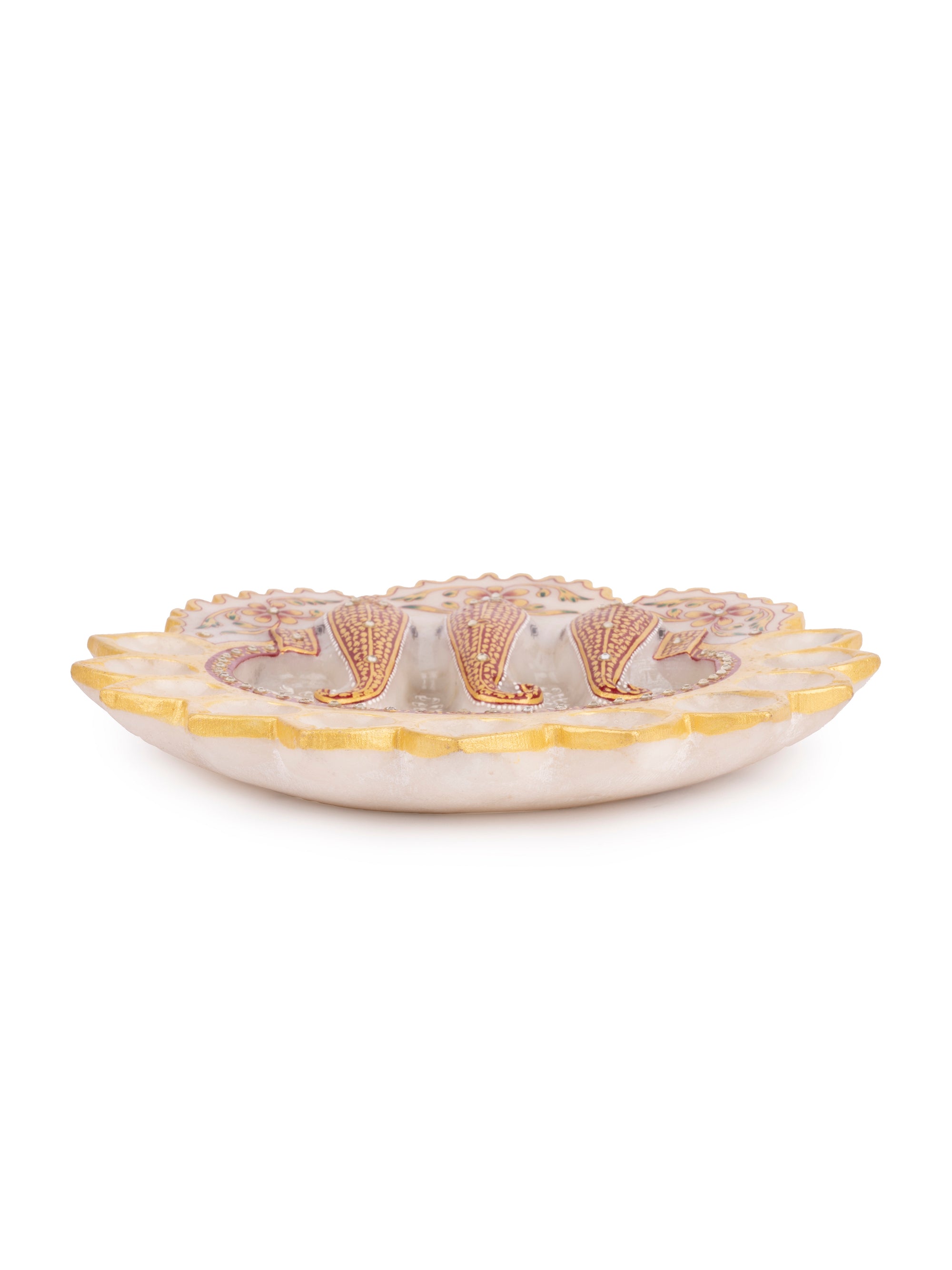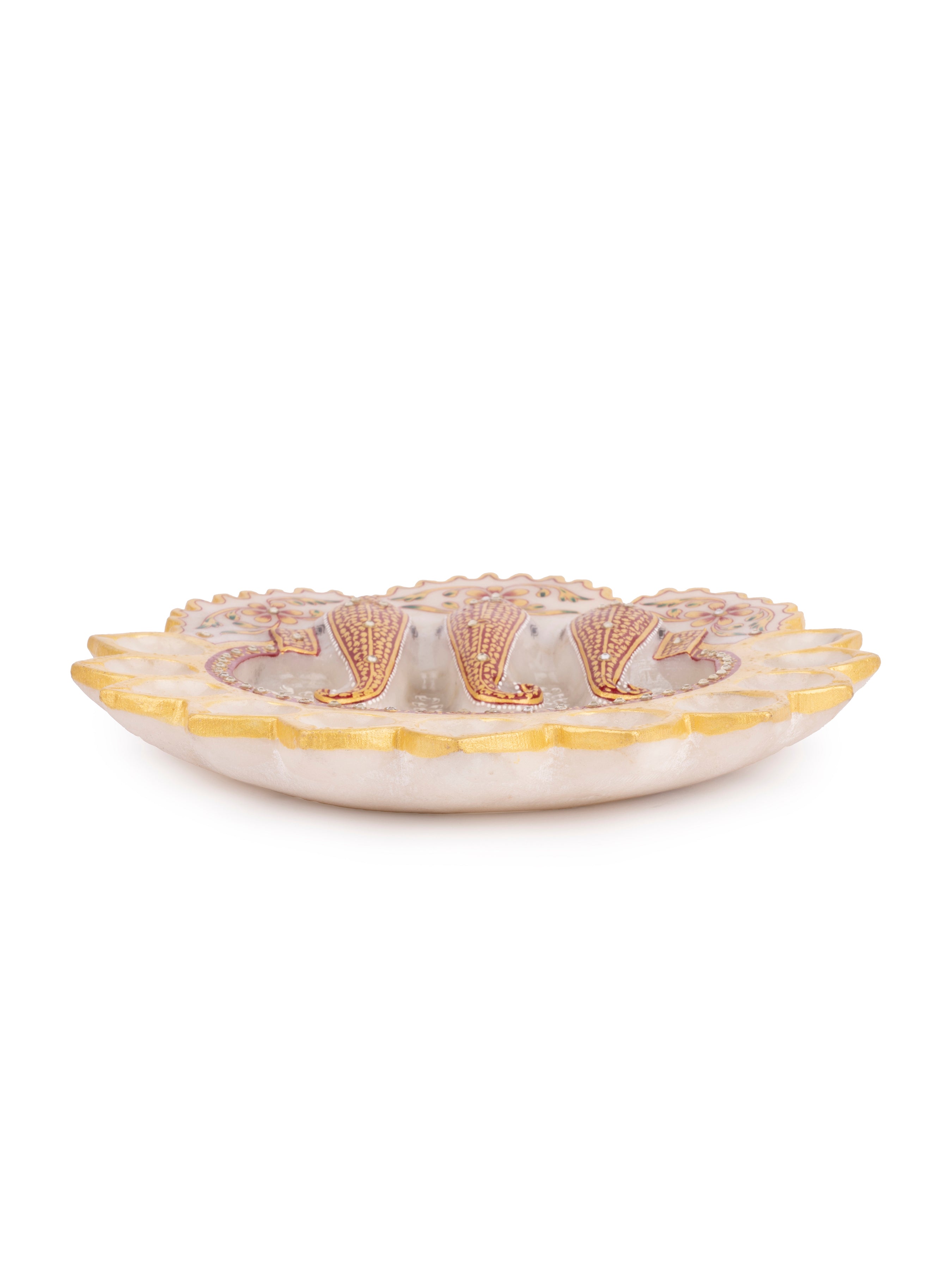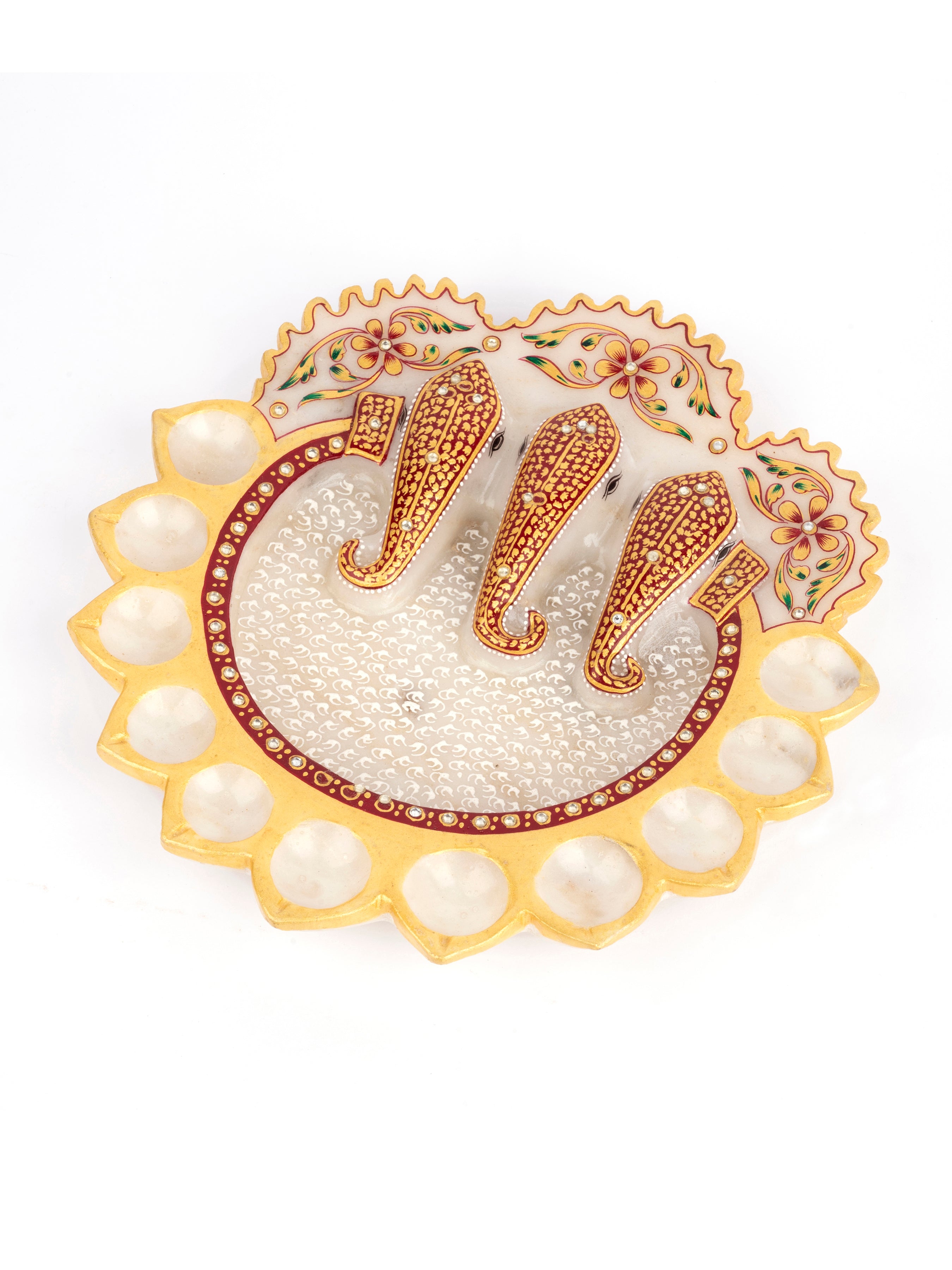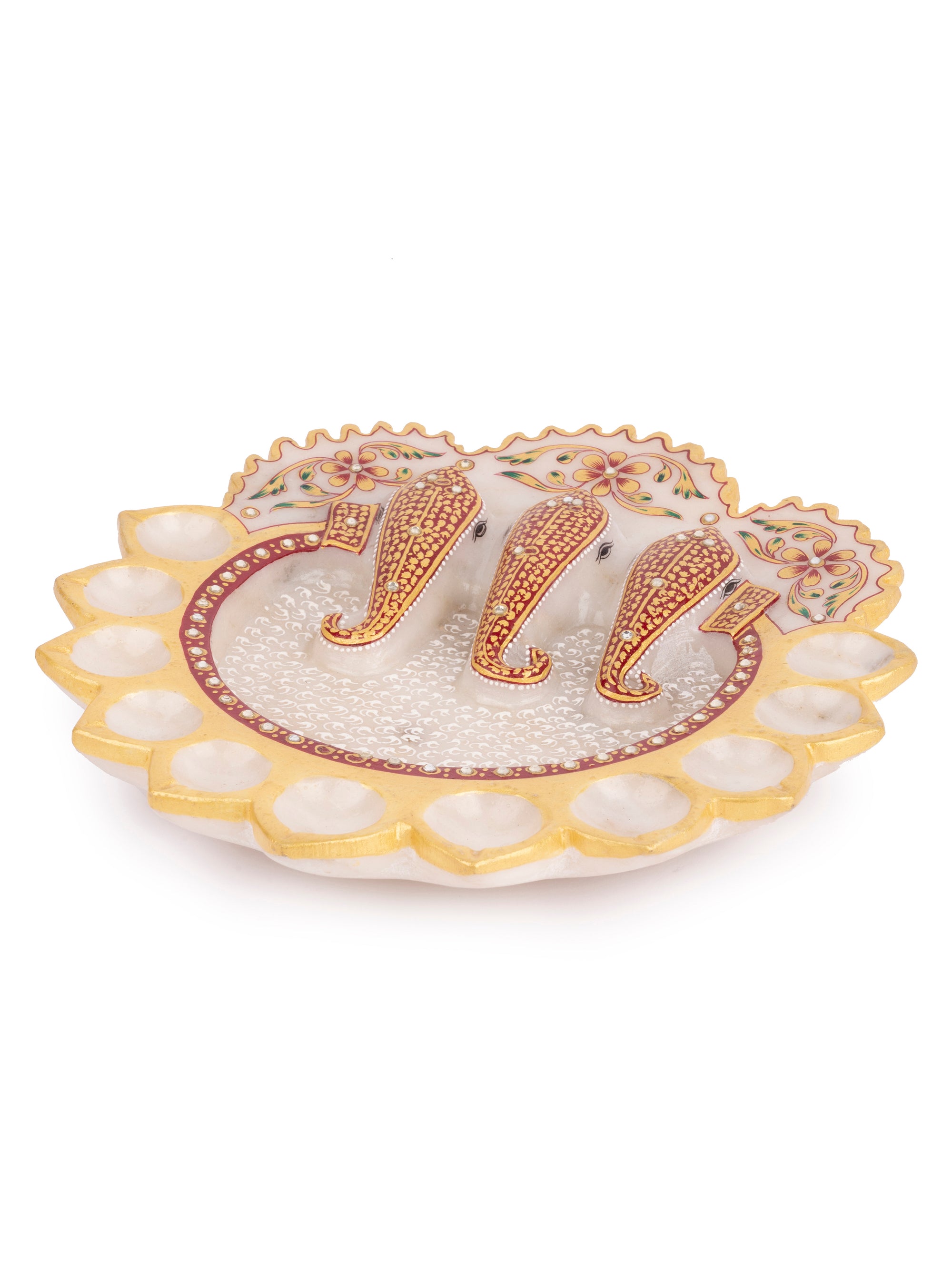 This Rajasthani handicraft 11 Diyas Puja Thali is made of Makrana marble, the decorative plate has an interesting feel as it will make any corner glow once the diyas are lighted. Designed with intricate patterns of red and gold, this marble puja thali looks more attractive with the 3 elephant trunks at the center. You can use it in your puja room, use it as a decor piece in your living room or gift to your beloved ones.