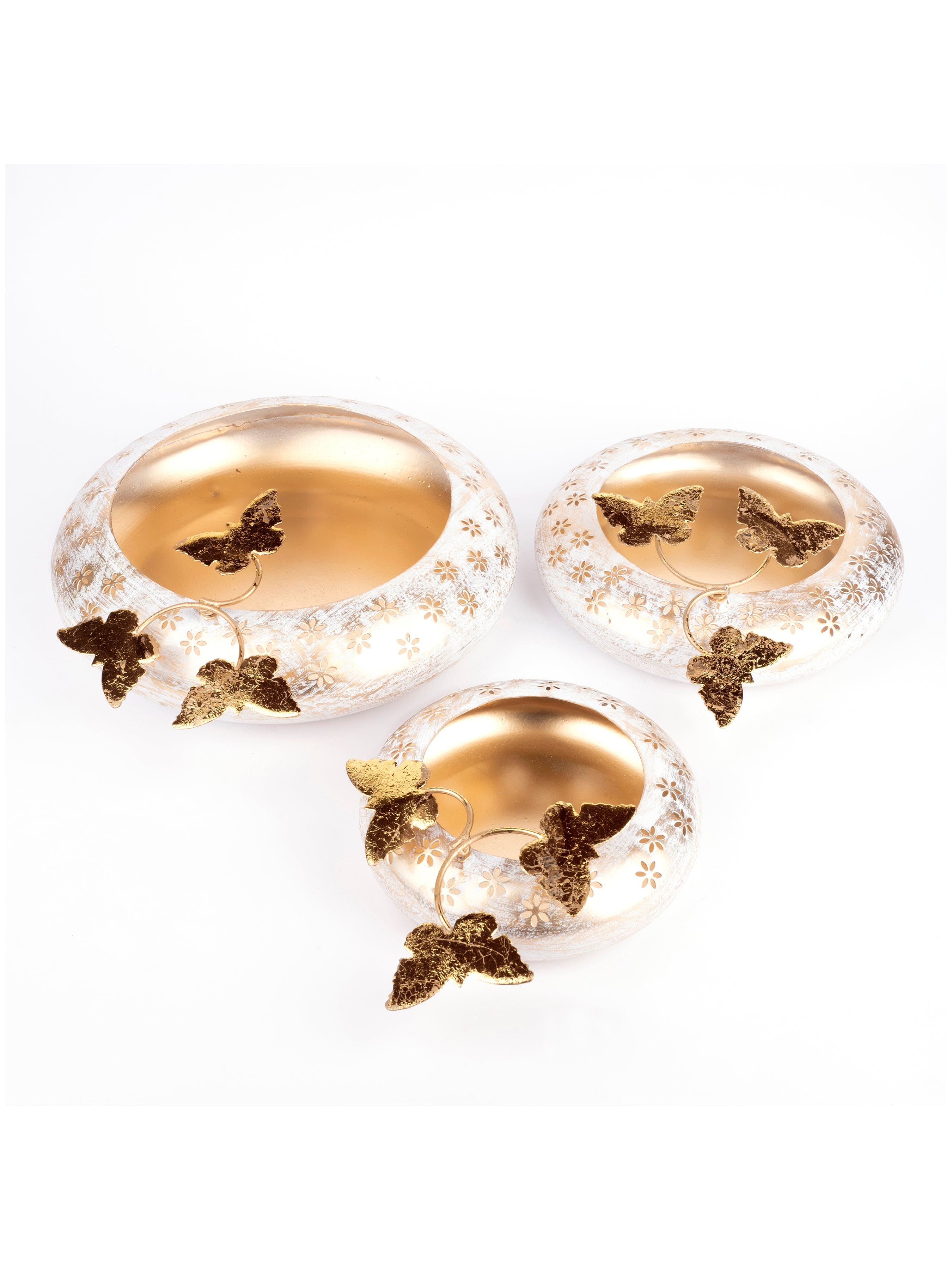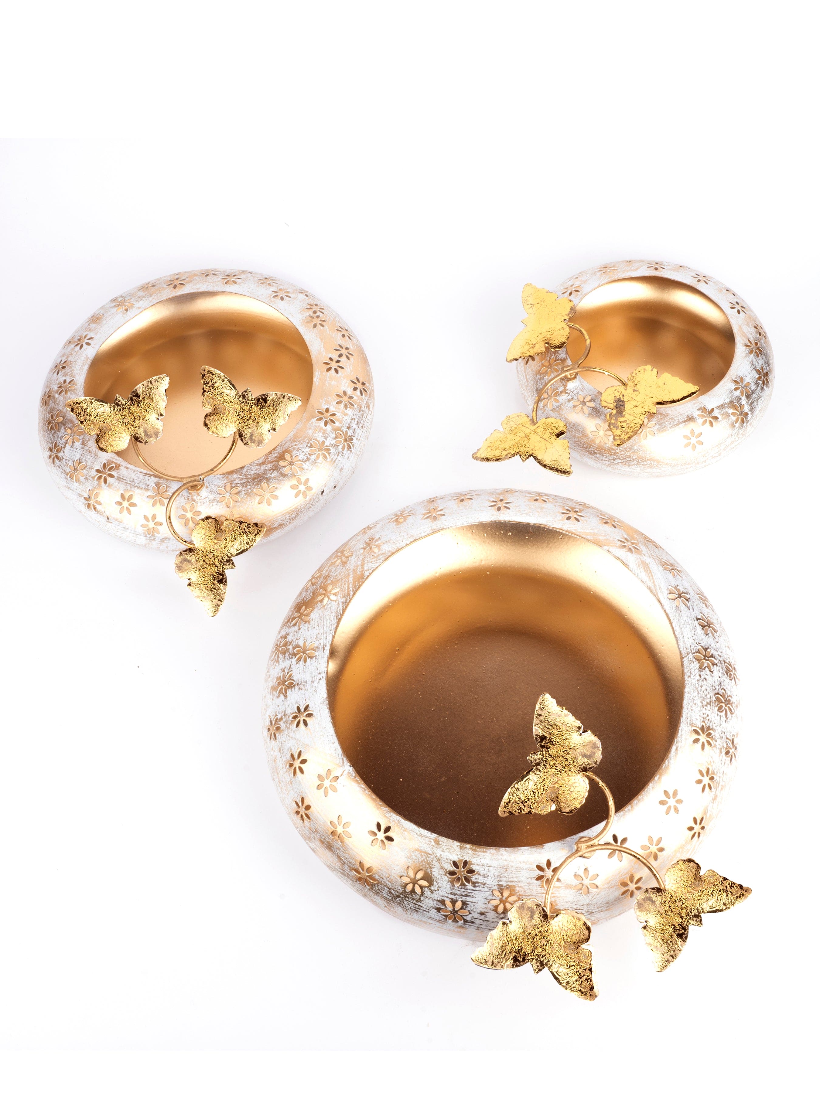 Metal crafted White and Gold Butterfly Urli / Bowl Set of 3 pcs