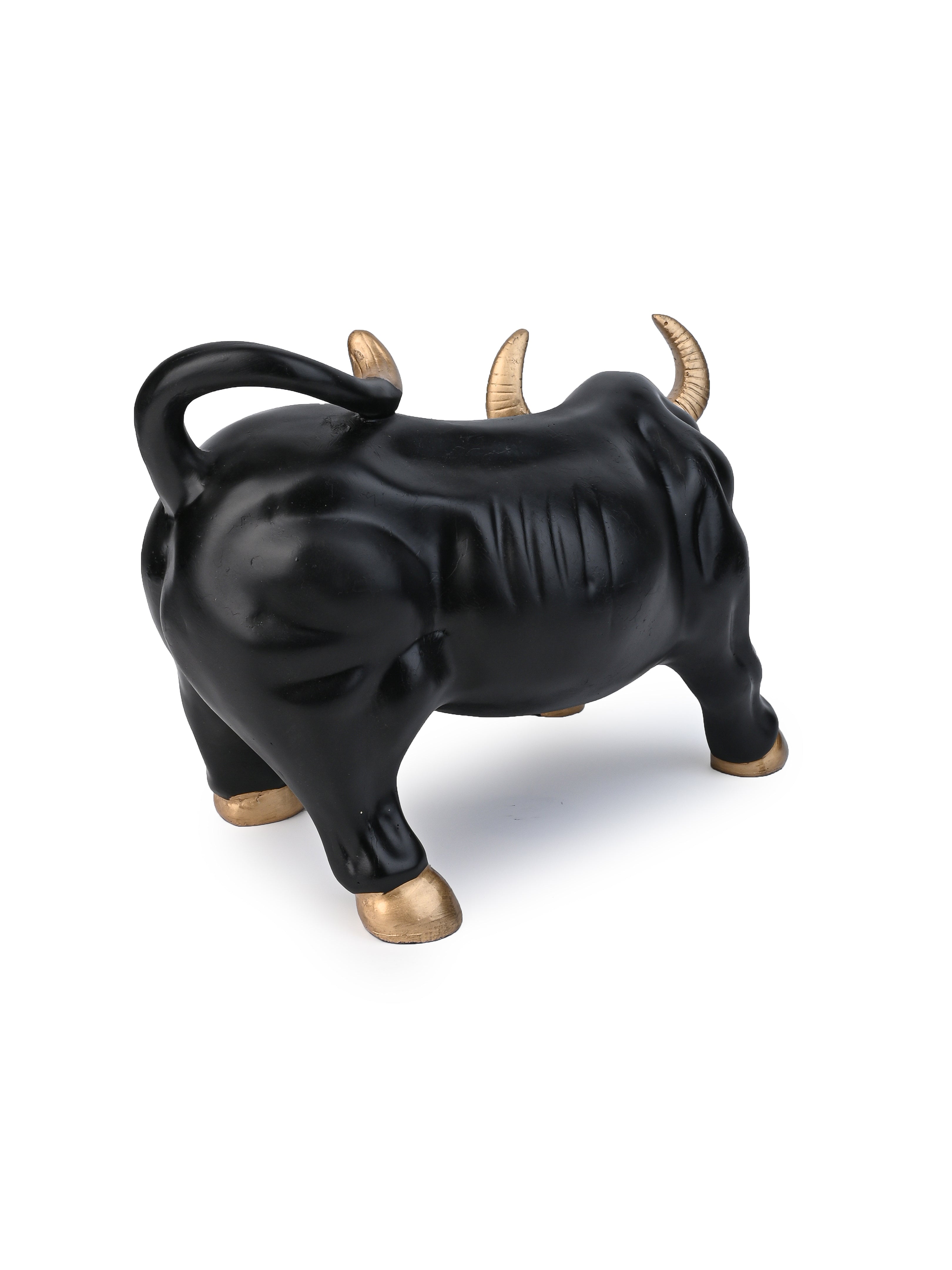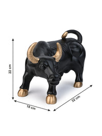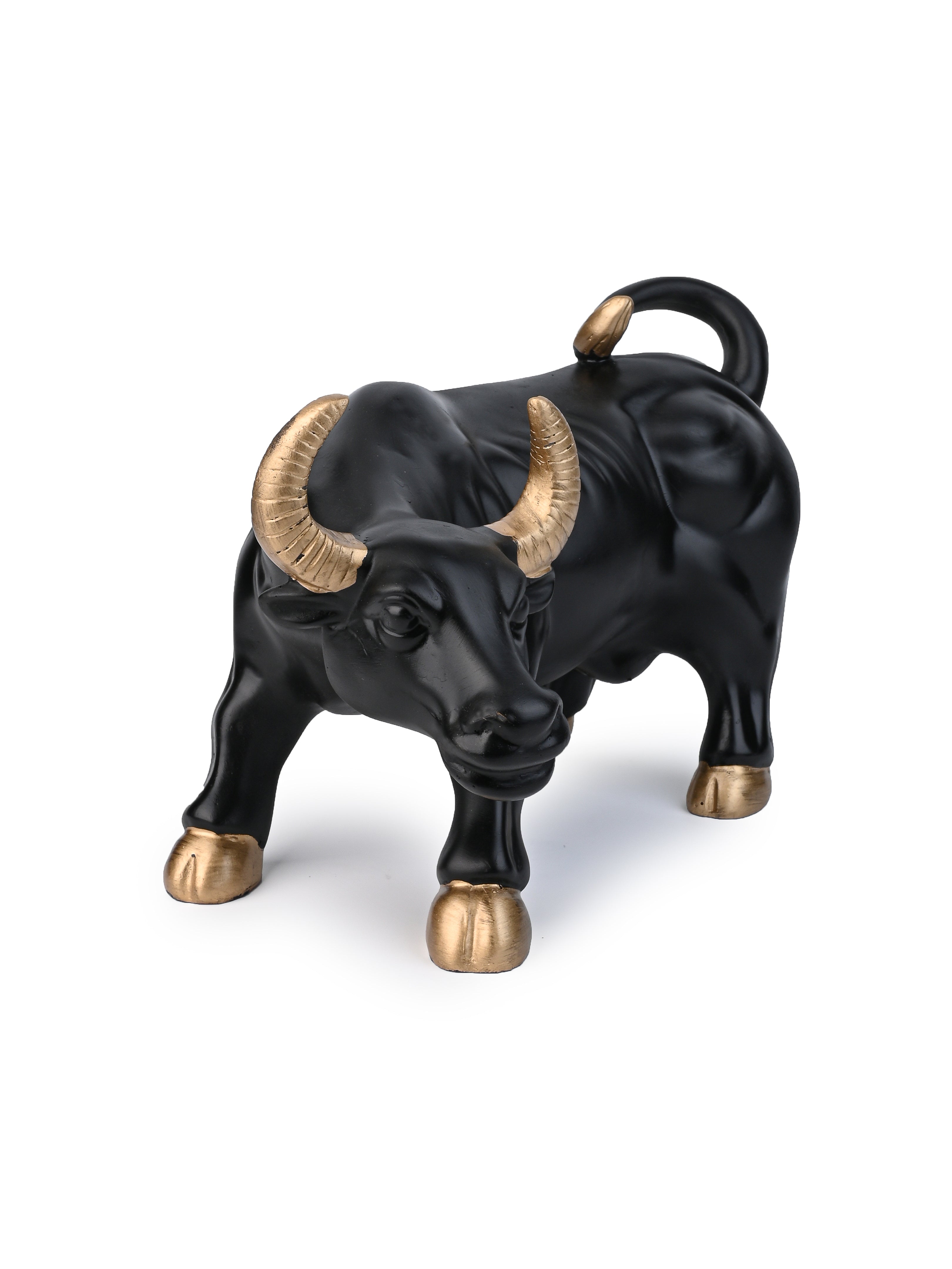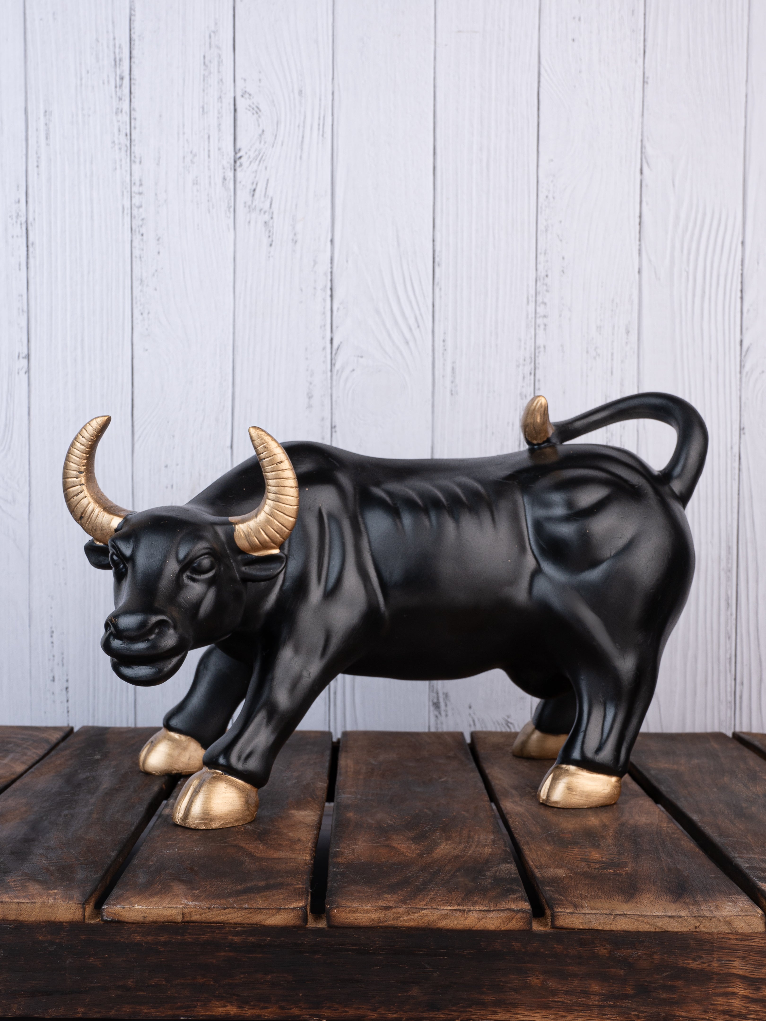 This stunning black bull state with golden horns is the perfect addition to any home décor. Bulls are a symbol of strength, power, and prosperity, and this statue is the perfect way to bring those positive vibes into your home. Made of high-quality resin and hand-painted in a striking black and gold finish, this decor piece is sure to turn heads and start conversation.
