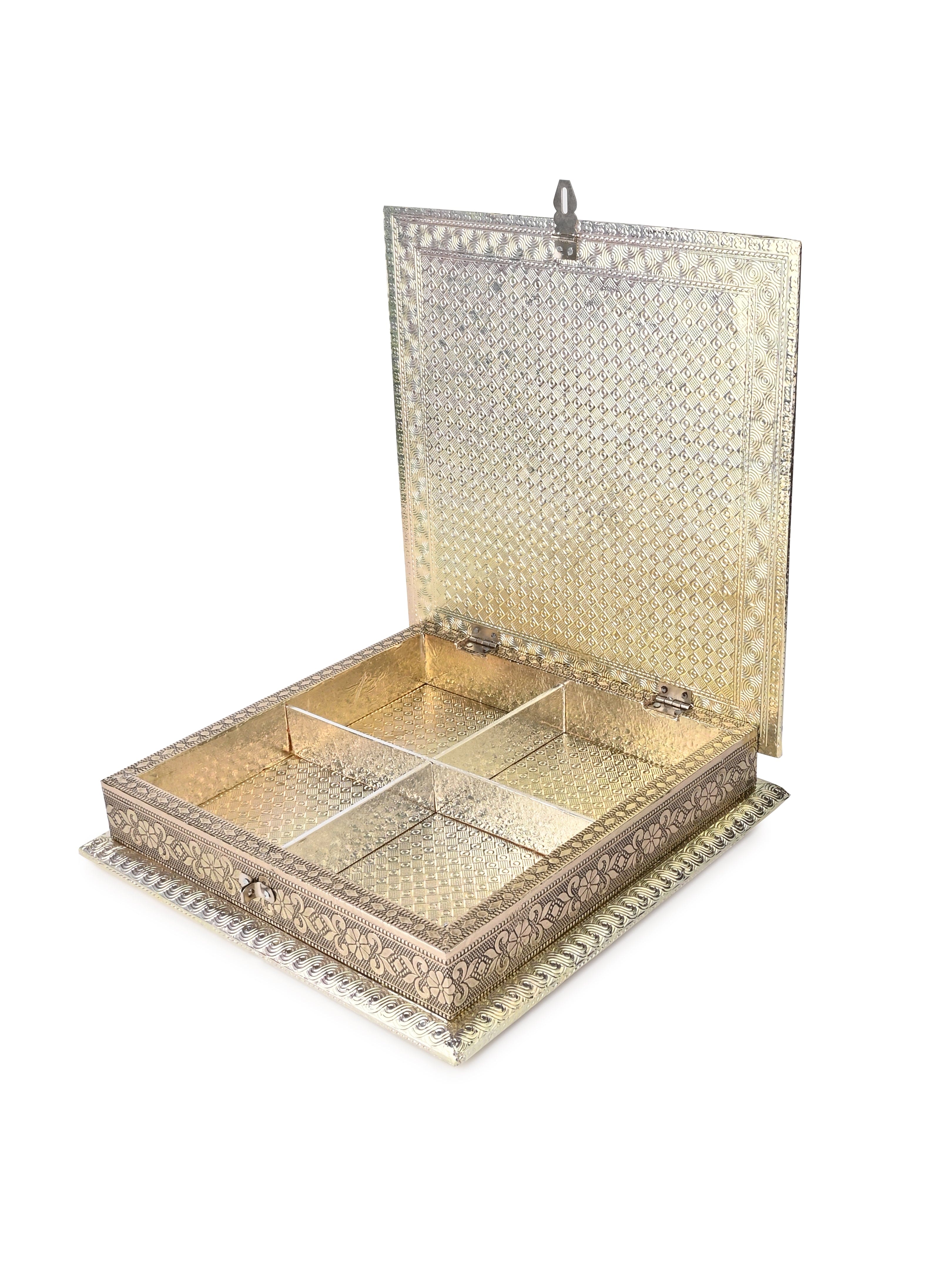 Decorated with Meenakari artwork, this multi purpose gift box is hand crafted on a MFD base and covered with an oxidised metal sheet. It has multiple compartments, in which you can store dry fruits, sweets, candies etc. Perfect to gift to your loved ones in this festive season.