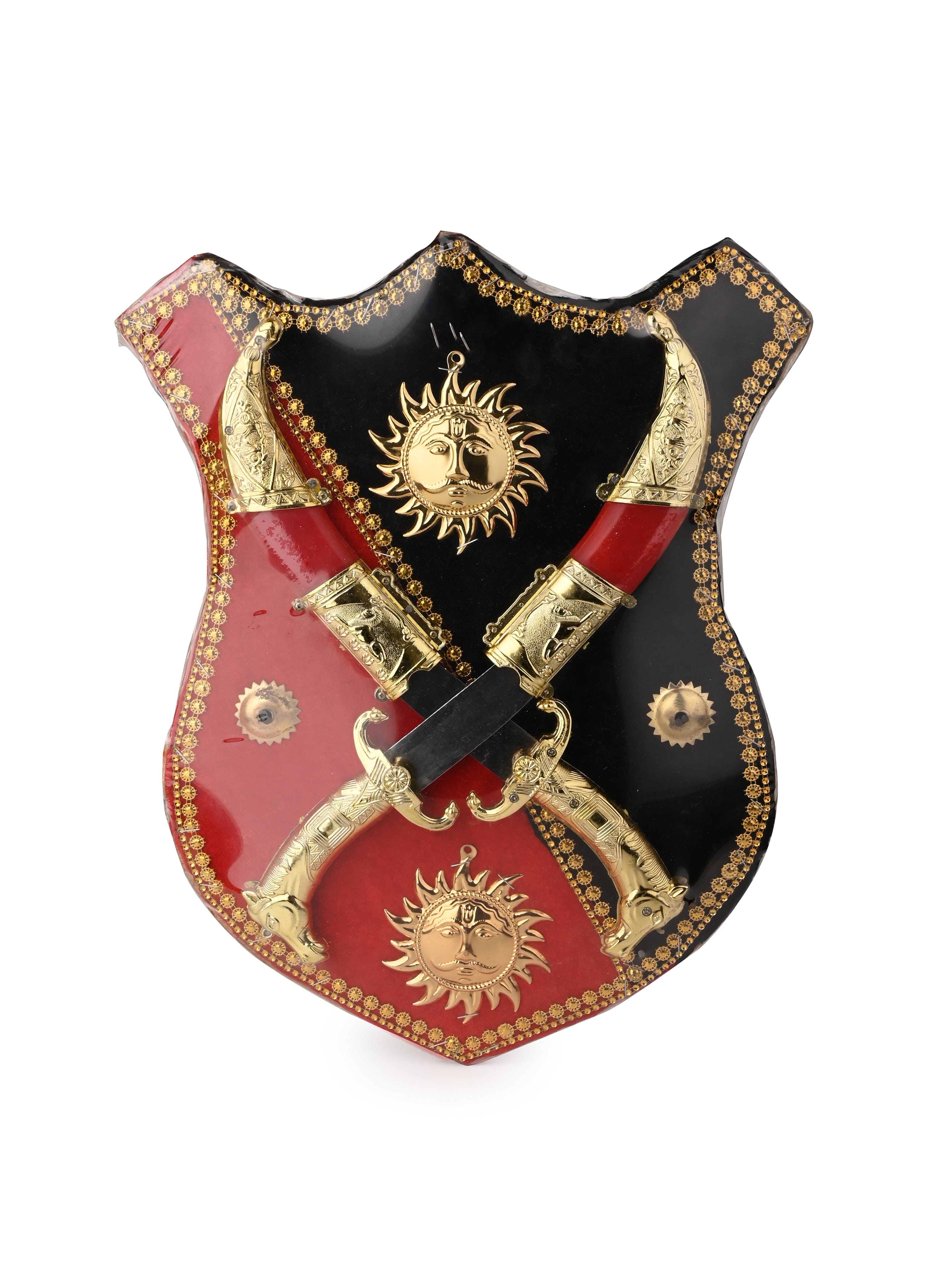 This Rajput or Maratha Dhal Talwar set comprises of a shield wrapped with red and black velvet cloth along with a pair of knives and two surya symbols. Perfect for decorating your living room or office room wall.