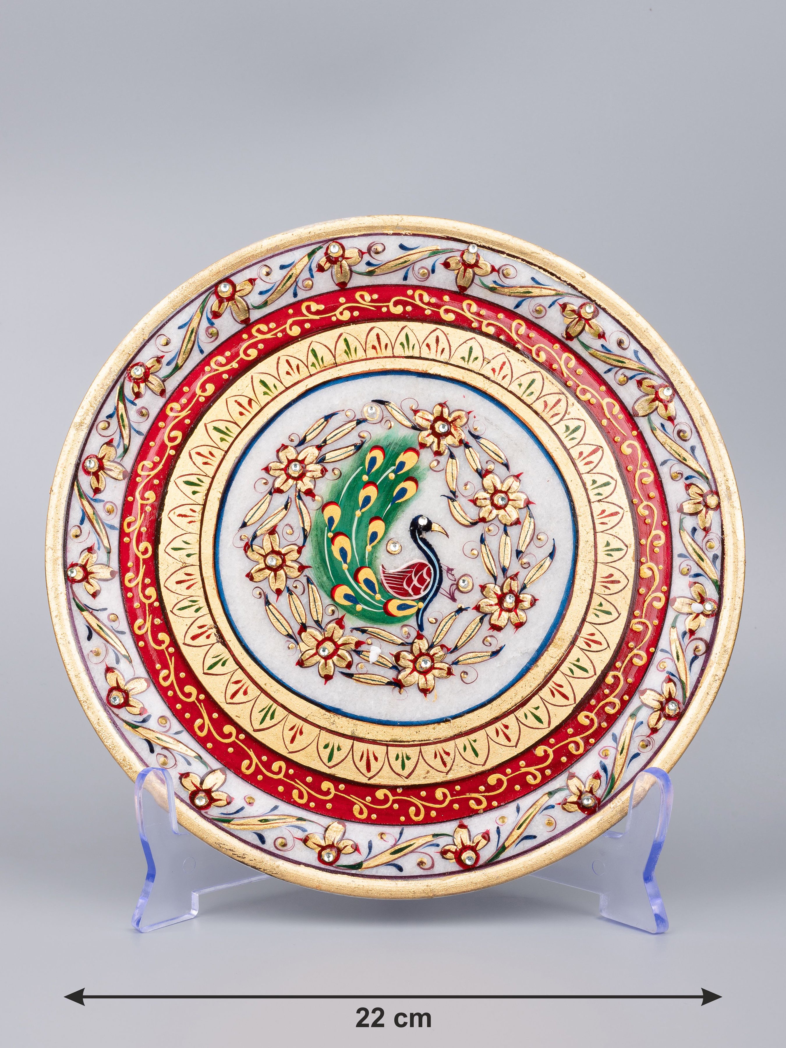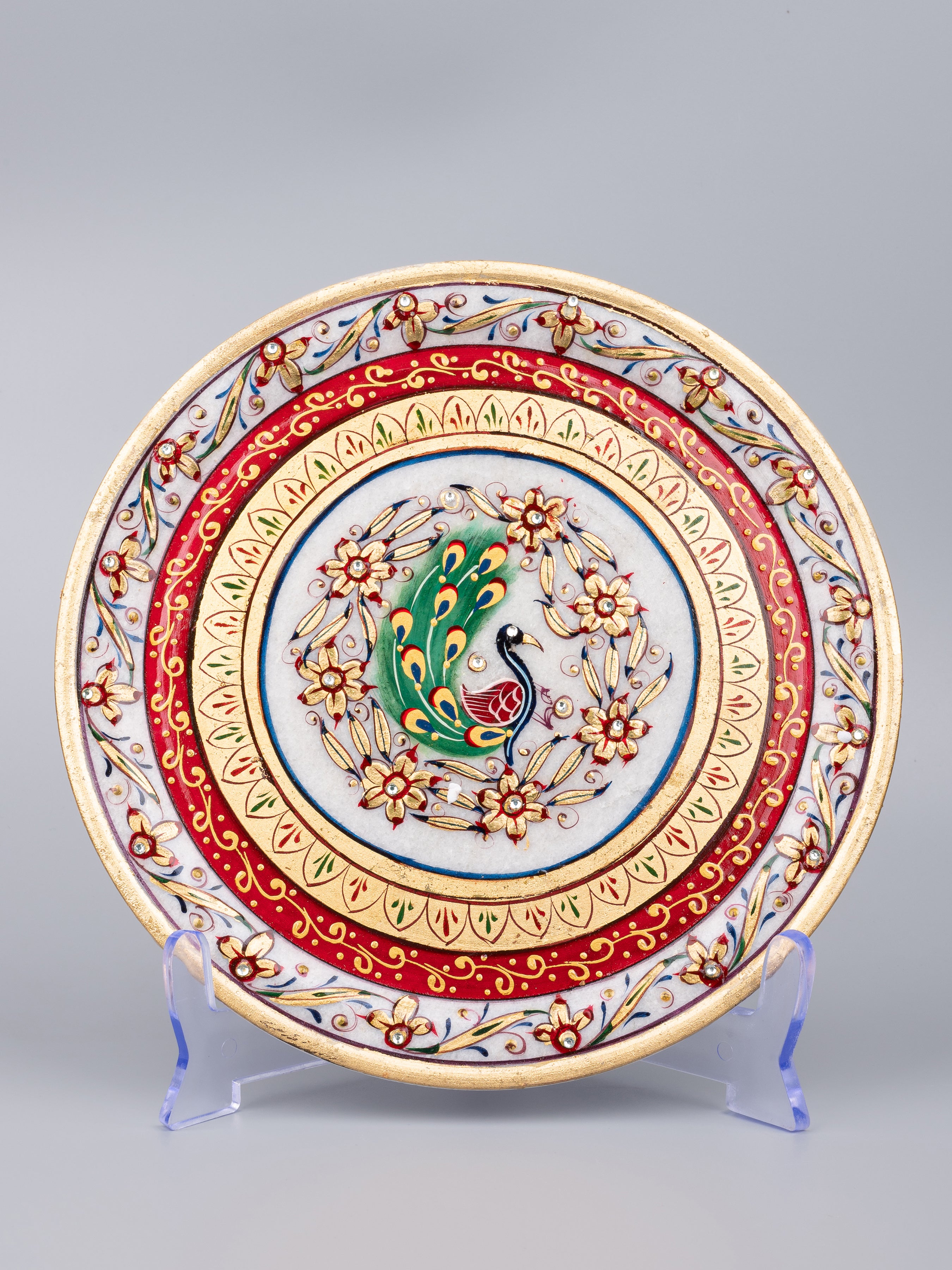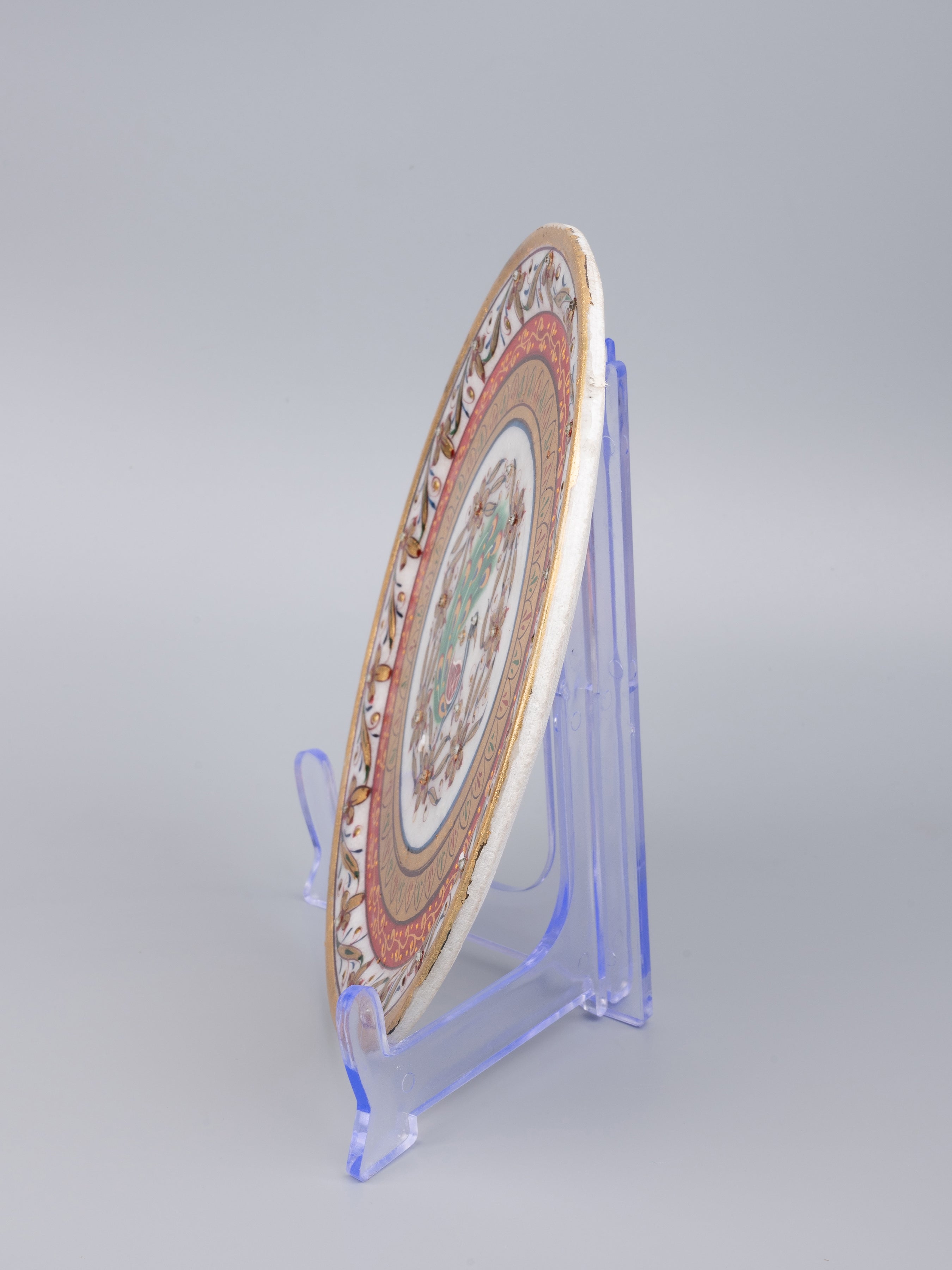 Resting on a acrylic stand, the decorative plate has an interesting feel as it will make any corner of the house glow. It has a mughal floral theme with beautiful painting done on it. This style of painting is done in all royal palaces of Rajasthan.