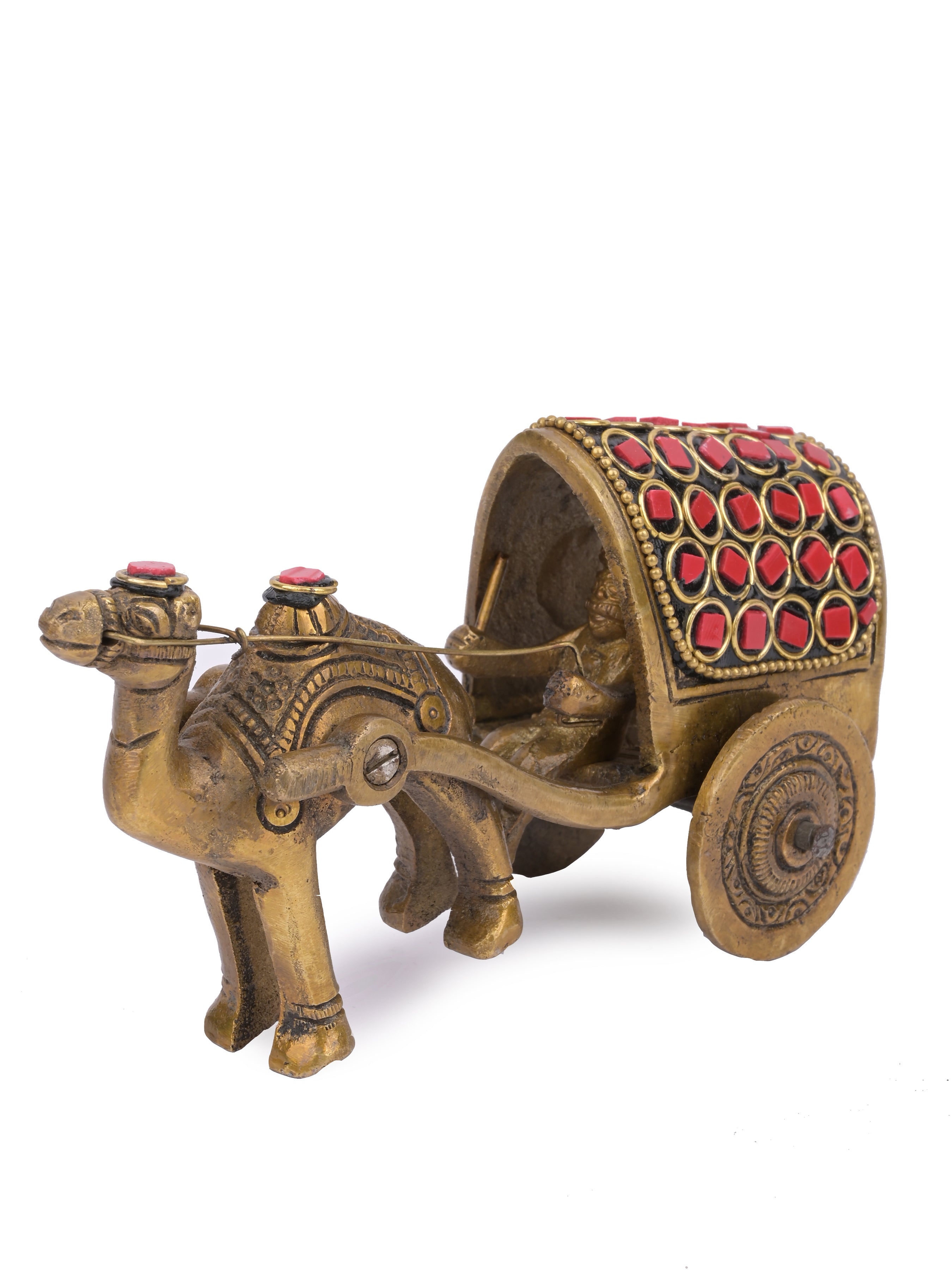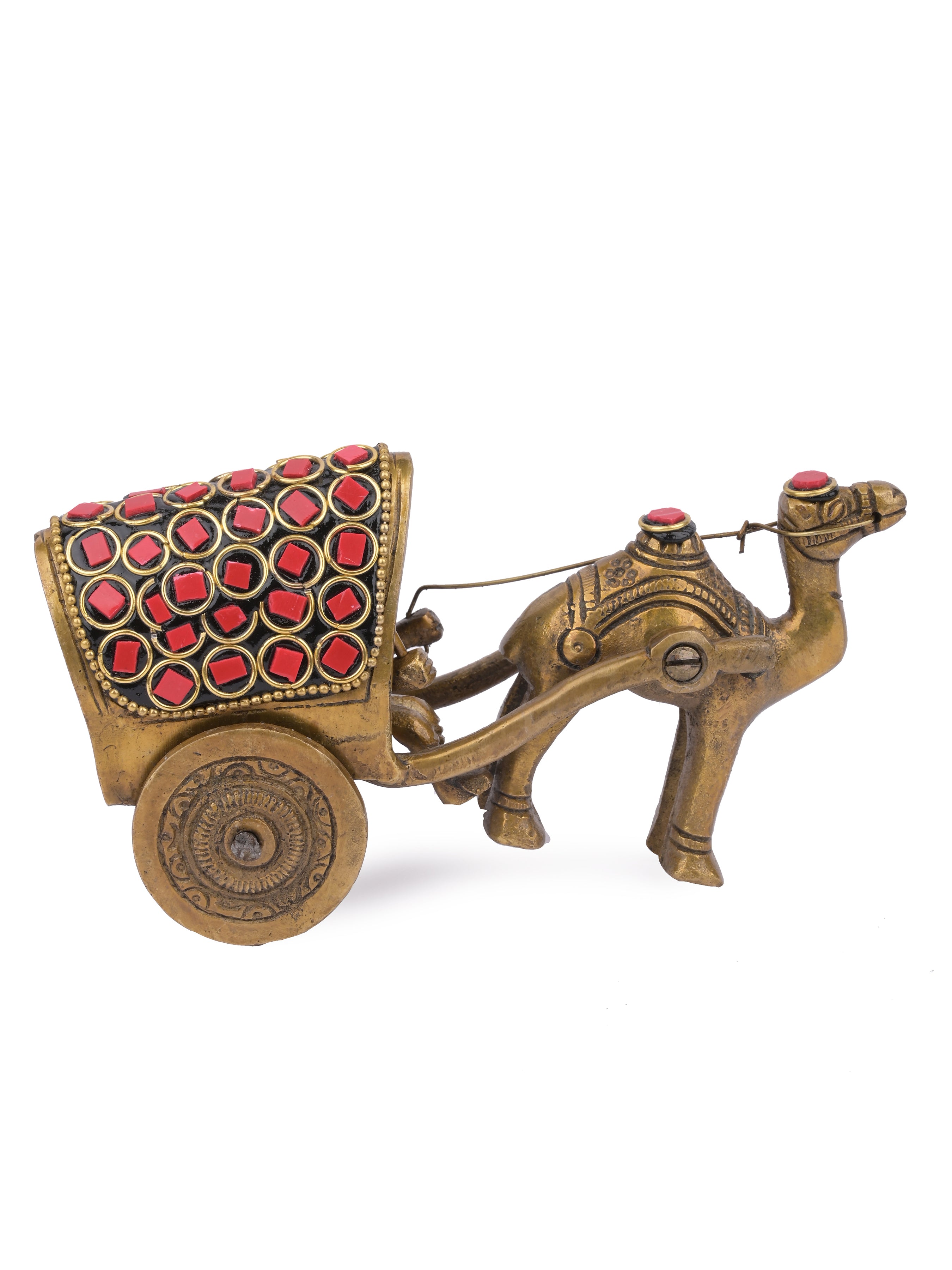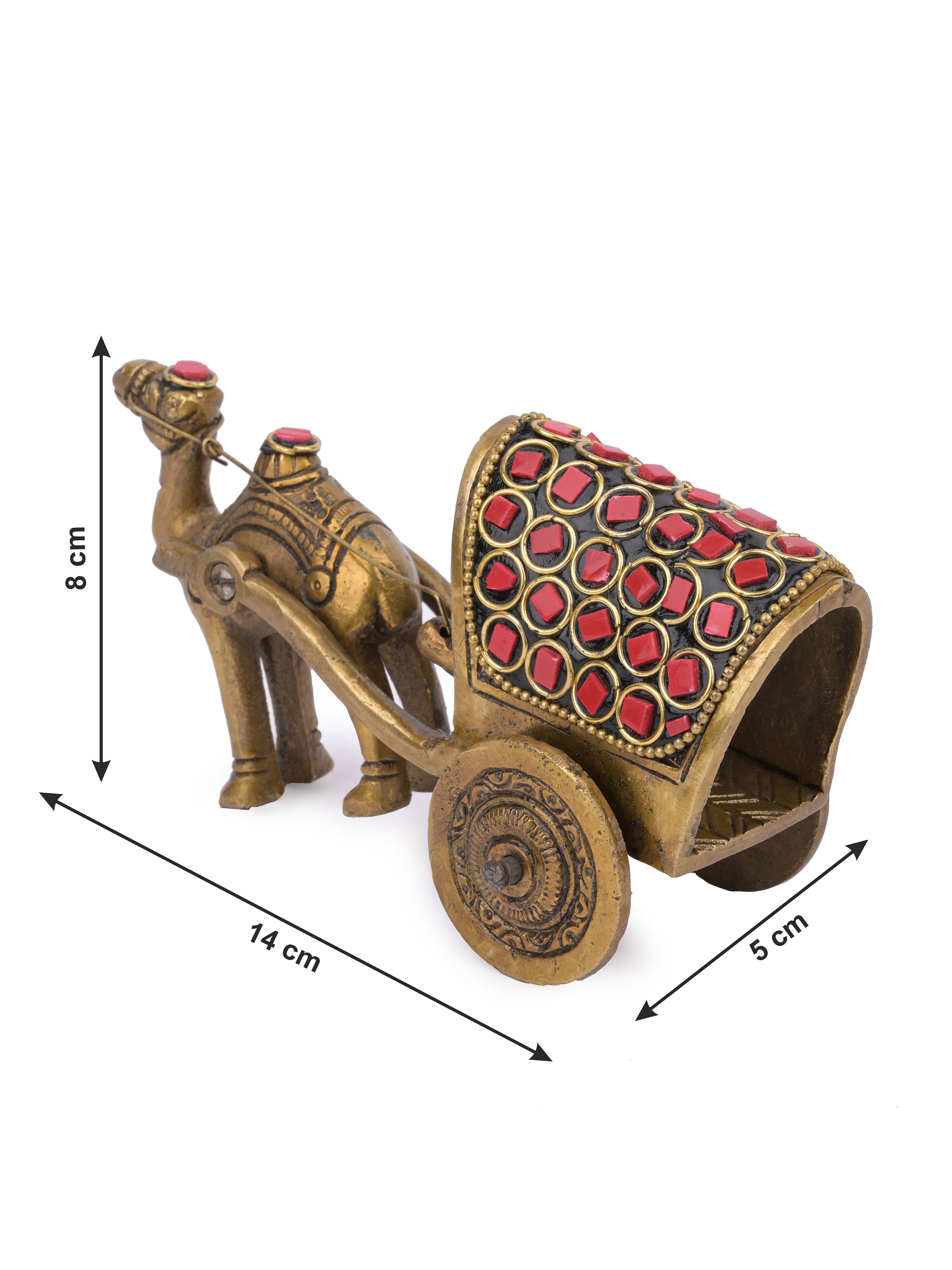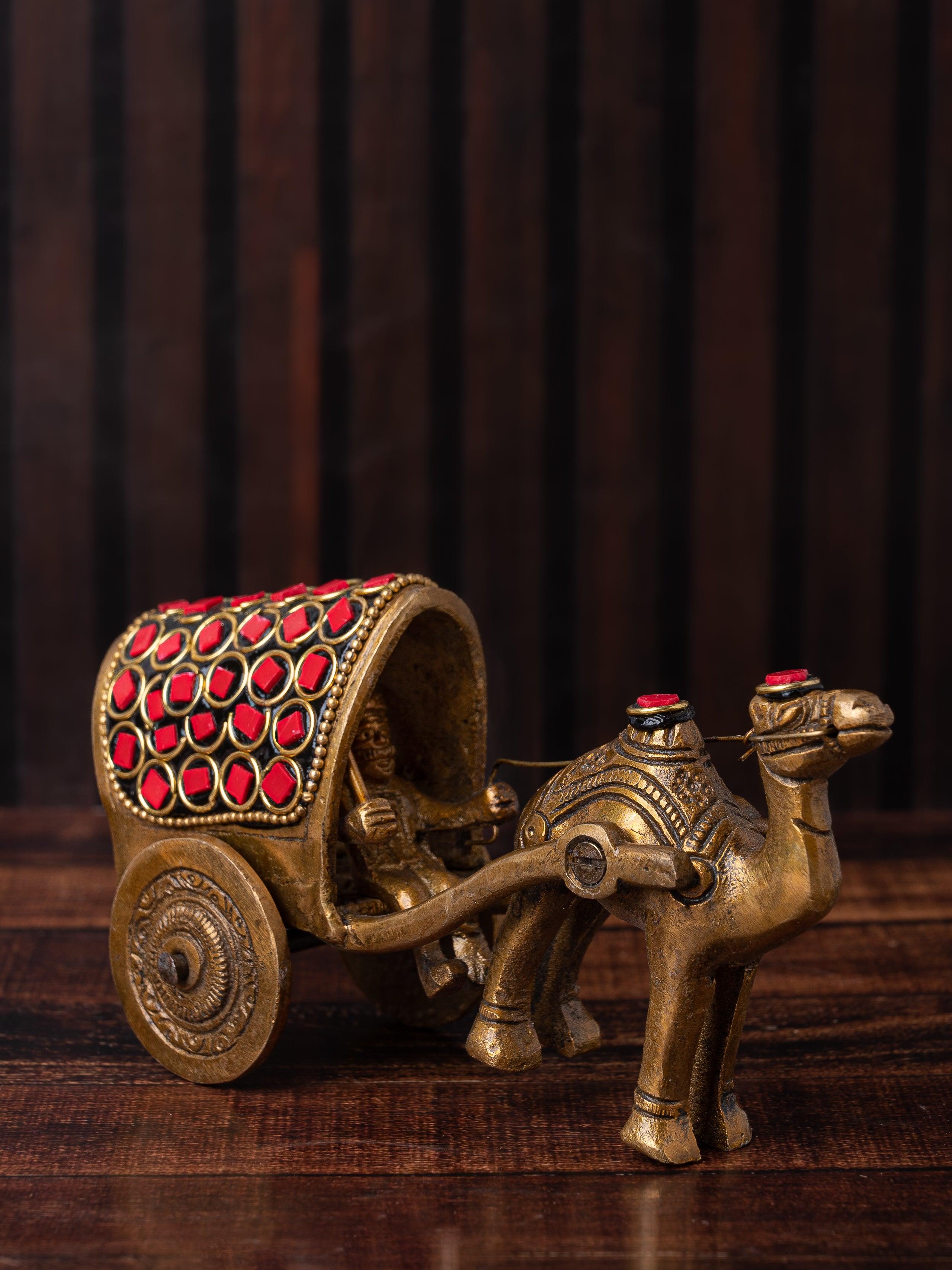 A beautiful artifact to adorn your home. The man riding a camel cart is a beautiful depiction of traditional India and it will add a touch of elegance and exclusivity to your home. The intricate design of the cart with red motifs shows dexterous craftsmanship.