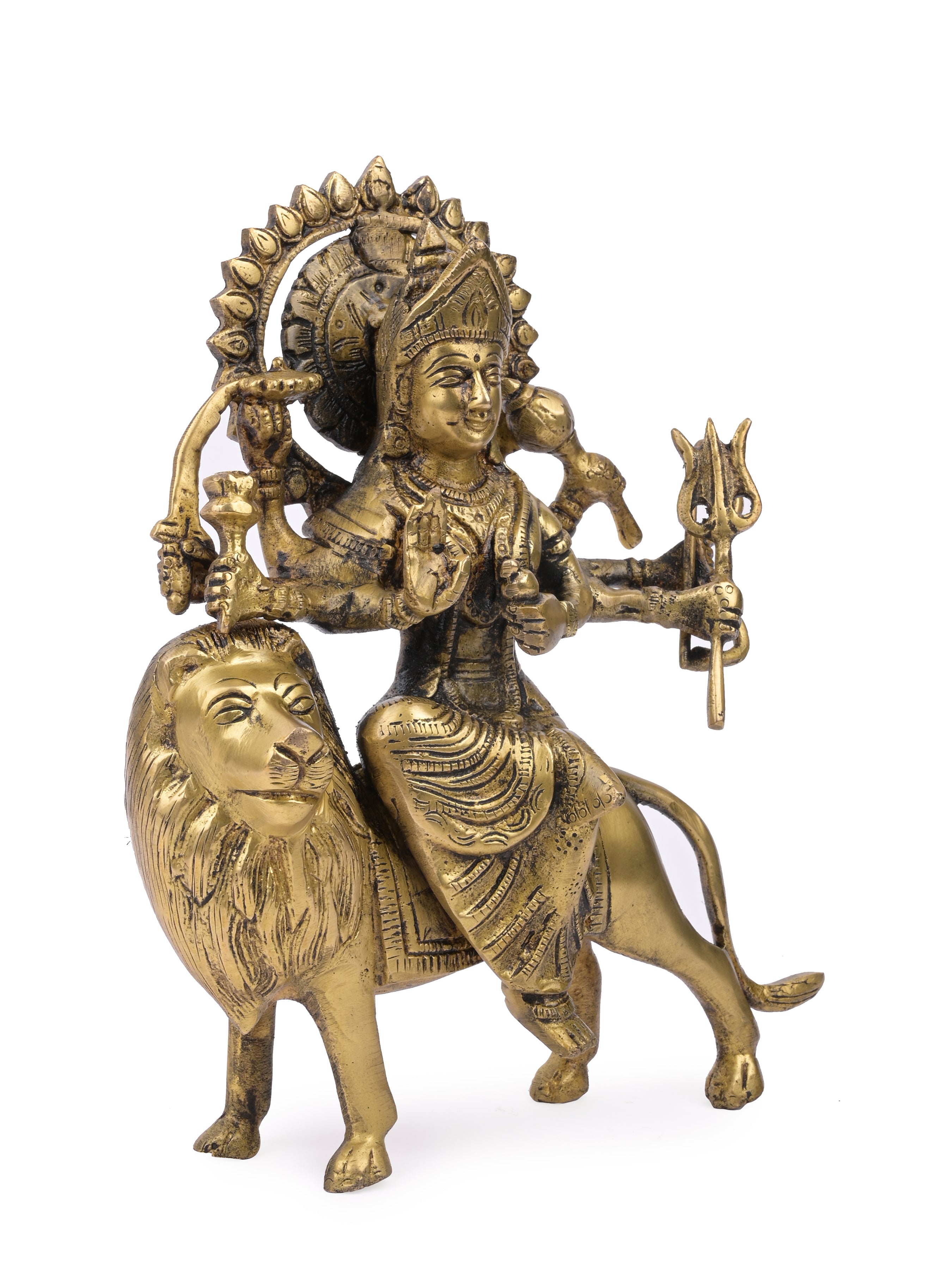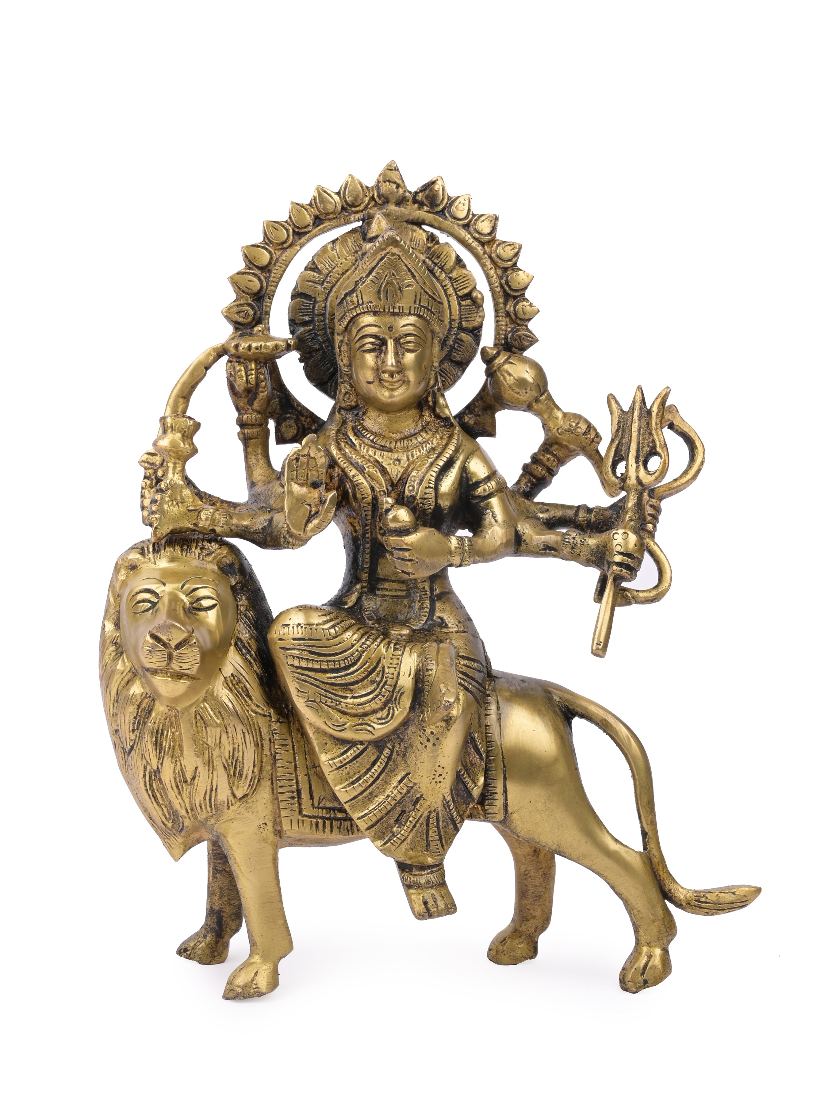 This is a beautifully crafted brass idol of Maa Durga. In this Idol, Maa Durga is sitting on a Lion with weapons in all 10 hands. The Idol is handcrafted on solid brass and has a antique finish. The size is suitable for home worship and can be established during any auspicious date.