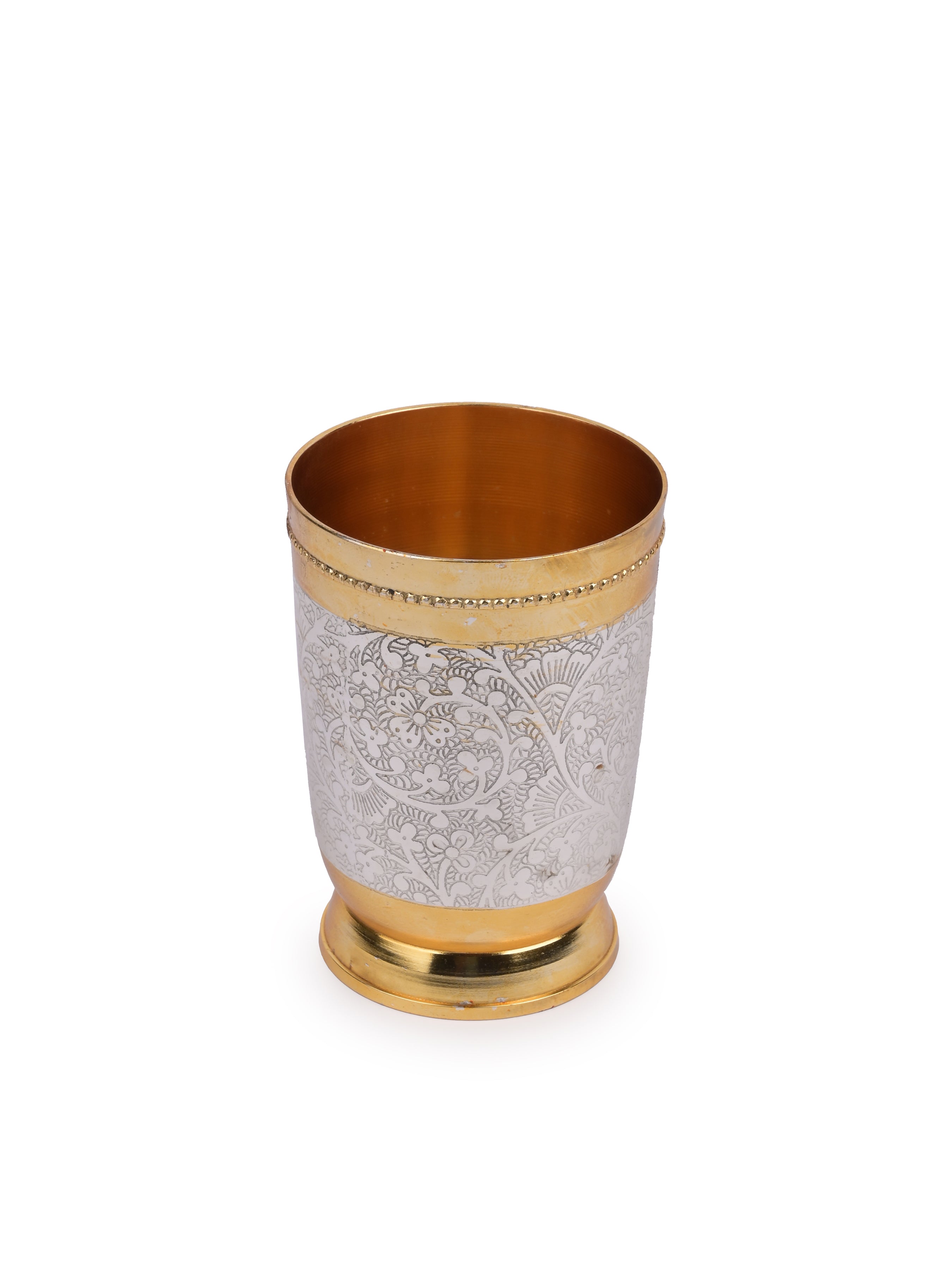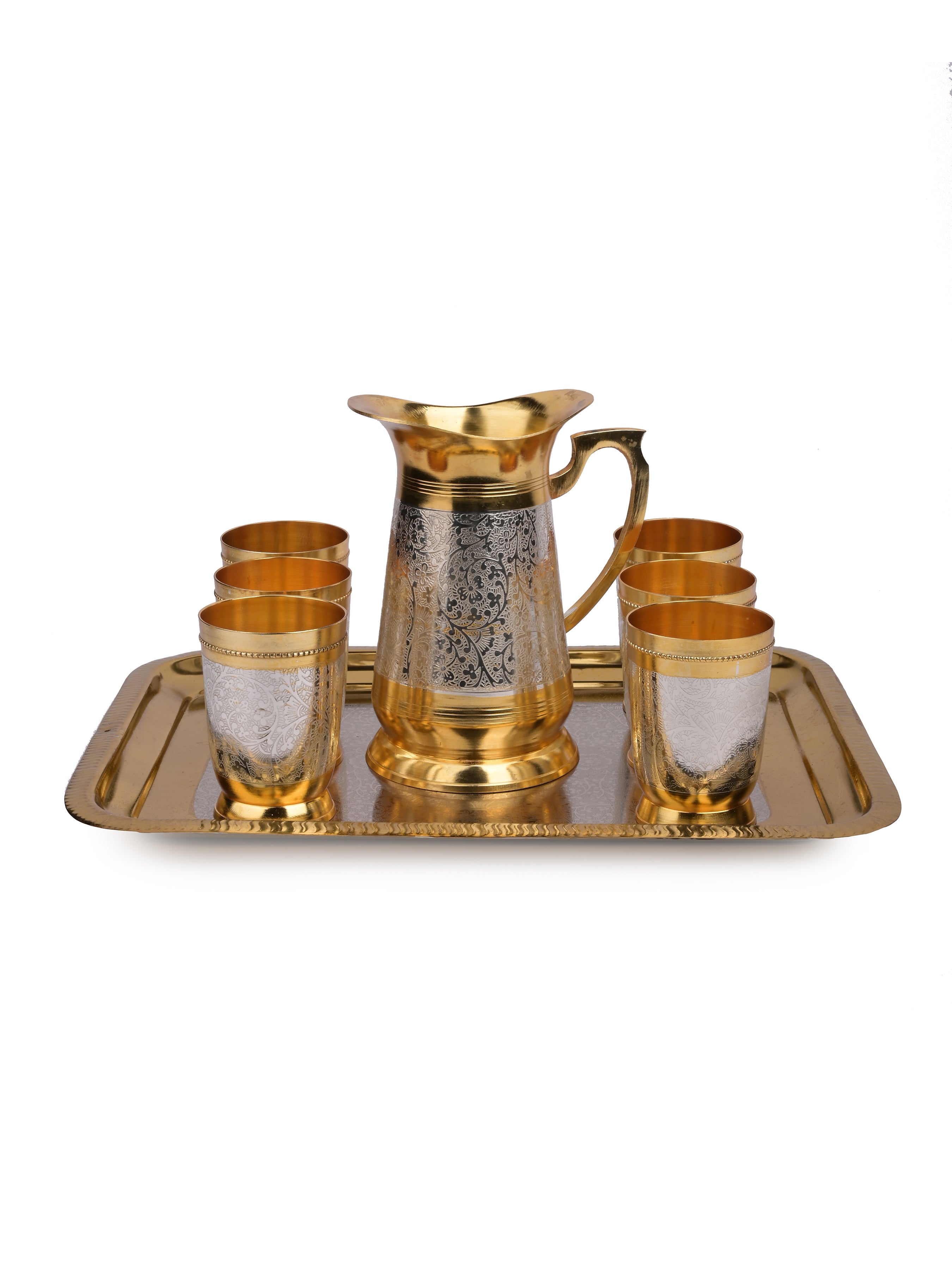 A highly decorative and elegant brass jug with six glasses and one tray creates the best set of tableware for your dining table. Every piece in the set has an elaborate striking pattern, our artisans have maintained consistency while designing the whole set. Engraved design with gold and silver color gives you royal vibes while having lunch or dinner. Entertain your guests with this pure gold brass drinkware set.