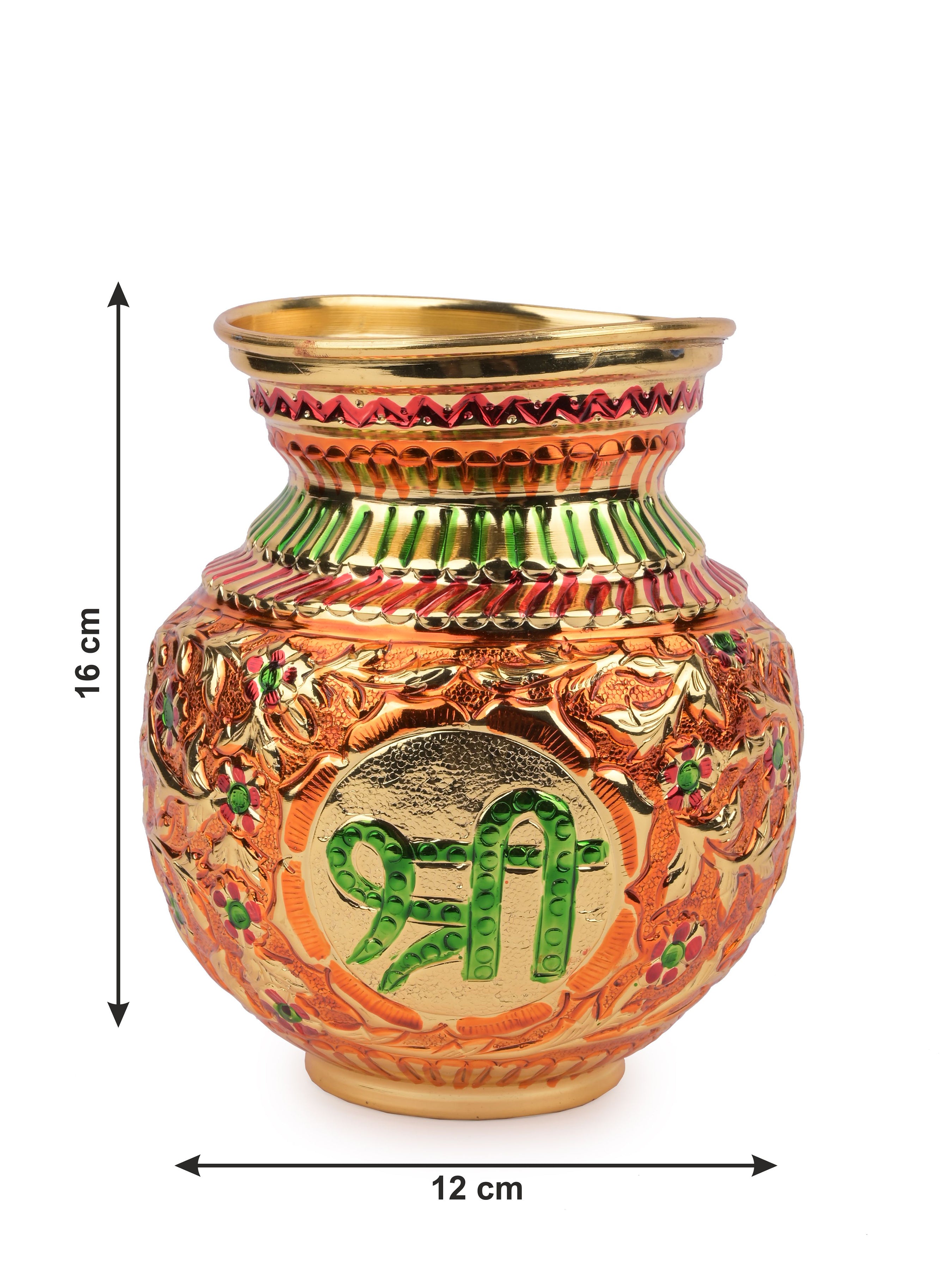 One of the most common puja accessory is kalash or lota. Very interestingly hand crafted on a brass sheet and then painted with red and green color to make this kalash look really unique. "Shri" is written in hindi alphabet which makes it more divine. A must include for your puja room.