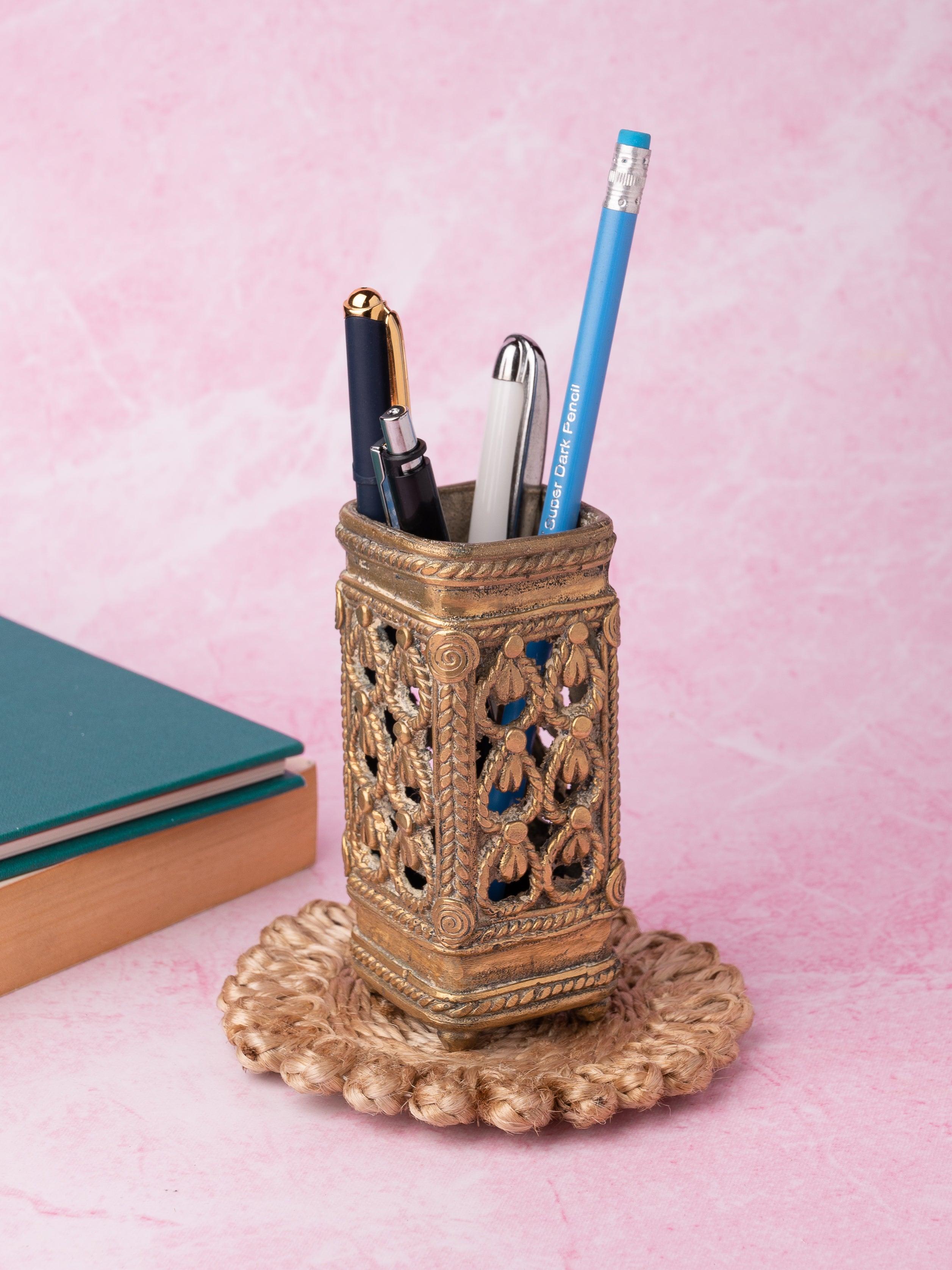 Dokra Art Square Shaped Pen / Pencil Stand, Desk Accessory - 4 inches height