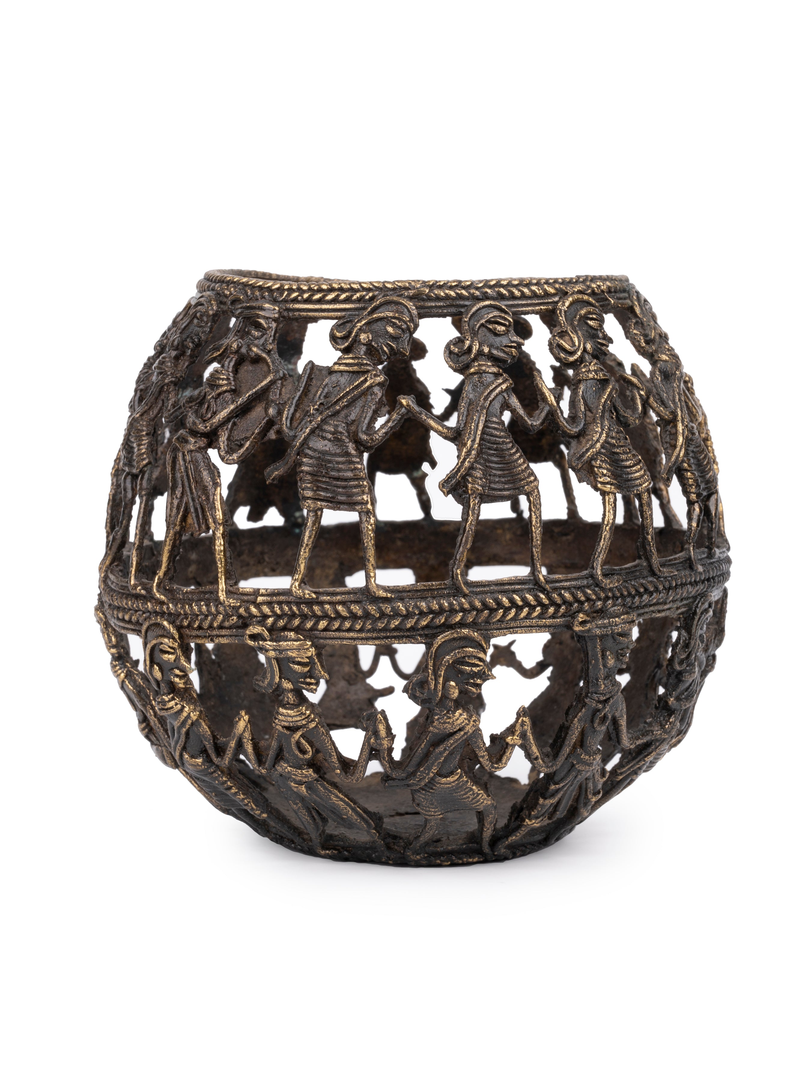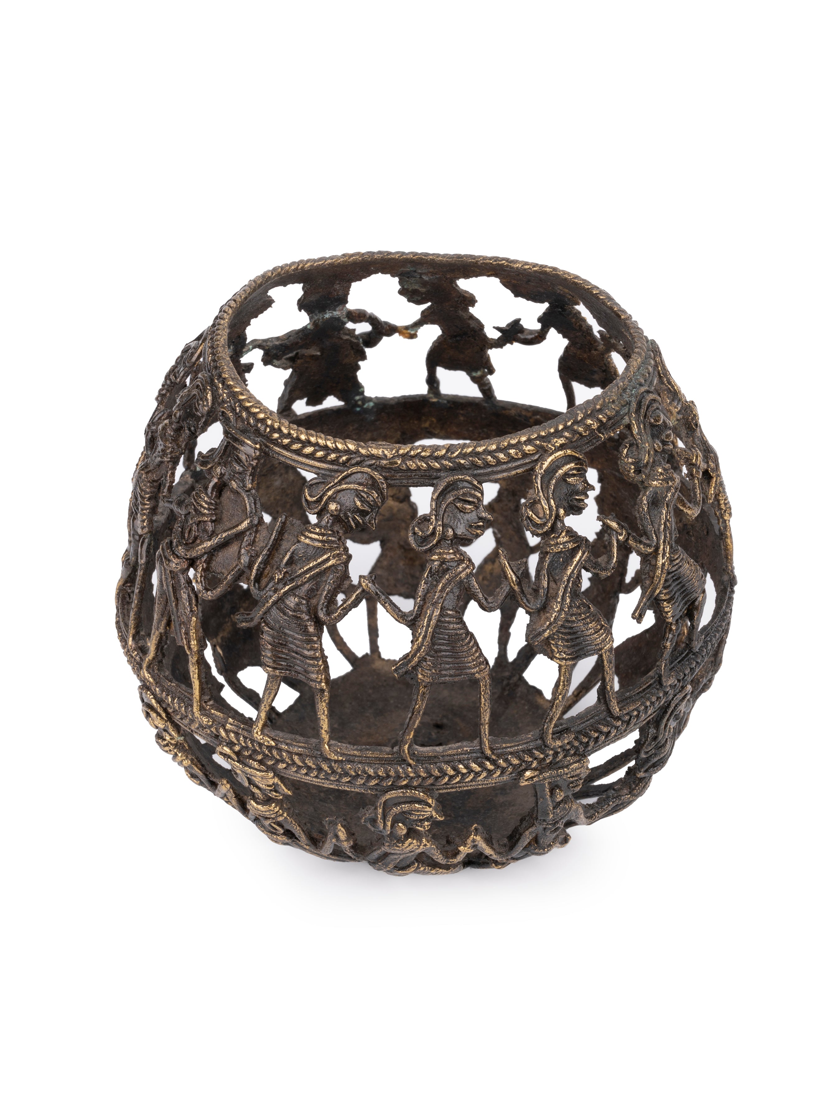 Enjoy the mesmerizing beauty of this lamp as it spreads its shadows across the walls of your bedroom once a scented candle or a T light candle is placed inside. Made of brass with antique finish, you can easily move it from one place to another to change the ambience and mood of the room.