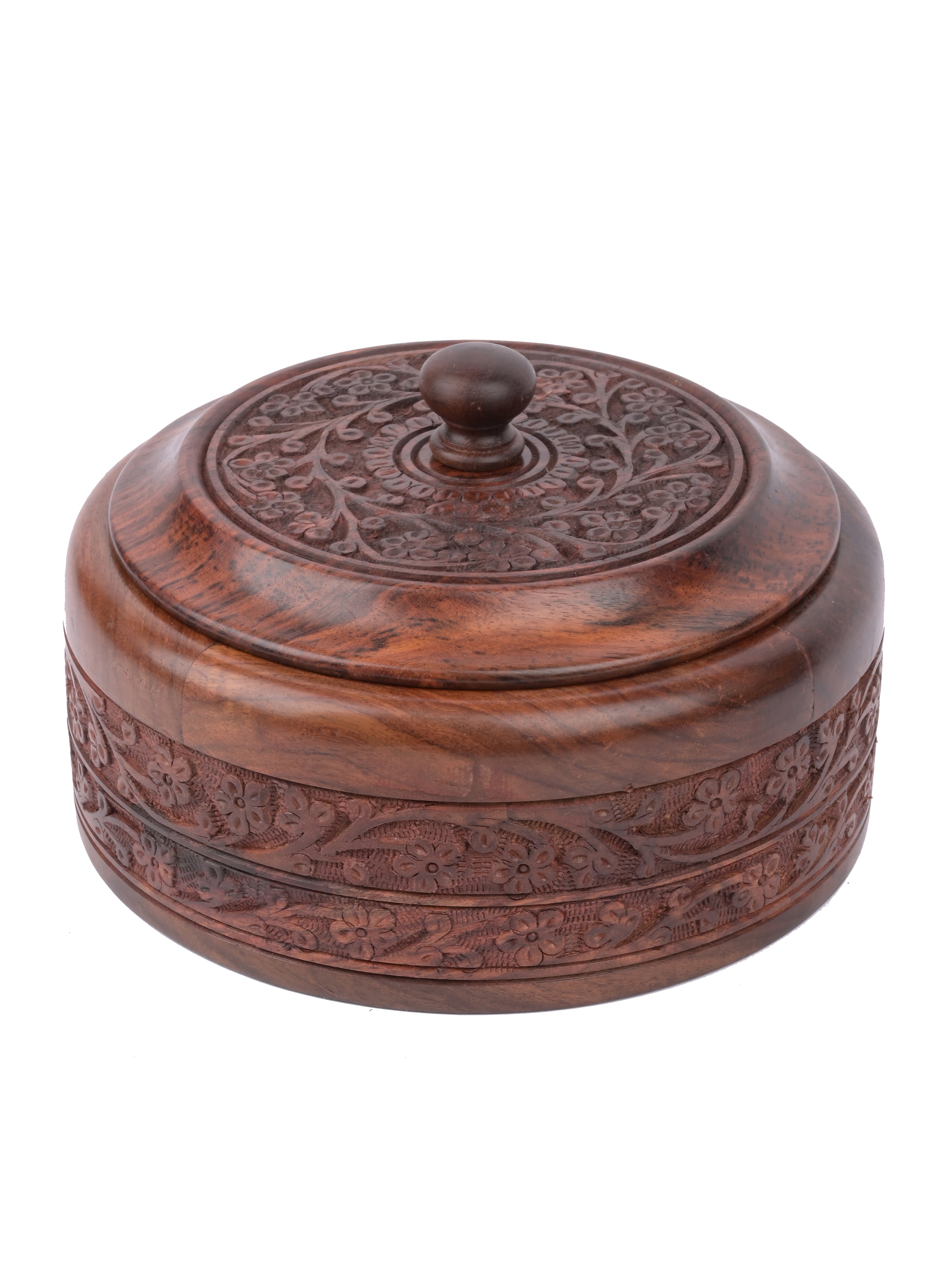 Floral motif handcrafted chapati box made from natural shisham wood. That makes it a stylish addition to your kitchen, dining room or party hosting tableware set.
